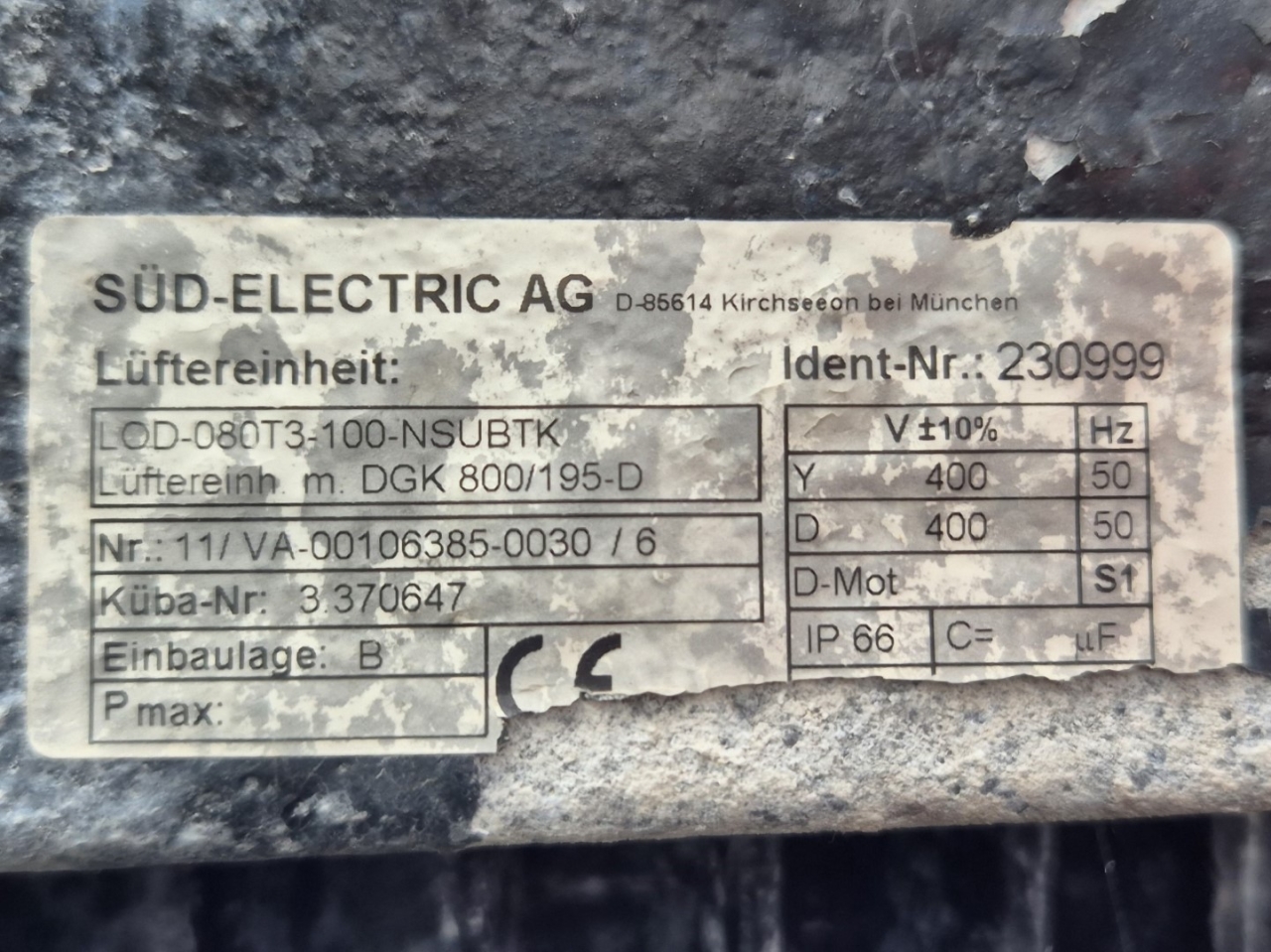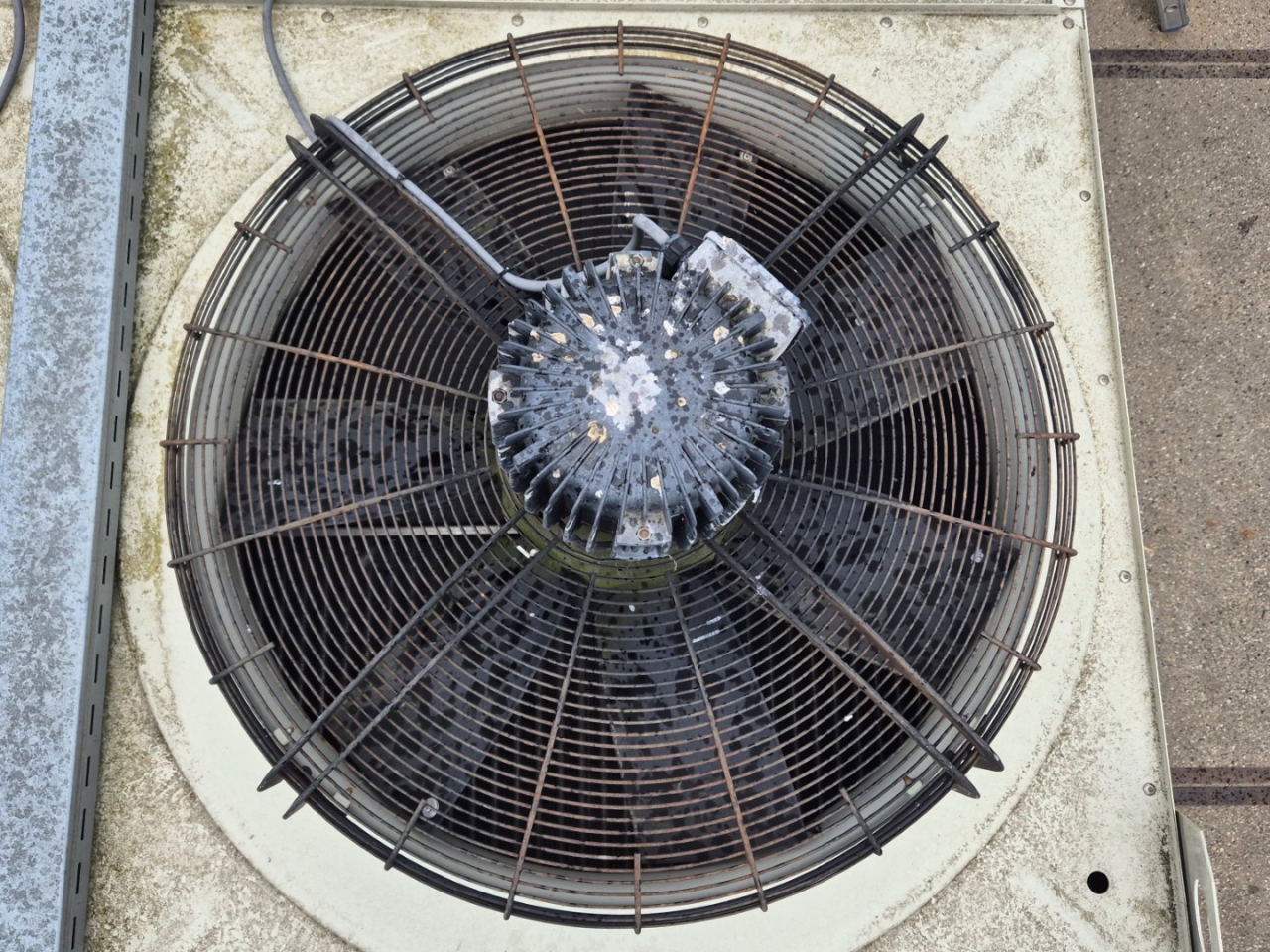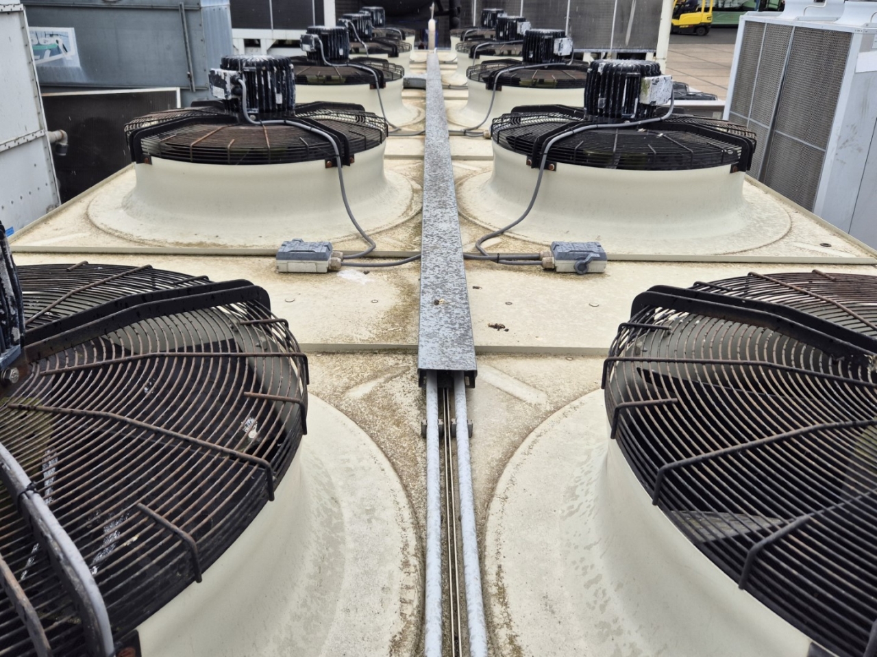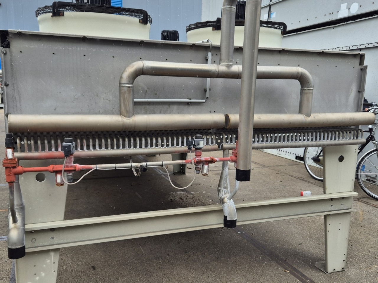 Gebrauchter luftgekühlter NH3-Kondensator (Ammoniak) vom Typ Goedhart INAL-G-N41080D-B-6p(D). Komplett mit 10 Süd-Electric LOD-080T3-100-NSUBTK-Ventilatoren – 50 Hz – 2,4/1,5 kW – 900/650 U/min – Durchmesser 800 mm und einem Gesamtluftstrom von 210.120 m³/h.