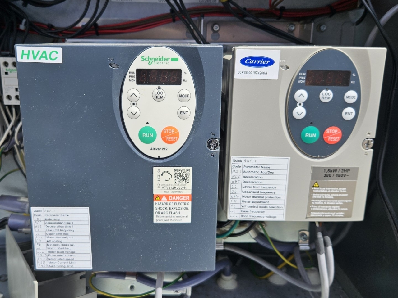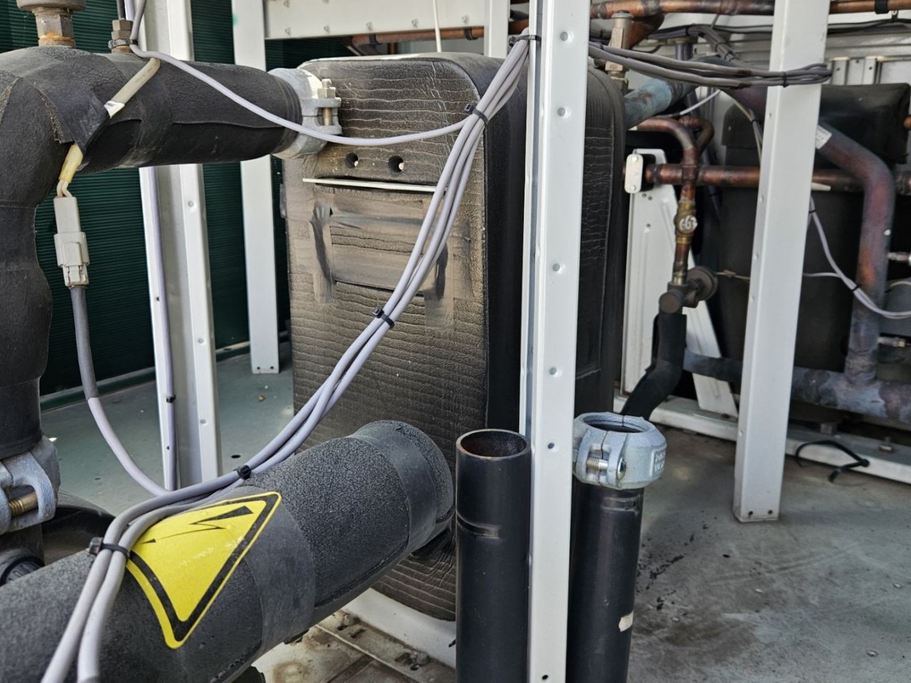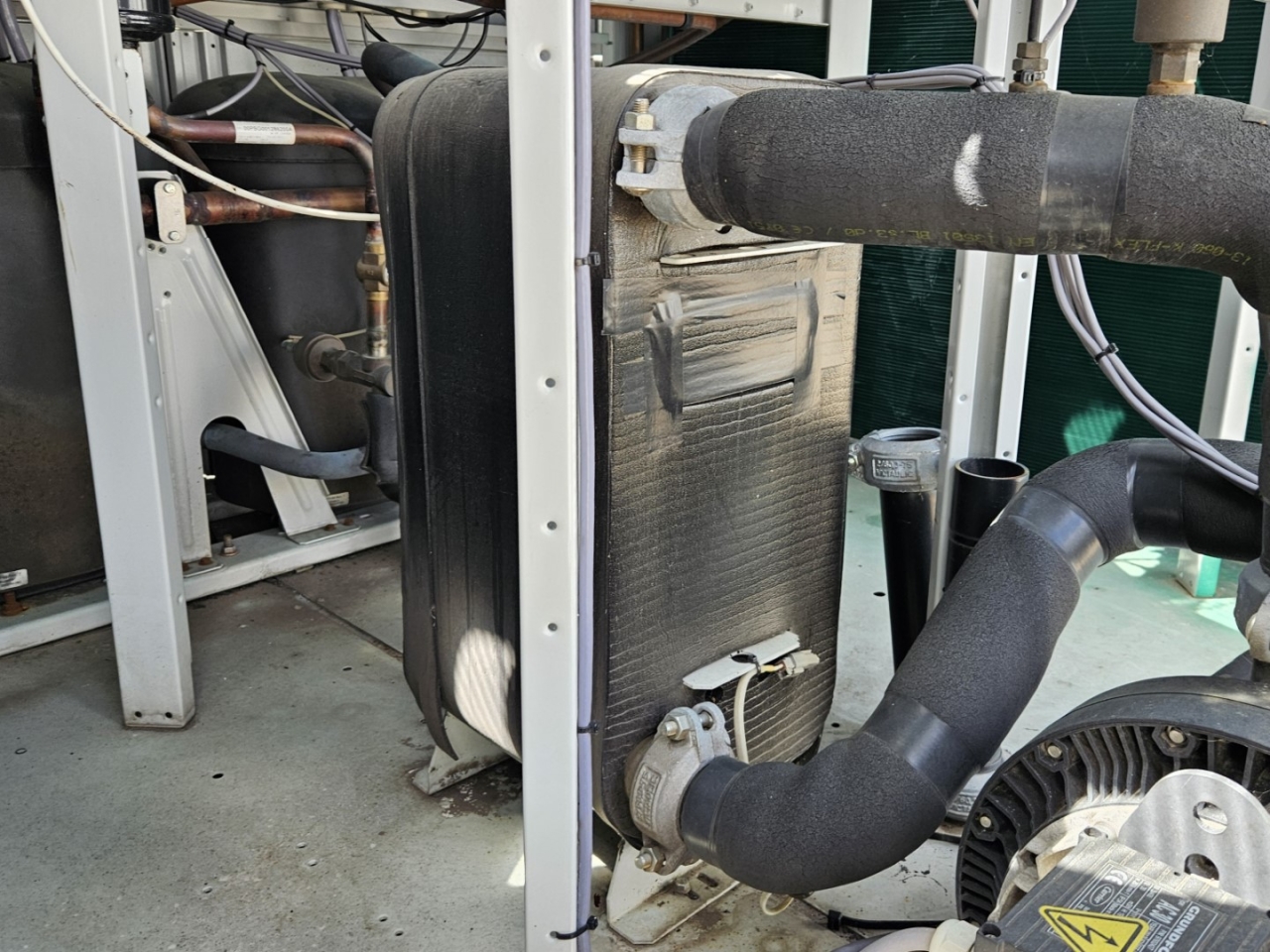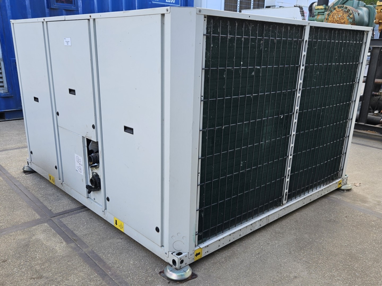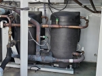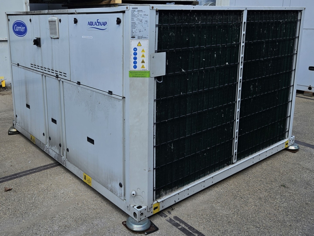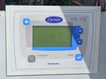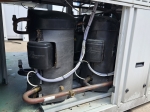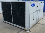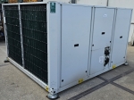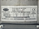Gebrauchter luftgekühlter Kältemaschinentyp Carrier 30 RBS 120 mit Kältemittel R410A. Komplett mit 3 Copeland ZP182KQE-TFD-604 Scroll-Kompressoren, Kondensator mit 2 Carrier PM 100–110 mm Lüftern – 50 Hz – 0,53/0,18 kW – 720/500 U/min, gelötetem Wärmetauscher als Verdampfer, Wasserpumpe, Ausdehnungsgefäß und einem Schaltschrank mit einem Carrier Pro-Dialog+ Controller und Frequenzumrichtern.