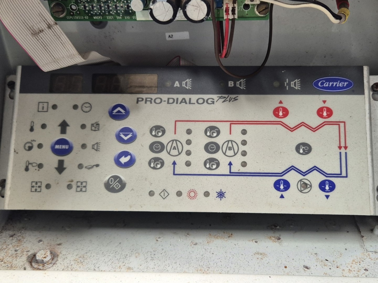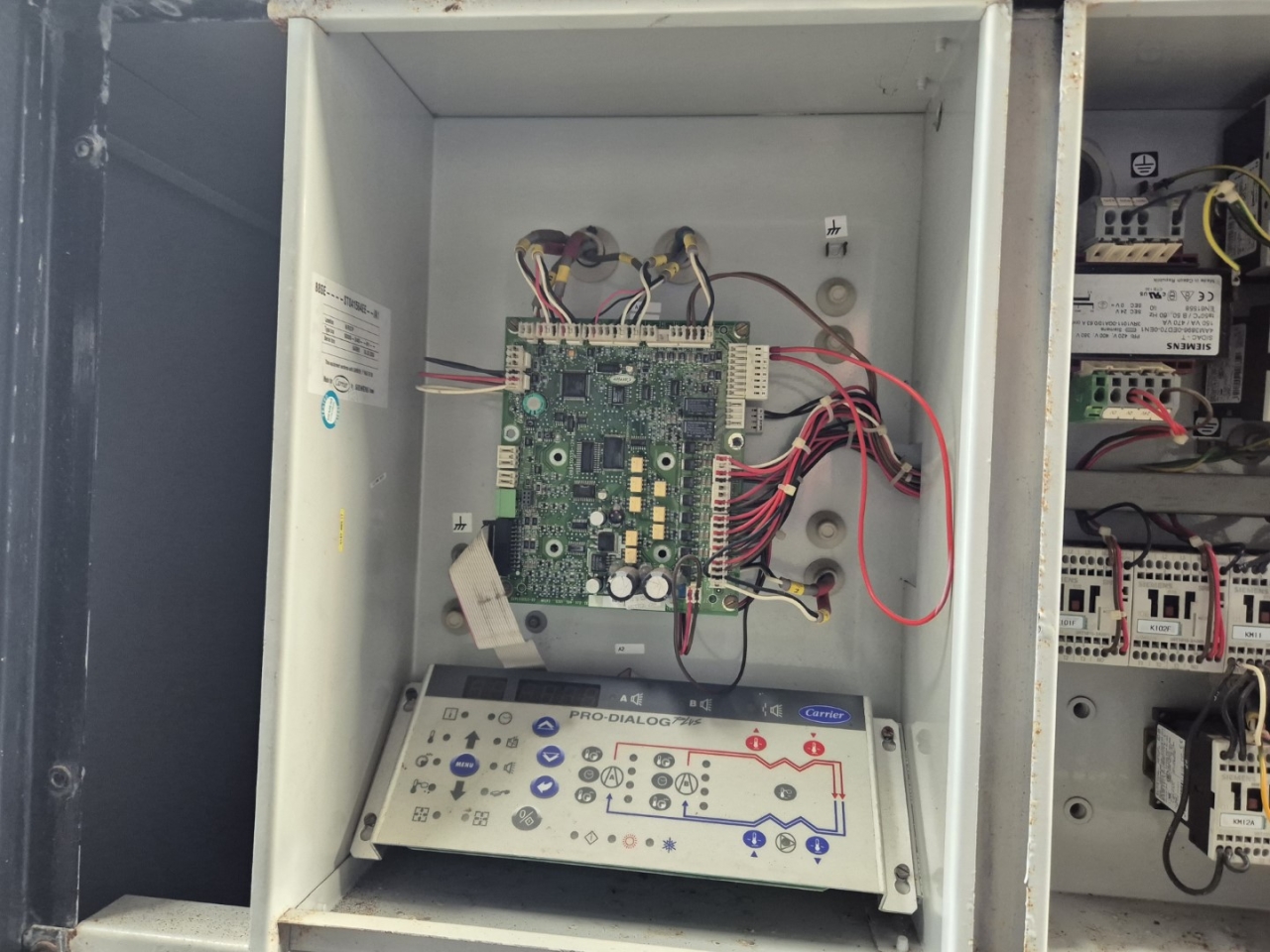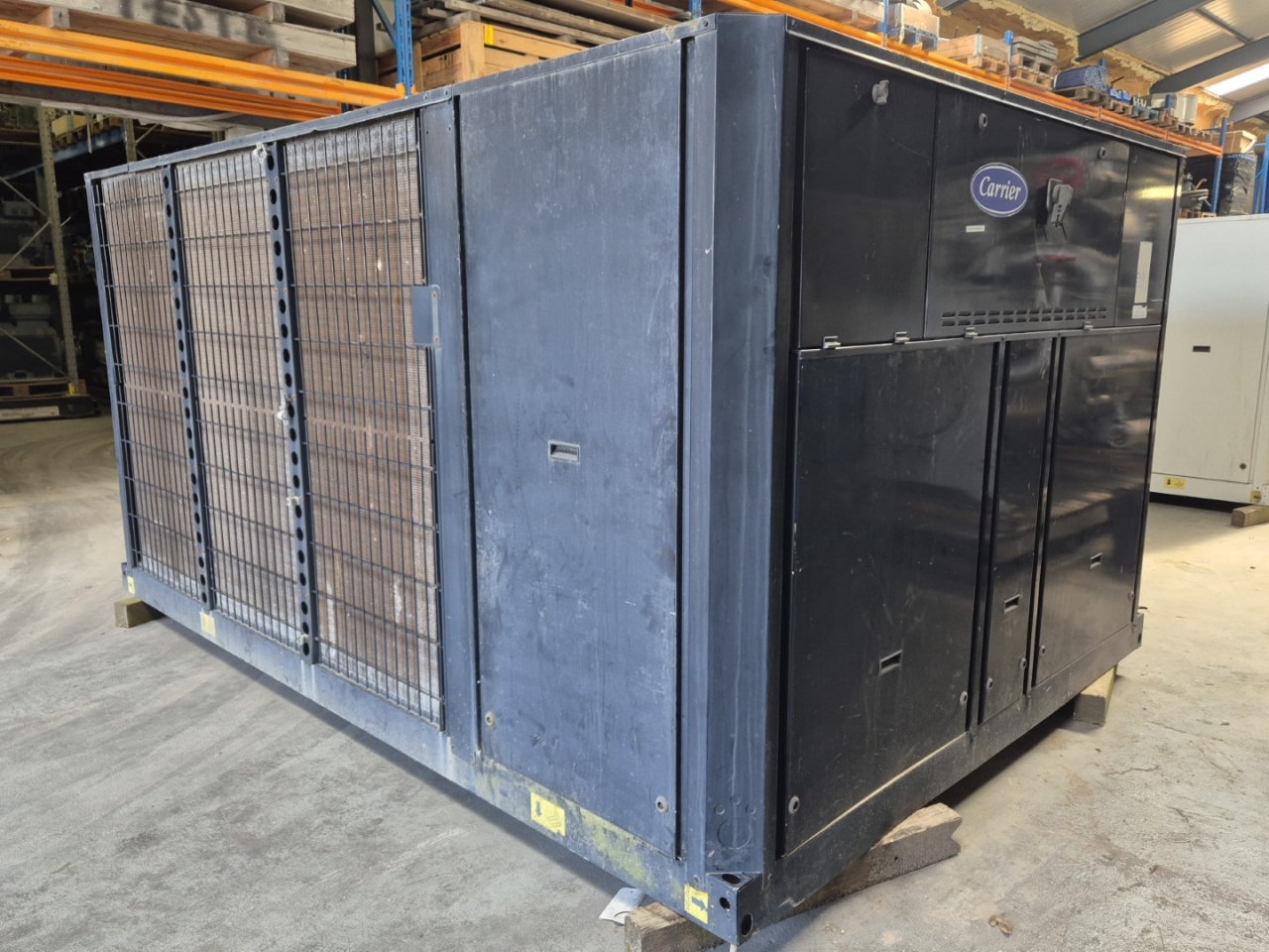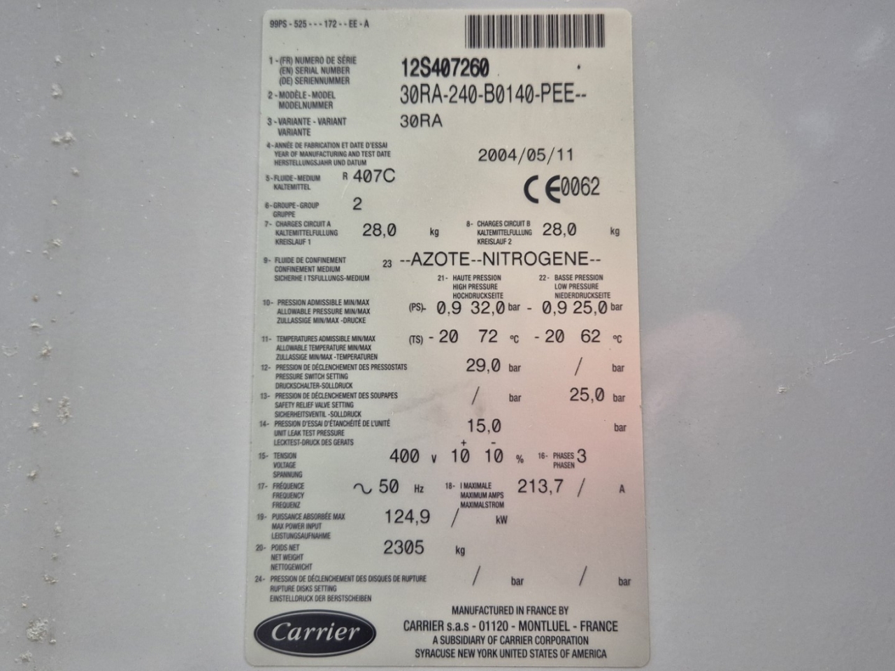 Gebrauchter luftgekühlter Kaltwassersatz Carrier 30 RA 240 mit R407C. Komplett mit 6 Performer SZ185W4PC-Scrollverdichtern, Kondensator mit 4 Lüftern, die einen Luftstrom von 75.268 m³/h erzeugen, gelötetem Wärmetauscher als Verdampfer, Wilo-Wasserpumpe, Ausdehnungsgefäß, Danfoss FC-102P7K5T4E55H1-Frequenzregler und einem Schaltschrank mit einem Carrier Pro-Dialog Plus-Controller.