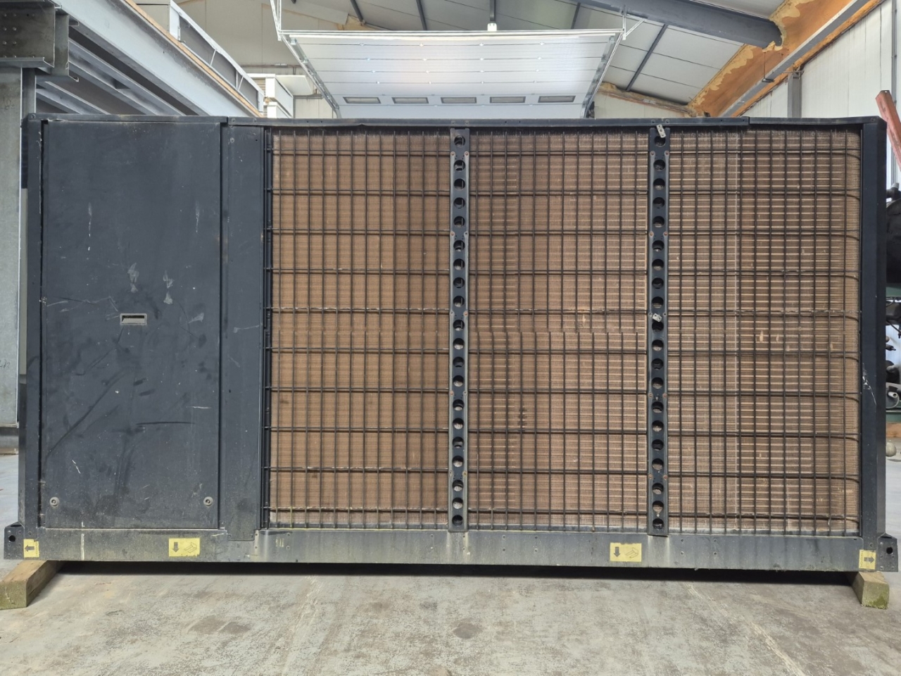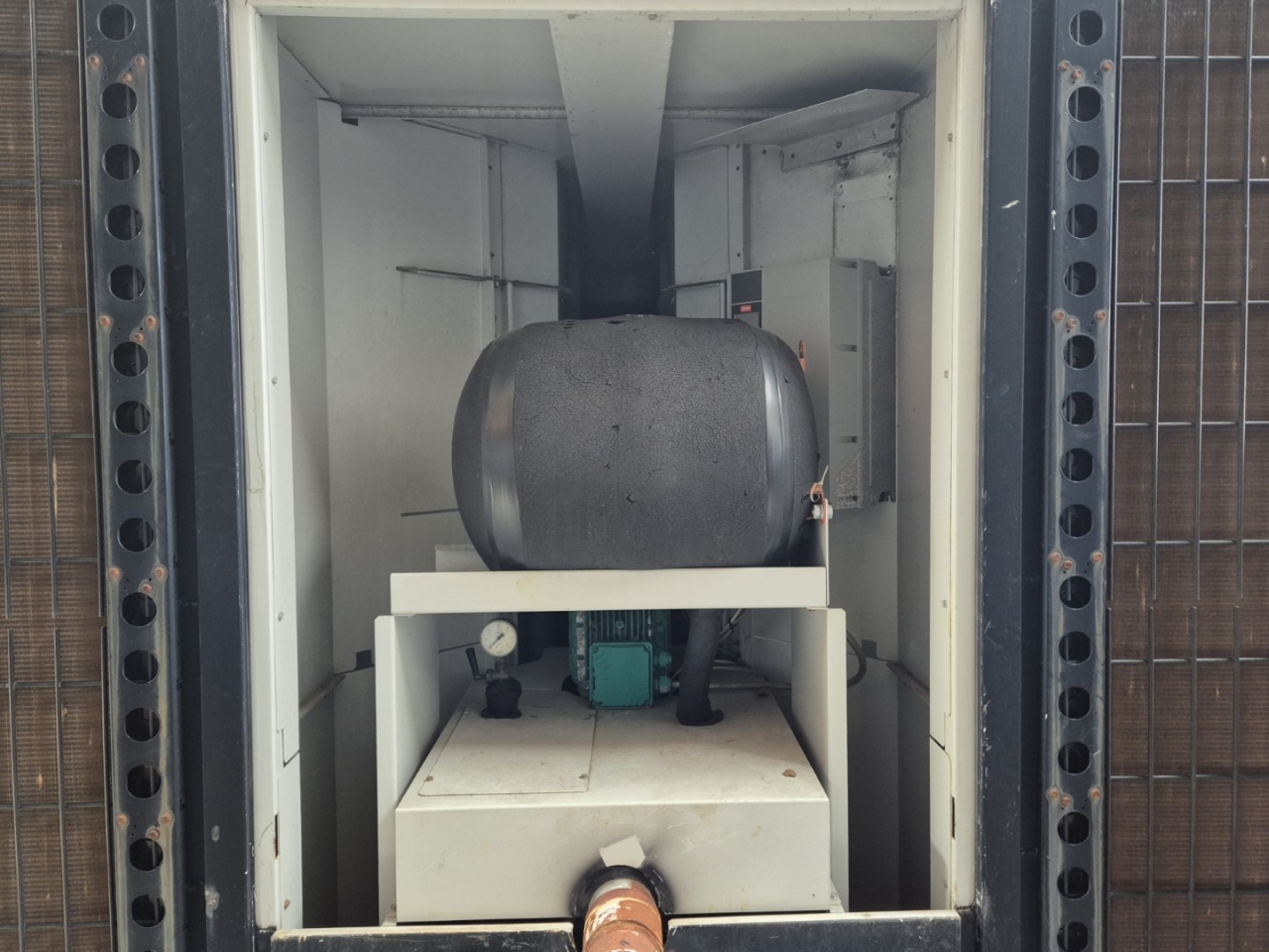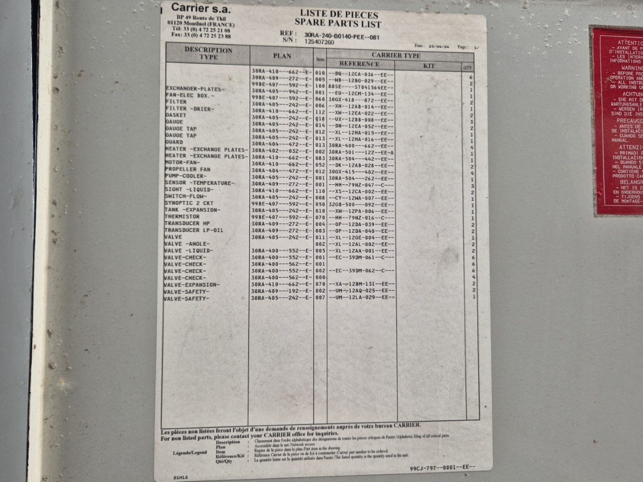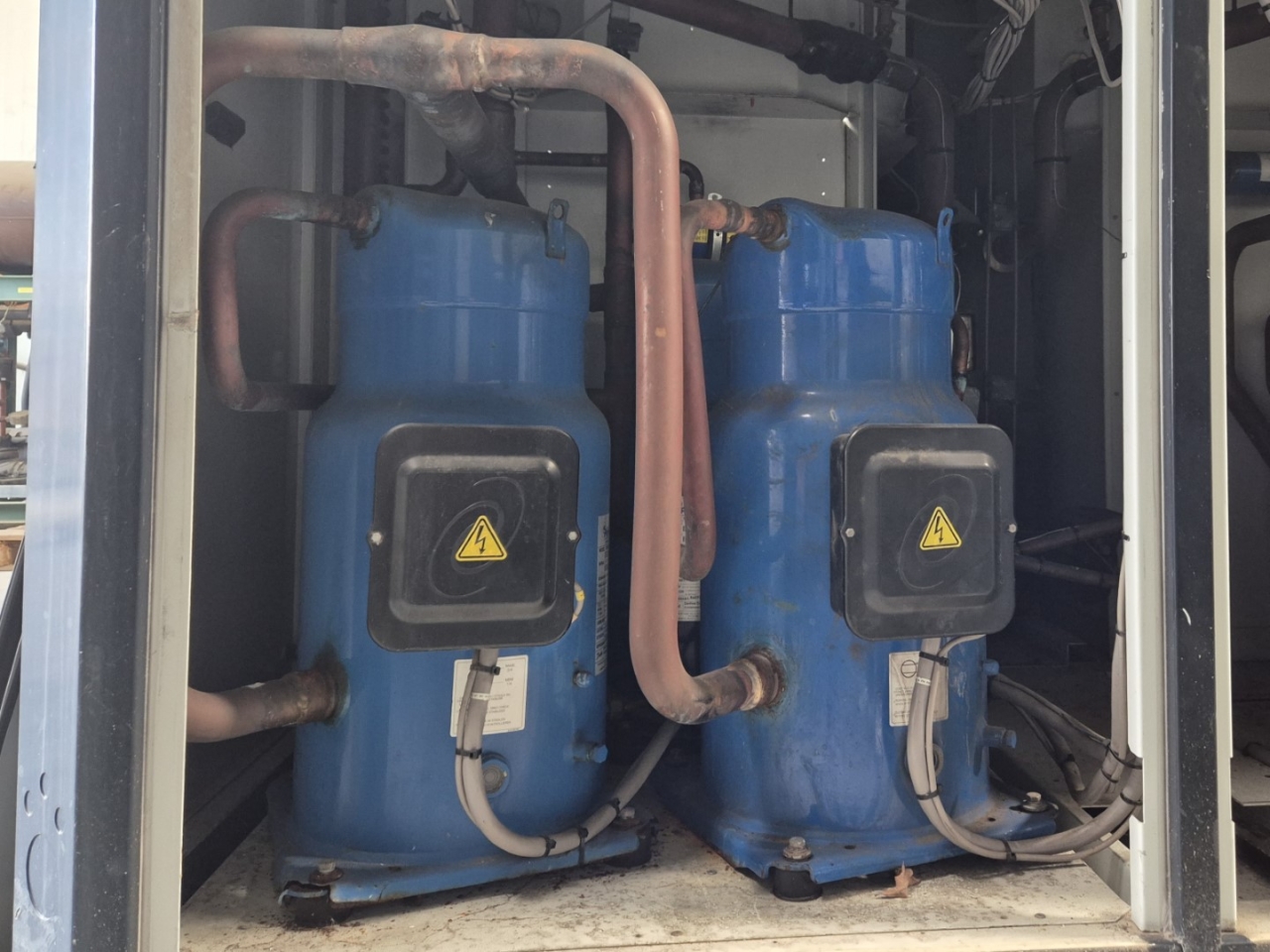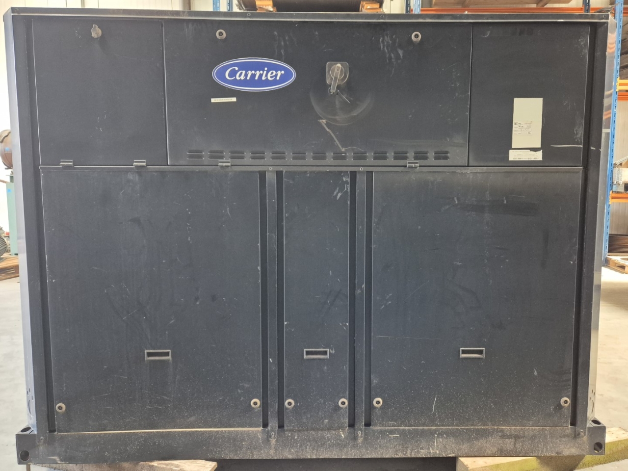 Gebrauchter luftgekühlter Kaltwassersatz Carrier 30 RA 240 mit R407C. Komplett mit 6 Performer SZ185W4PC-Scrollverdichtern, Kondensator mit 4 Lüftern, die einen Luftstrom von 75.268 m³/h erzeugen, gelötetem Wärmetauscher als Verdampfer, Wilo-Wasserpumpe, Ausdehnungsgefäß, Danfoss FC-102P7K5T4E55H1-Frequenzregler und einem Schaltschrank mit einem Carrier Pro-Dialog Plus-Controller.