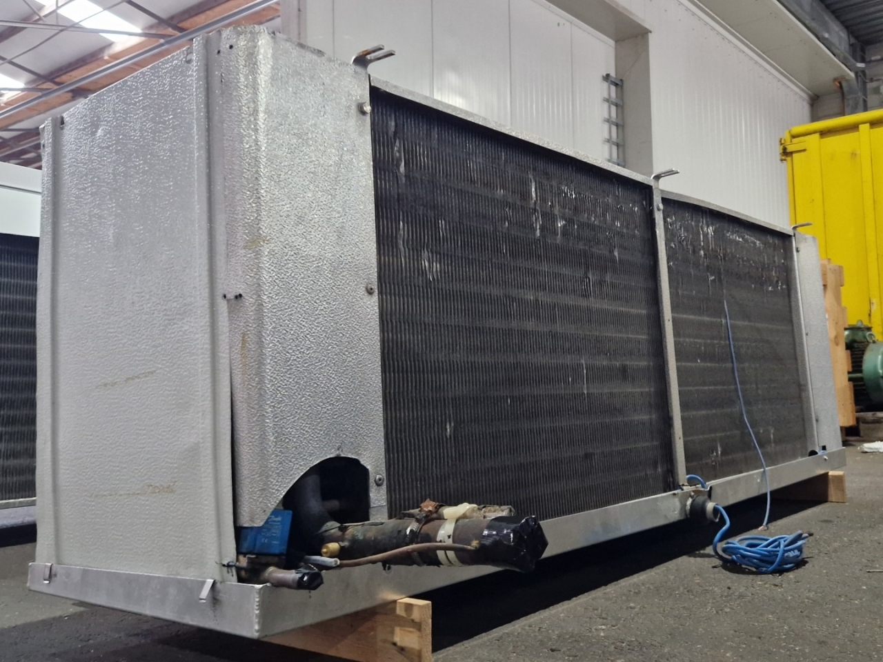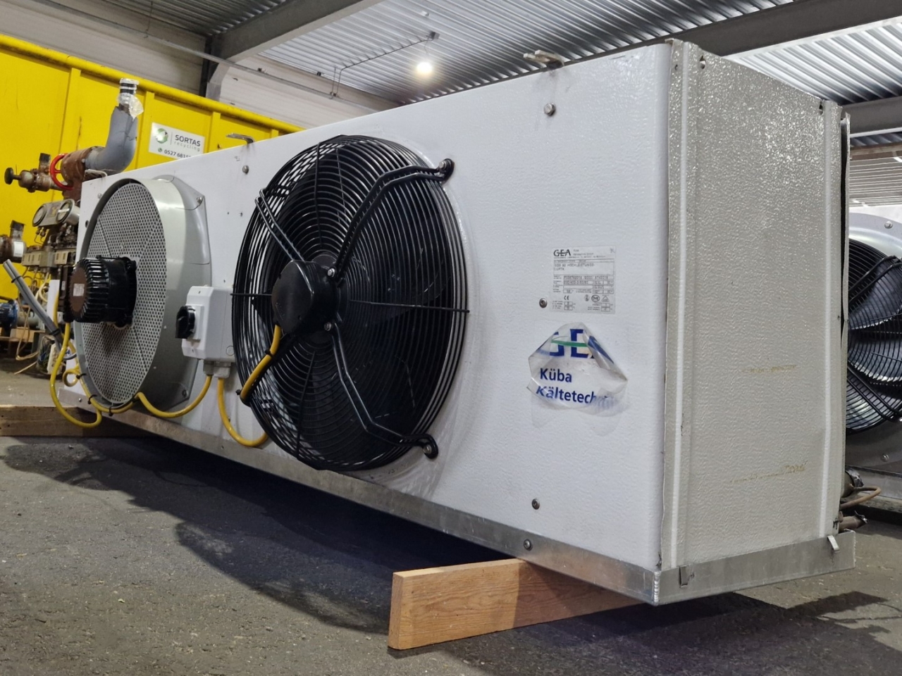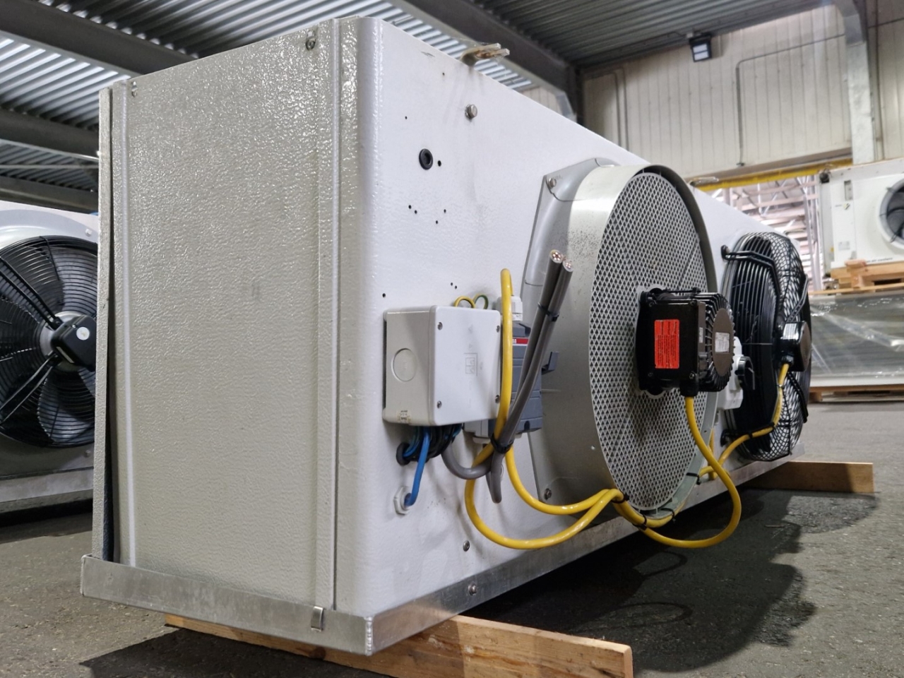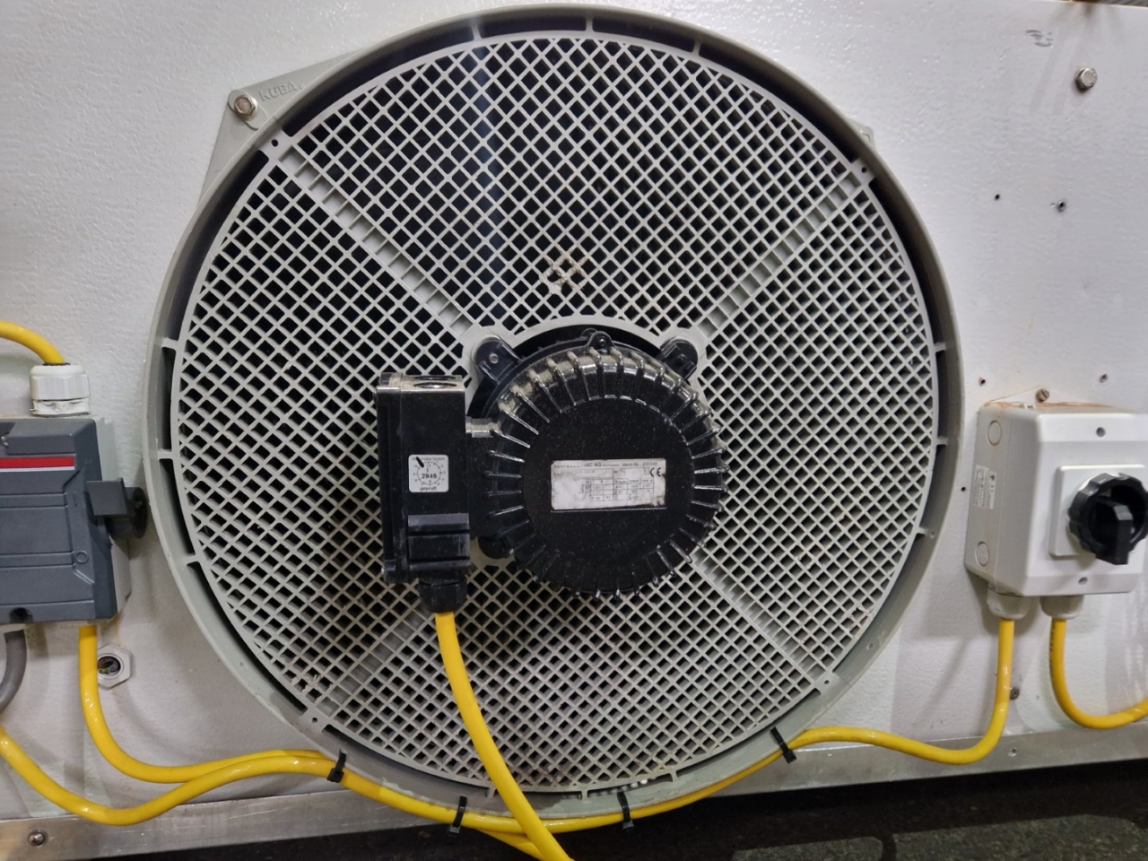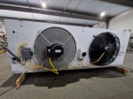 Gebrauchter Kuba SGB 92 Freon-Verdampfer mit elektrischer Abtauung. Komplett mit 2 Ventilatoren: 1 x Hidria R13R-5030A-4T2: 50/60 Hz – 0,56/0,41 kW – 0,89/0,60 kW – 1380/1170 – 1570/1140 U/min und 1 x Sud-Electric MDA-P2035-34N-M: 50/60 Hz – 0,45/0,63 kW – 1400/1600 U/min – Durchmesser 500 mm und einem Gesamtluftstrom von 9.060 m³/h.