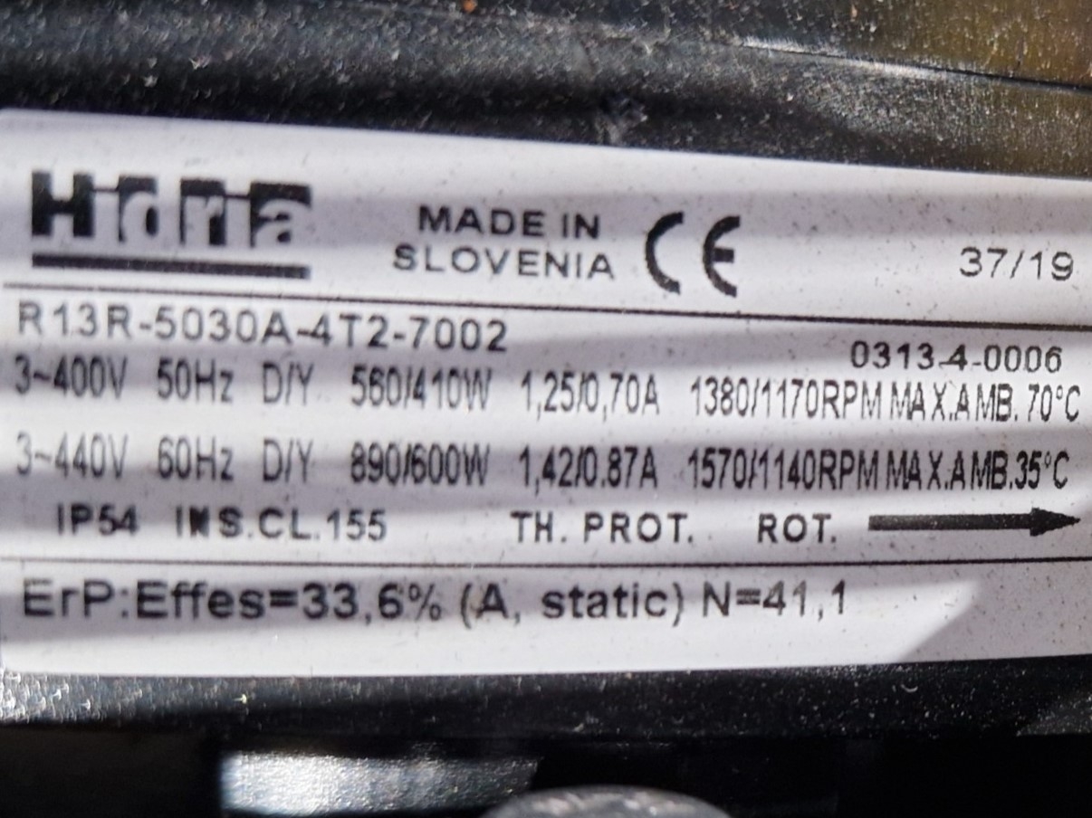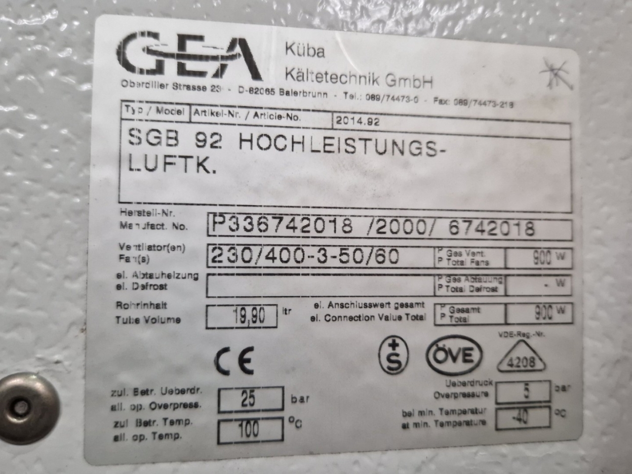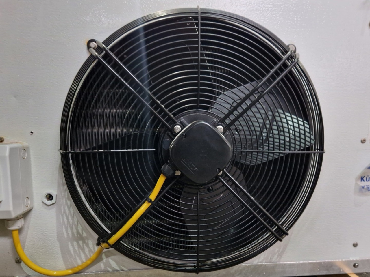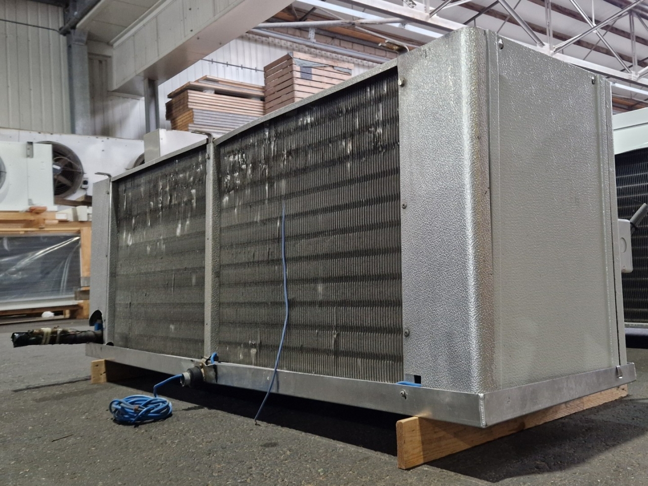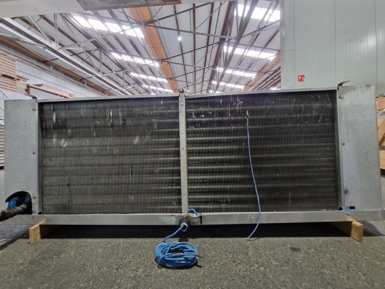 Gebrauchter Kuba SGB 92 Freon-Verdampfer mit elektrischer Abtauung. Komplett mit 2 Ventilatoren: 1 x Hidria R13R-5030A-4T2: 50/60 Hz – 0,56/0,41 kW – 0,89/0,60 kW – 1380/1170 – 1570/1140 U/min und 1 x Sud-Electric MDA-P2035-34N-M: 50/60 Hz – 0,45/0,63 kW – 1400/1600 U/min – Durchmesser 500 mm und einem Gesamtluftstrom von 9.060 m³/h.