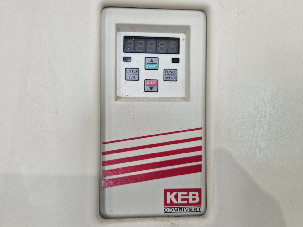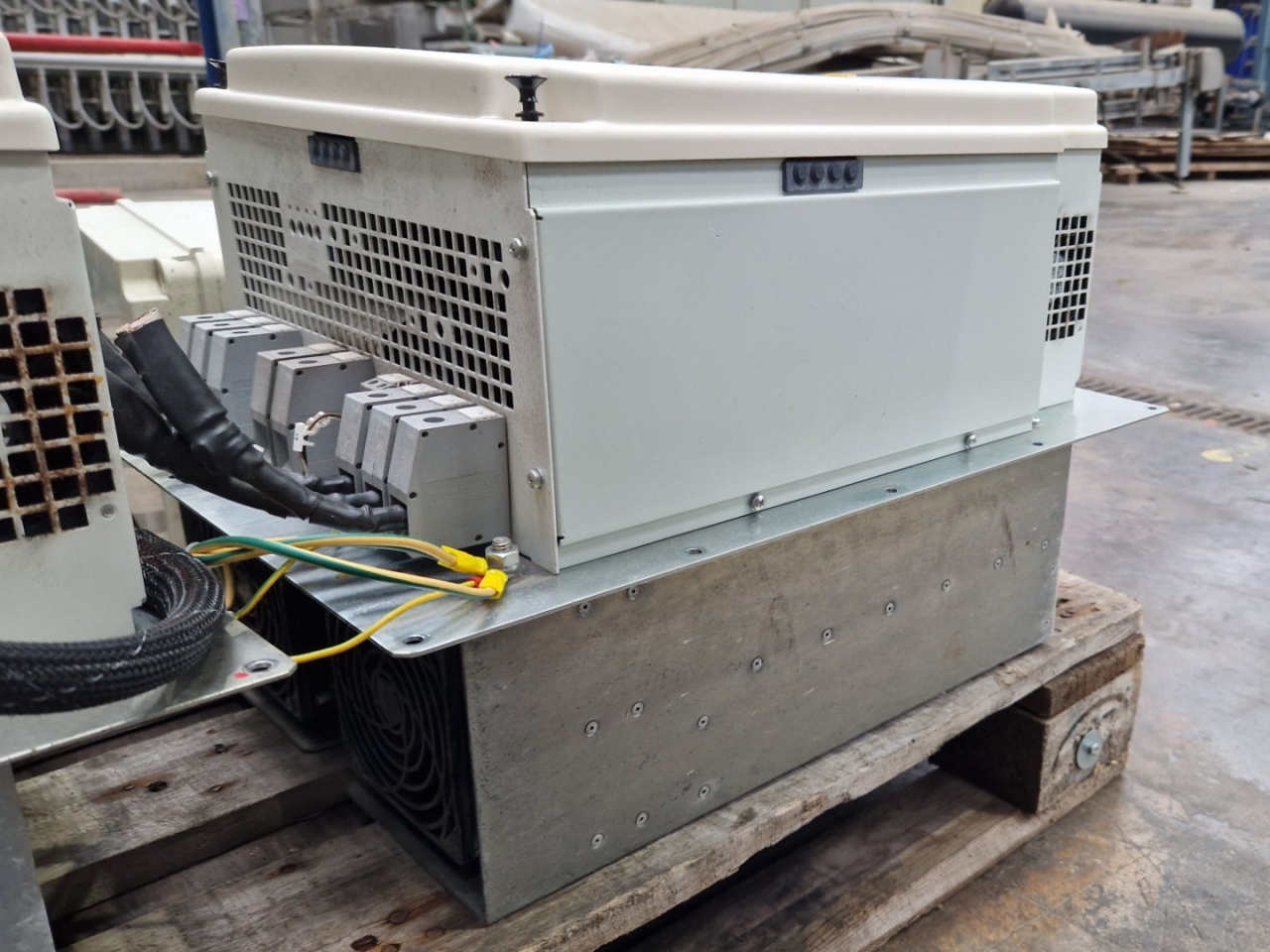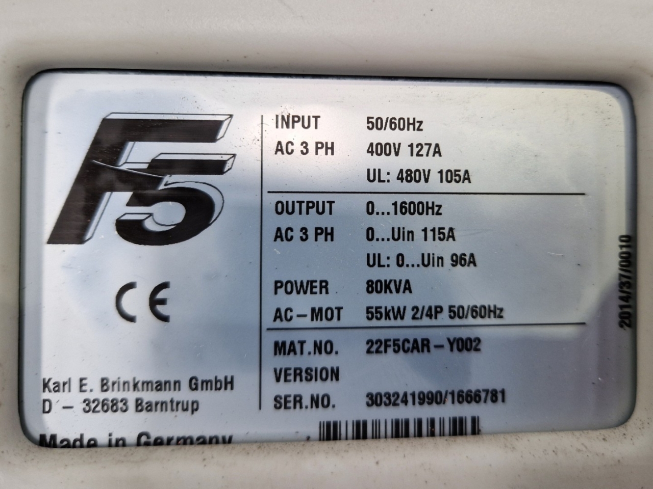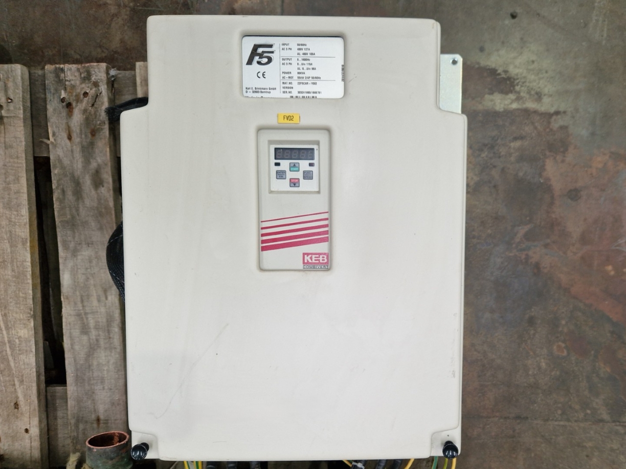 Gebrauchter Frequenzumrichter KEB 22F5CAR-Y002 mit folgenden Spezifikationen: 55 kW. Ausgelegt für 400 V Dreiphaseneingang bei 127 A, mit einem Ausgangsfrequenzbereich von 0 bis 1600 Hz und einem maximalen Ausgangsstrom von 115 A. Geeignet für industrielle Motorsteuerung mit 80 kVA Leistung. Ausgebaut aus einem Daikin-Kühler.