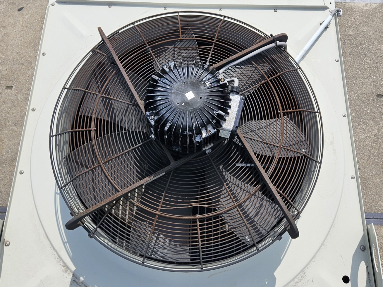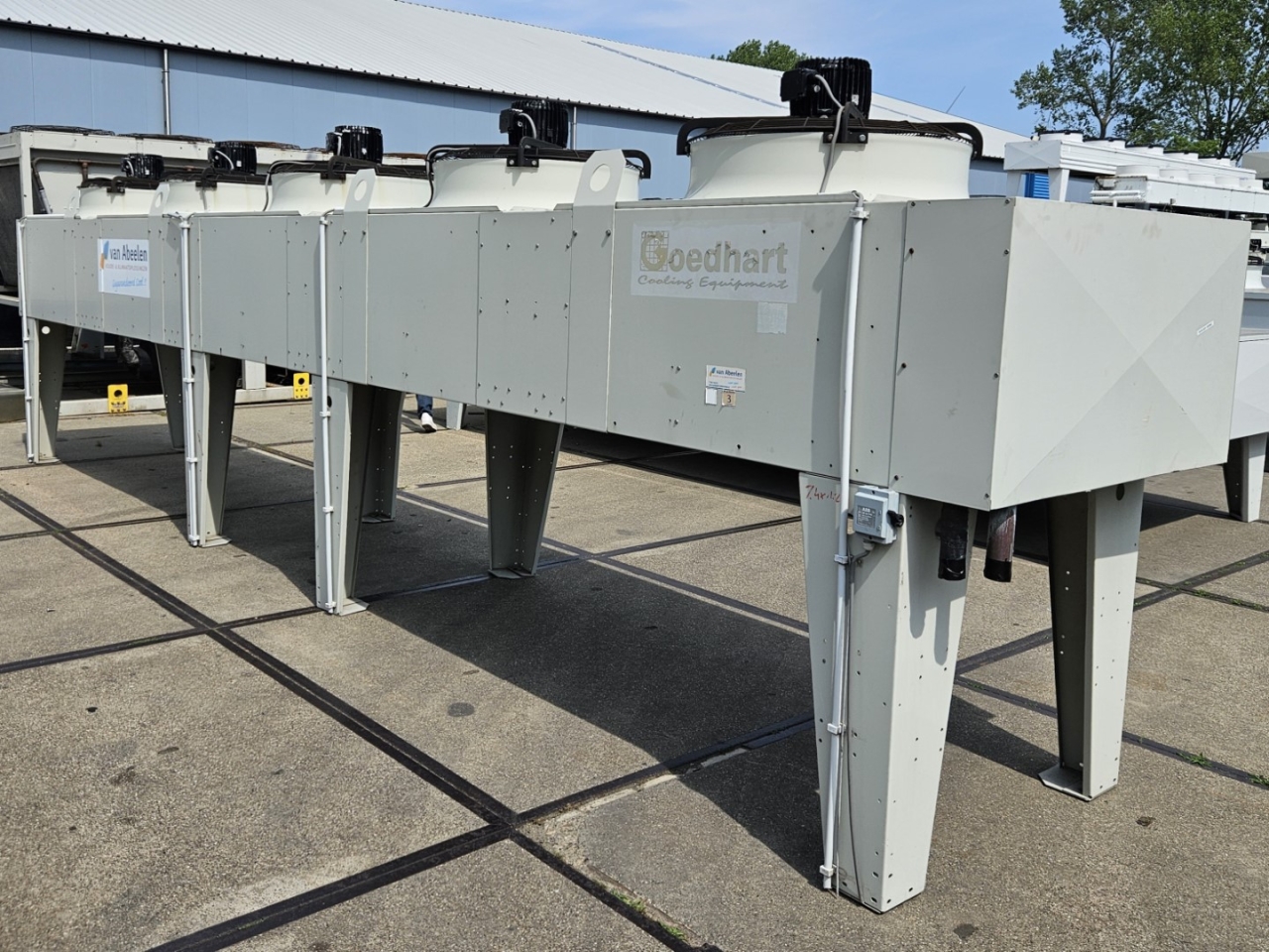 Gebrauchter luftgekühlter Kondensator GEA / Kuba CAV L08-1x5A auf Freon. Komplett mit 5 Süd-Electric MDB-T3100-NAN-N-Lüftern – 50 Hz – 0,9/1,2 kW – 620/720 U/min – Durchmesser 800 mm und einem Gesamtluftstrom von 74.855 m³/h.