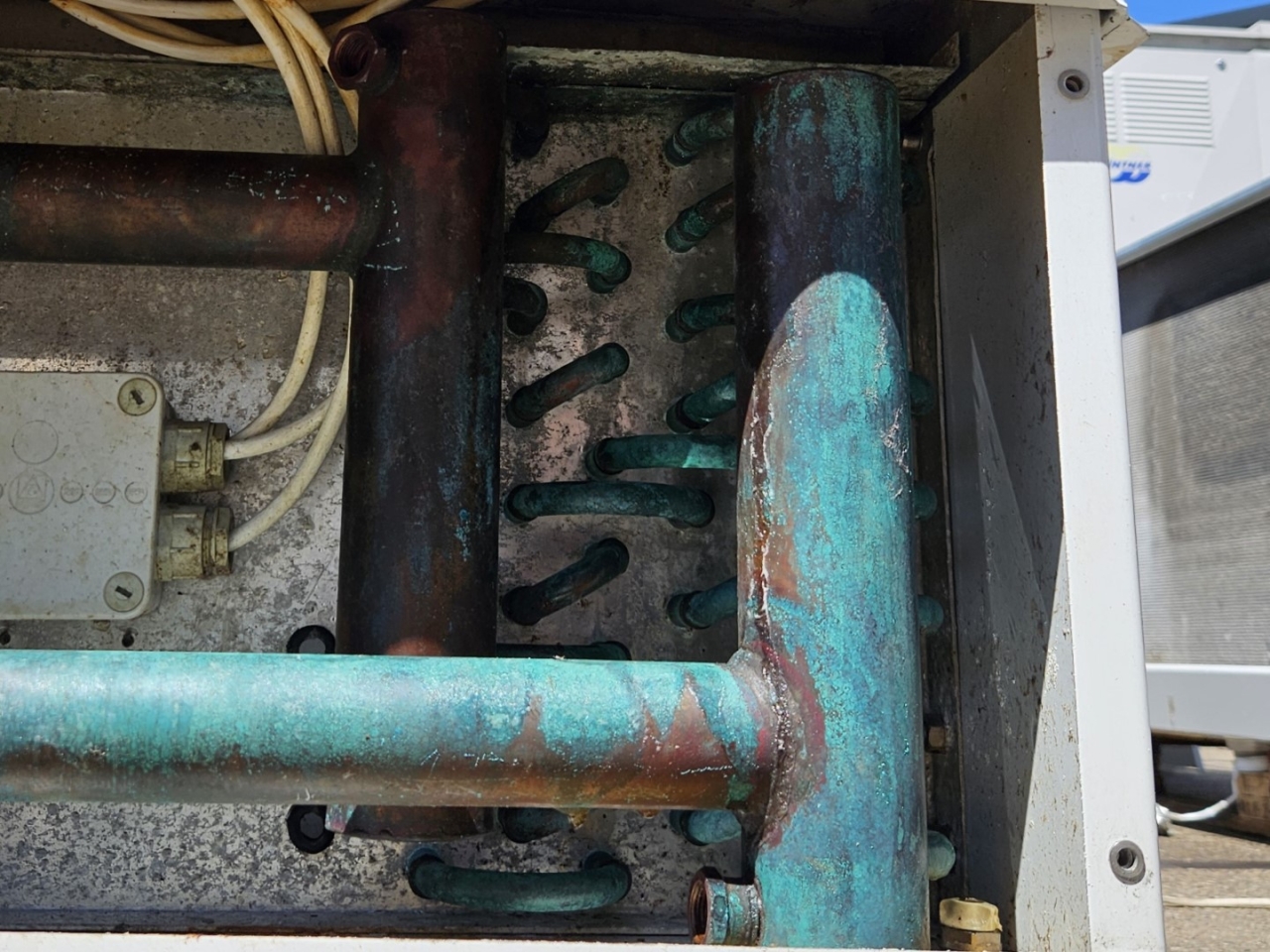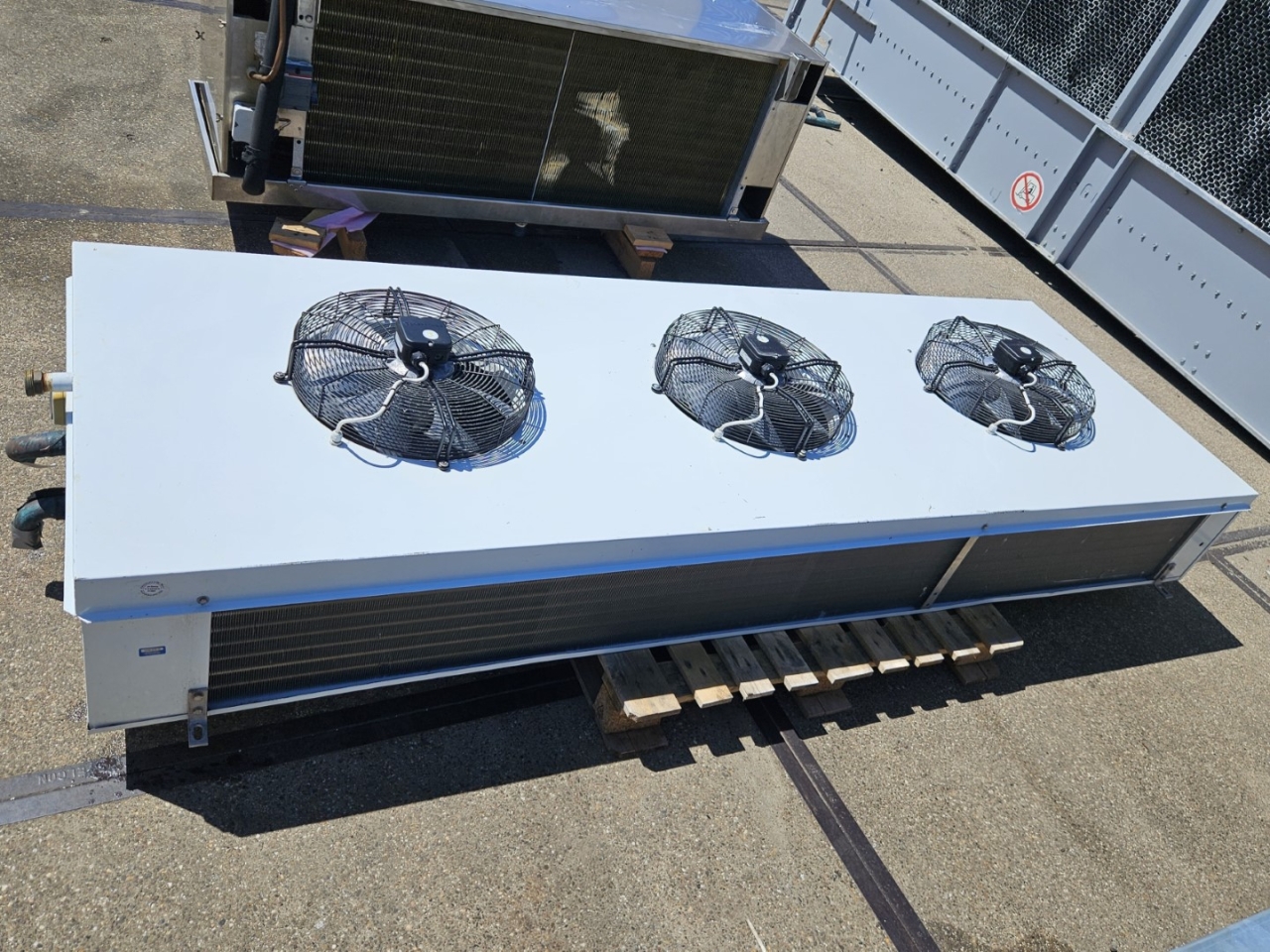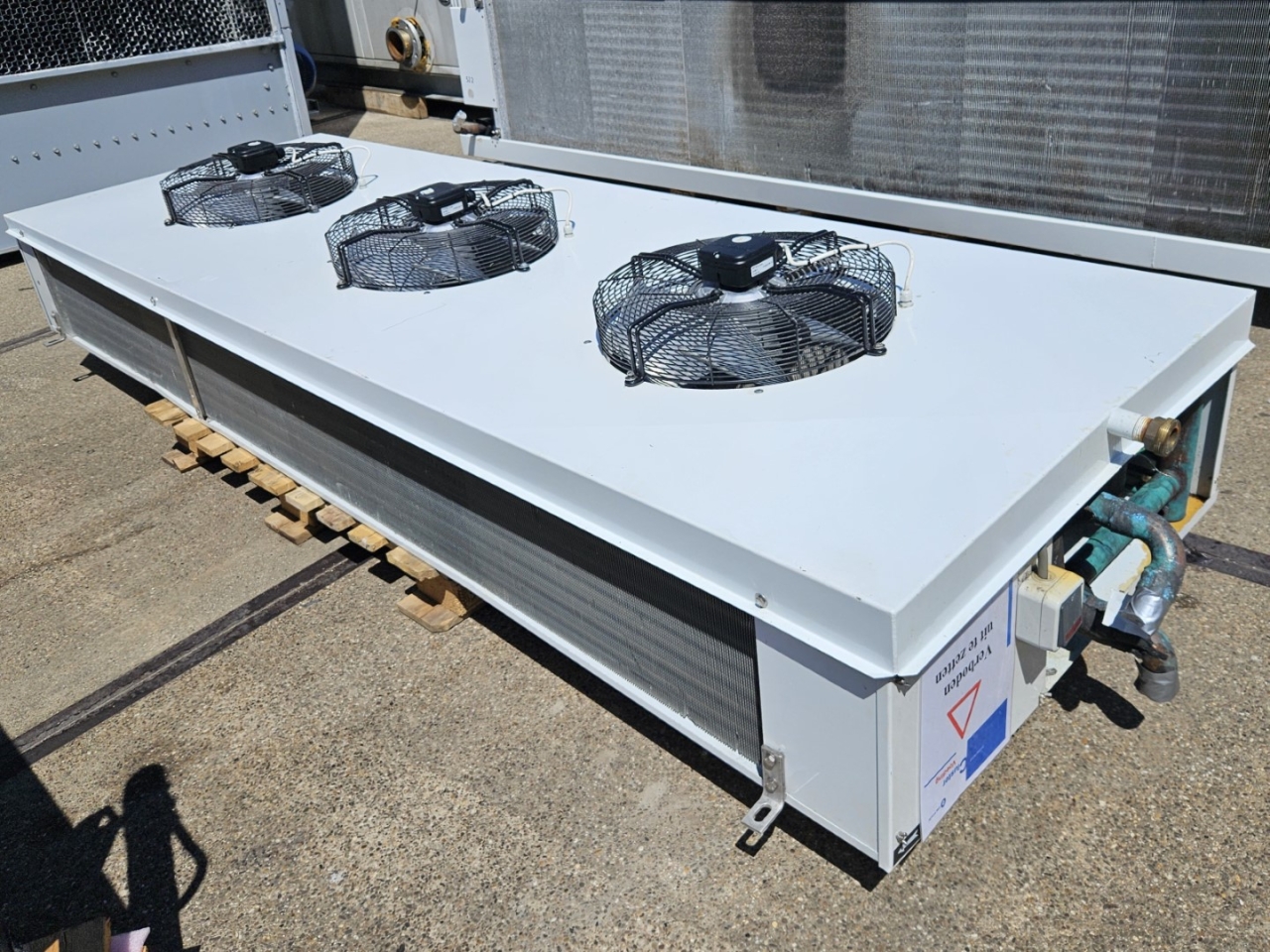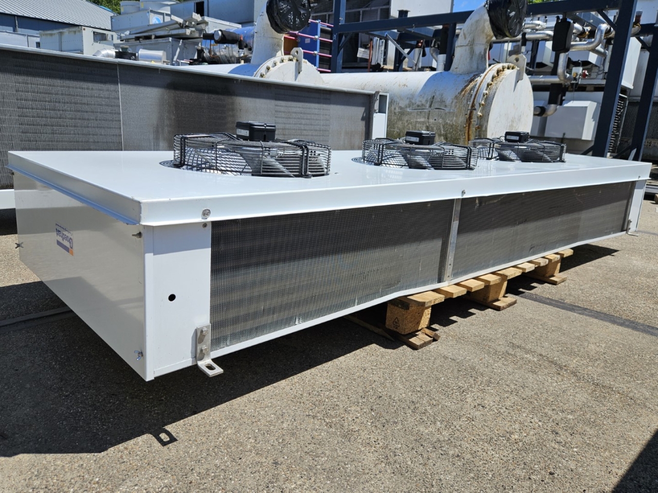 Gebrauchter Goedhart FC38(G)63454-230 Glykolverdampfer. Komplett mit 3 Kelvion FN045-4EW.4I.A7P1-Lüftern 50/60 Hz – 0,56/0,82 kW – 1320/1430 U/min – Durchmesser 450 mm und einem Gesamtluftstrom von 14.000 m³/h.