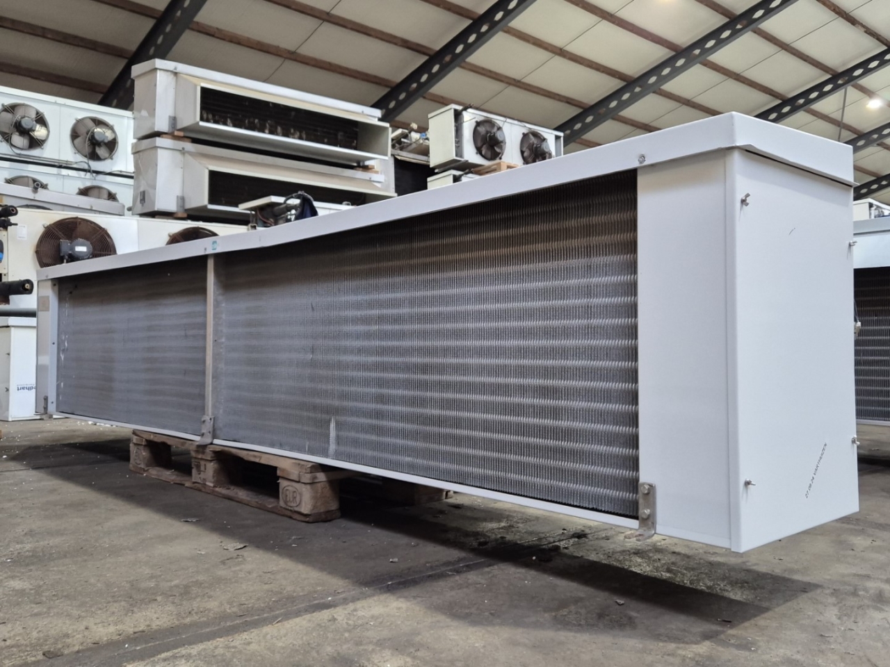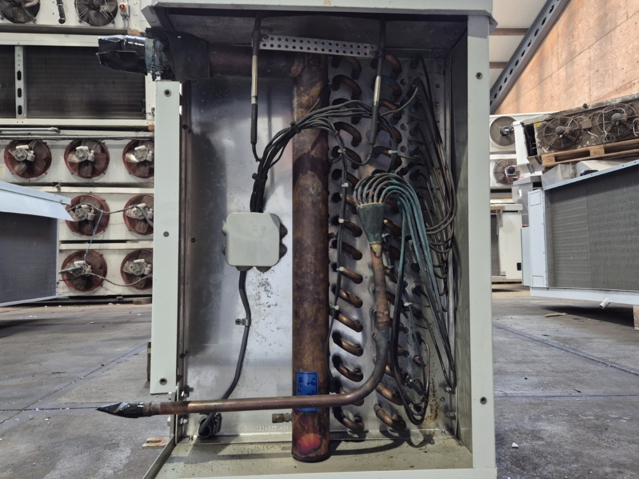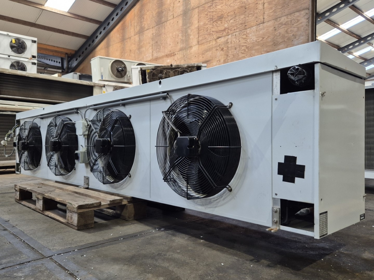 Gebrauchter Freon-Verdampfer Goedhart BSE 454-7-230 E mit elektrischer Abtauung. Komplett mit 4 EBM-Papst S4E450-AP01-16-Lüftern – 50/60 Hz – 0,25/0,35 kW – 1390/1580 U/min – Durchmesser 450 mm und einem Gesamtluftstrom von 18.040 m³/h.