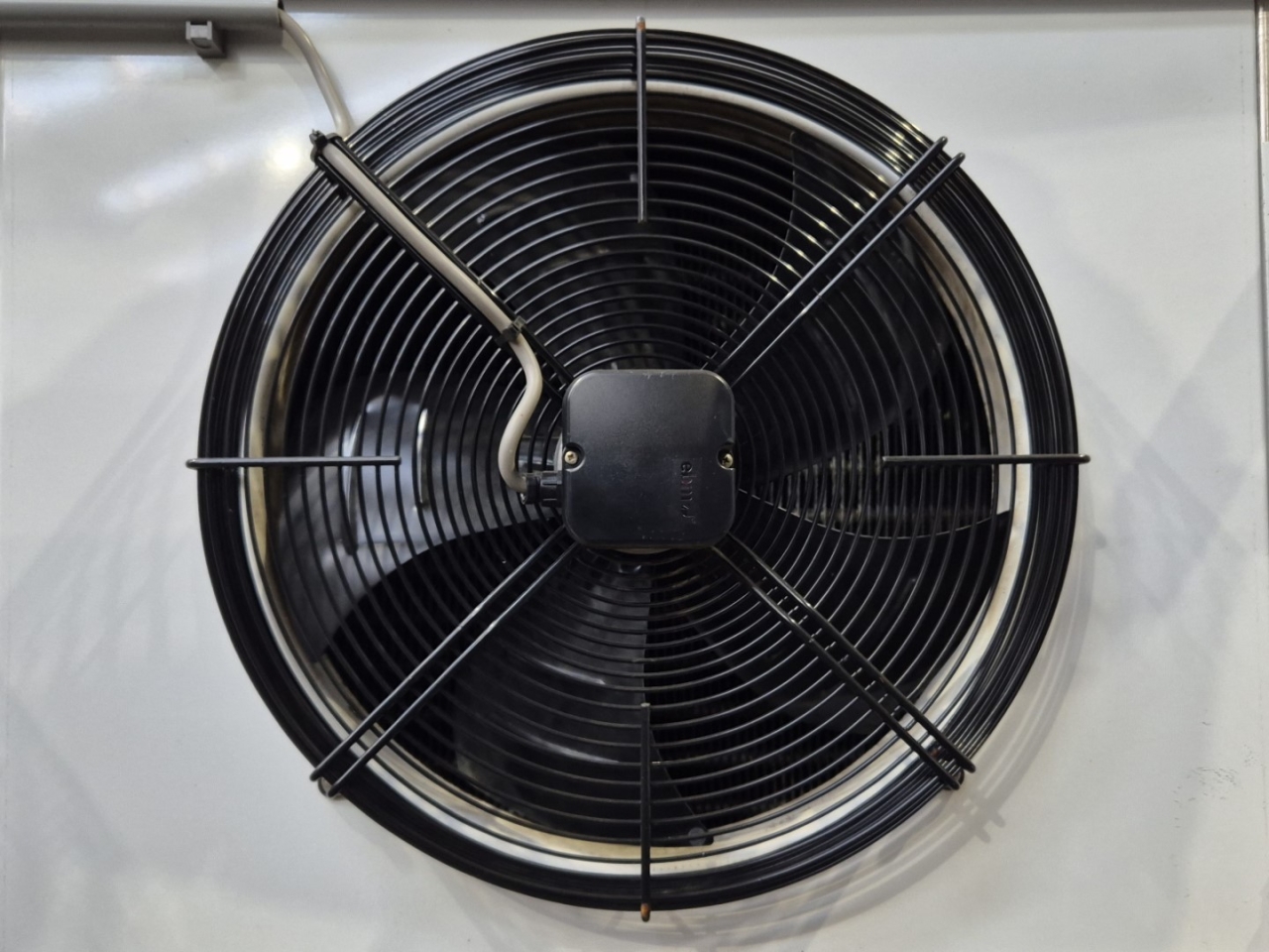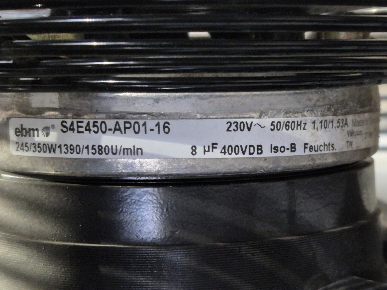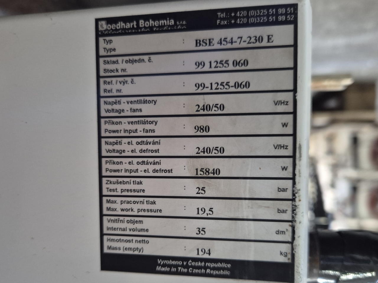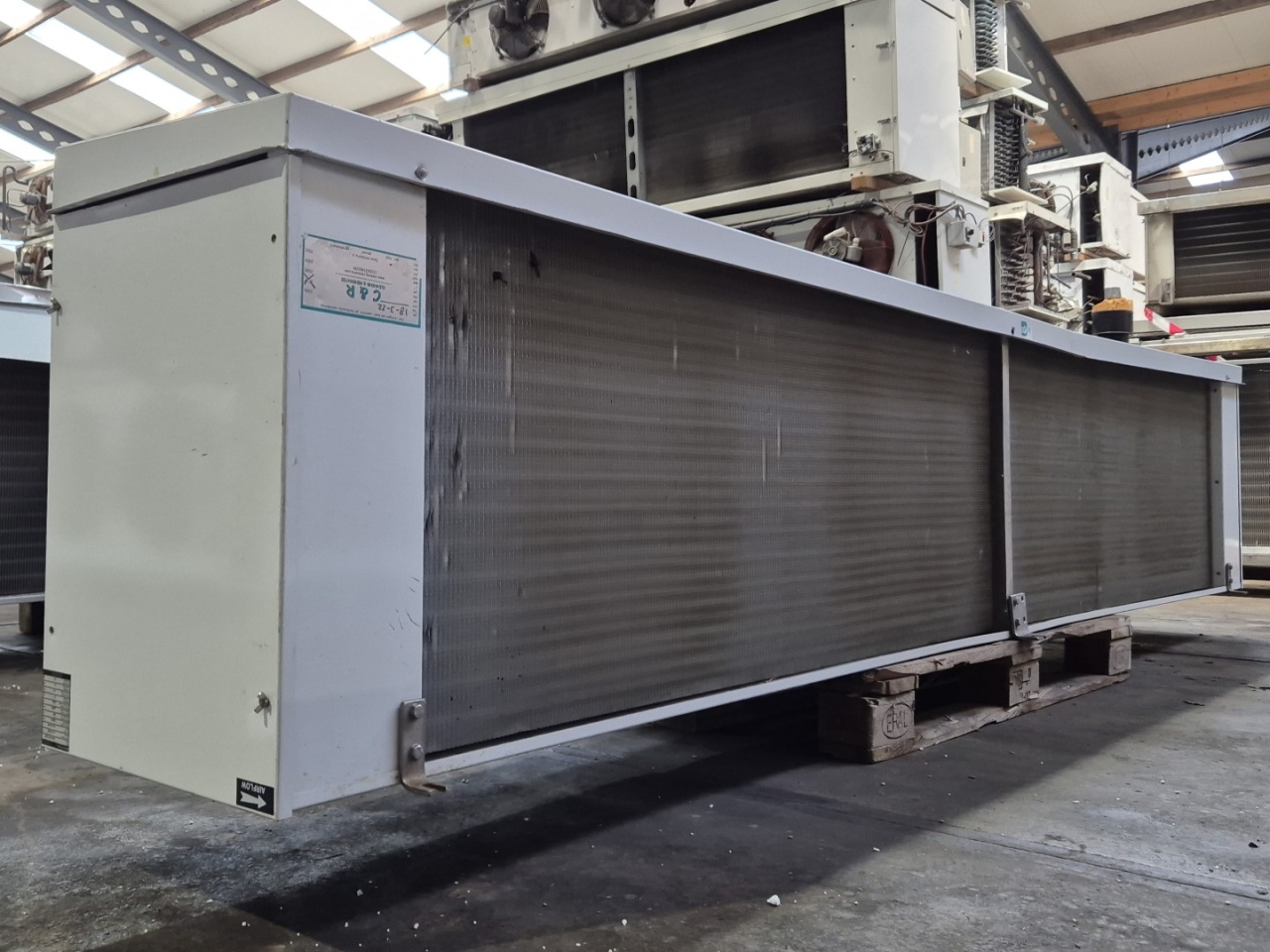 Gebrauchter Freon-Verdampfer Goedhart BSE 454-7-230 E mit elektrischer Abtauung. Komplett mit 4 EBM-Papst S4E450-AP01-16-Lüftern – 50/60 Hz – 0,25/0,35 kW – 1390/1580 U/min – Durchmesser 450 mm und einem Gesamtluftstrom von 18.040 m³/h.