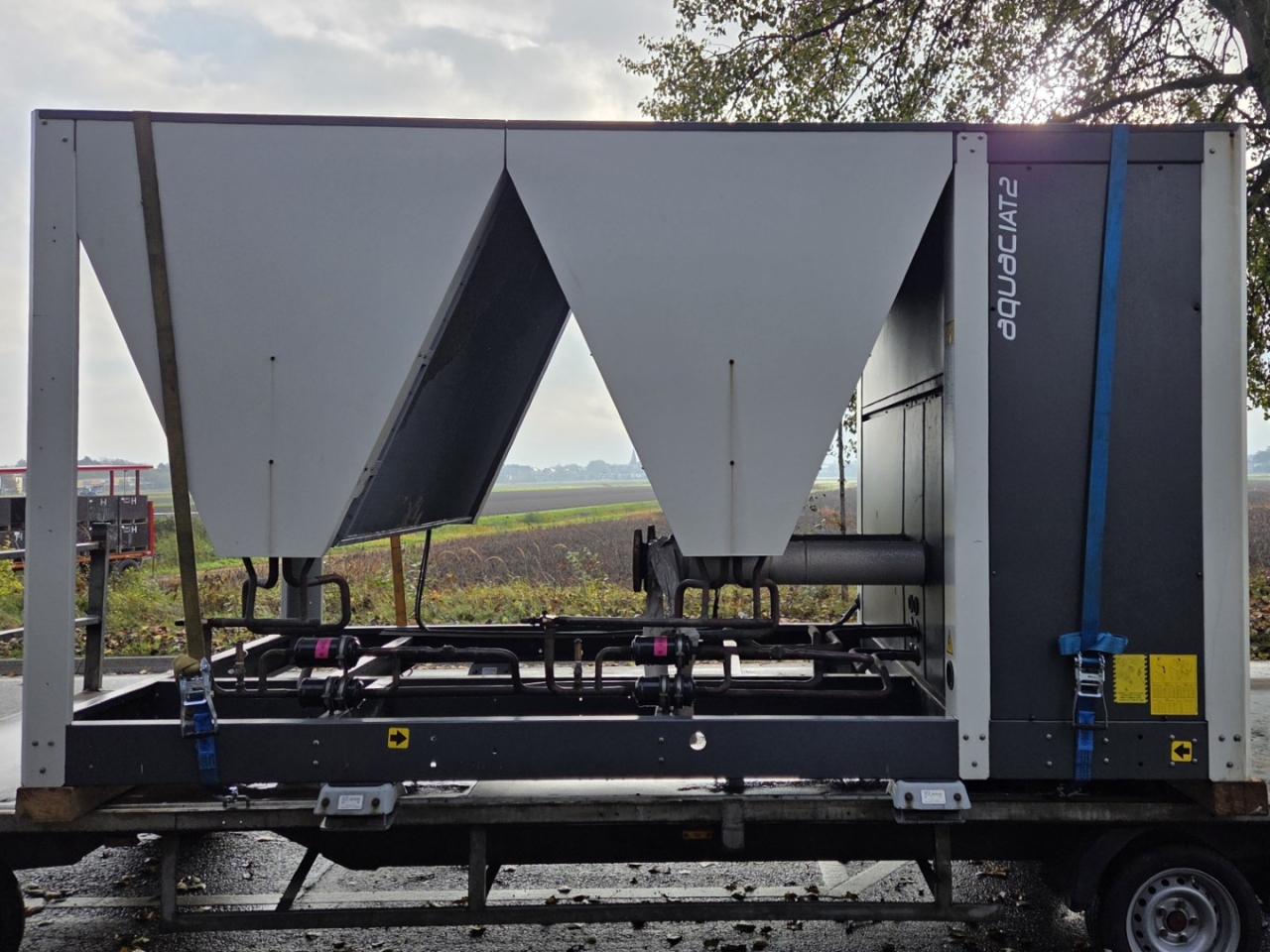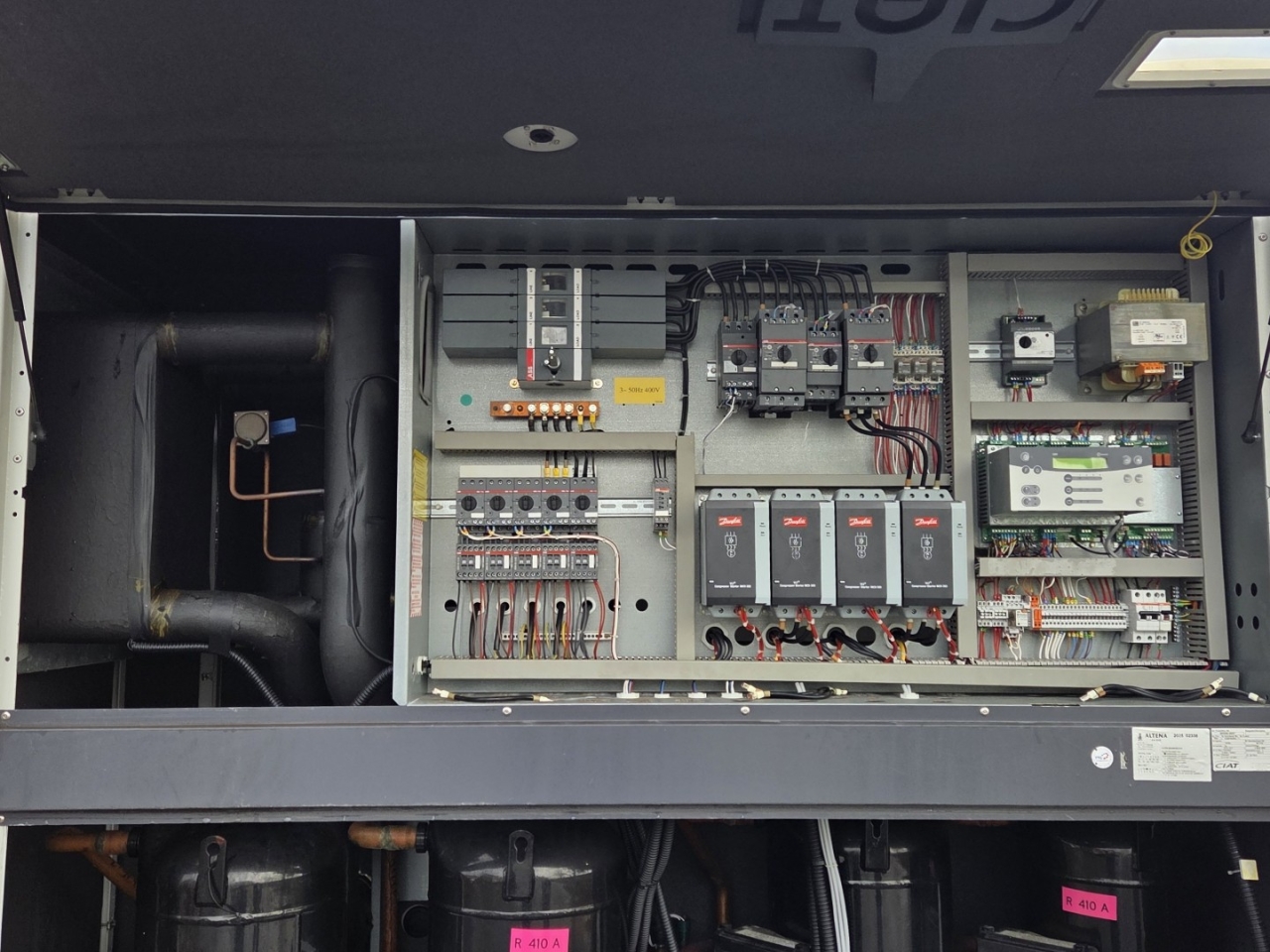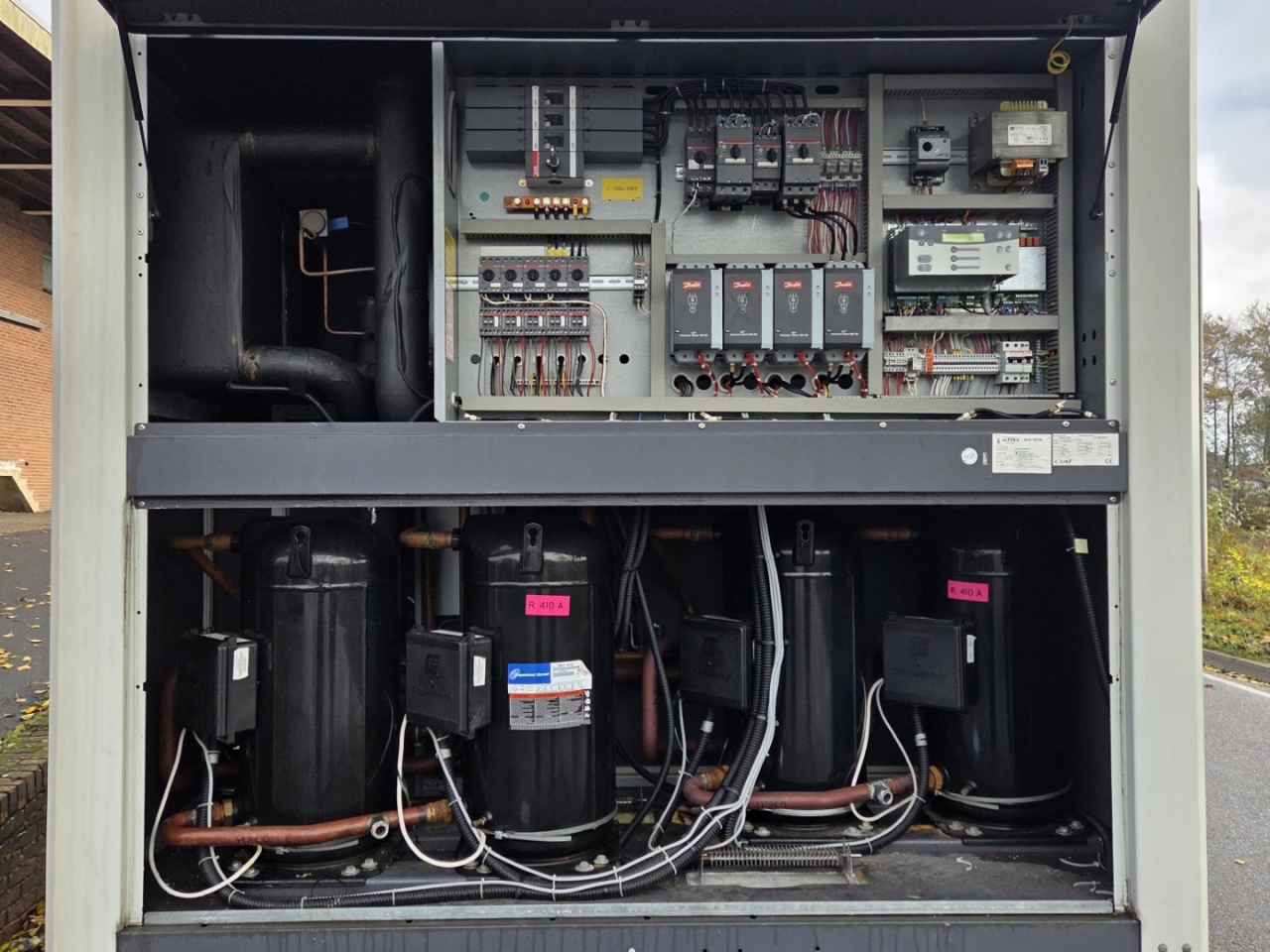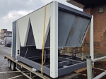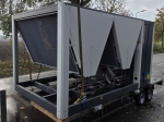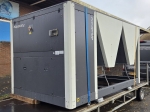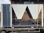 Gebrauchter luftgekühlter Kühler Ciat LD 1100V mit R410A. Komplett mit 2 Copeland ZP385KCE-TWD-522 und 2 ZP295KCE-TWD-522 Scroll-Kompressoren, Kondensator mit 4 Lüftern, 2 gelöteten Wärmetauschern als Verdampfer und einem Schaltschrank mit einem Ciat Connect-Controller.