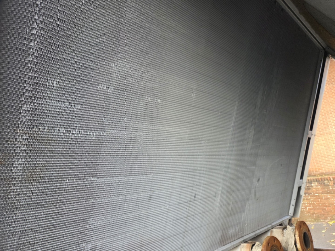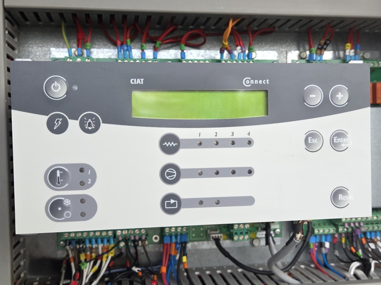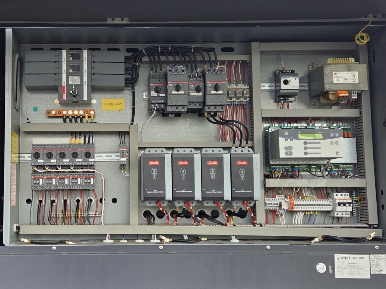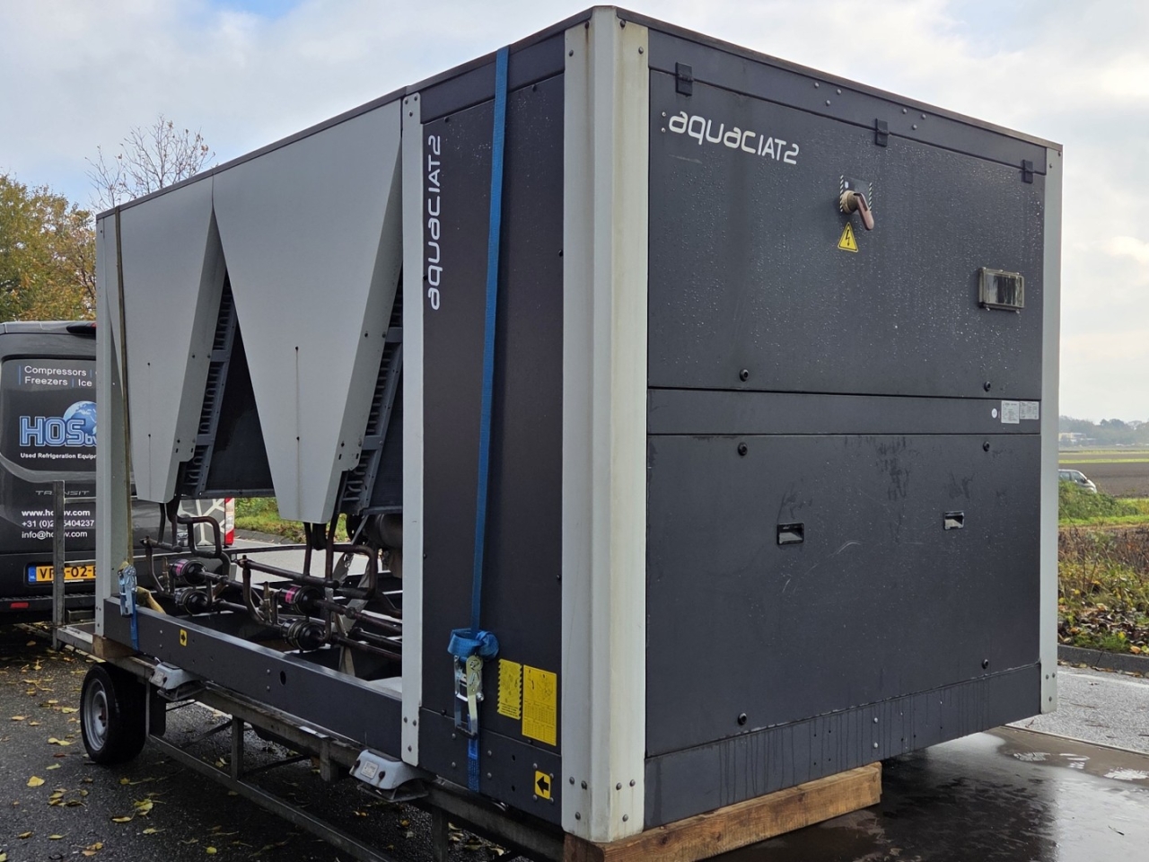 Gebrauchter luftgekühlter Kühler Ciat LD 1100V mit R410A. Komplett mit 2 Copeland ZP385KCE-TWD-522 und 2 ZP295KCE-TWD-522 Scroll-Kompressoren, Kondensator mit 4 Lüftern, 2 gelöteten Wärmetauschern als Verdampfer und einem Schaltschrank mit einem Ciat Connect-Controller.