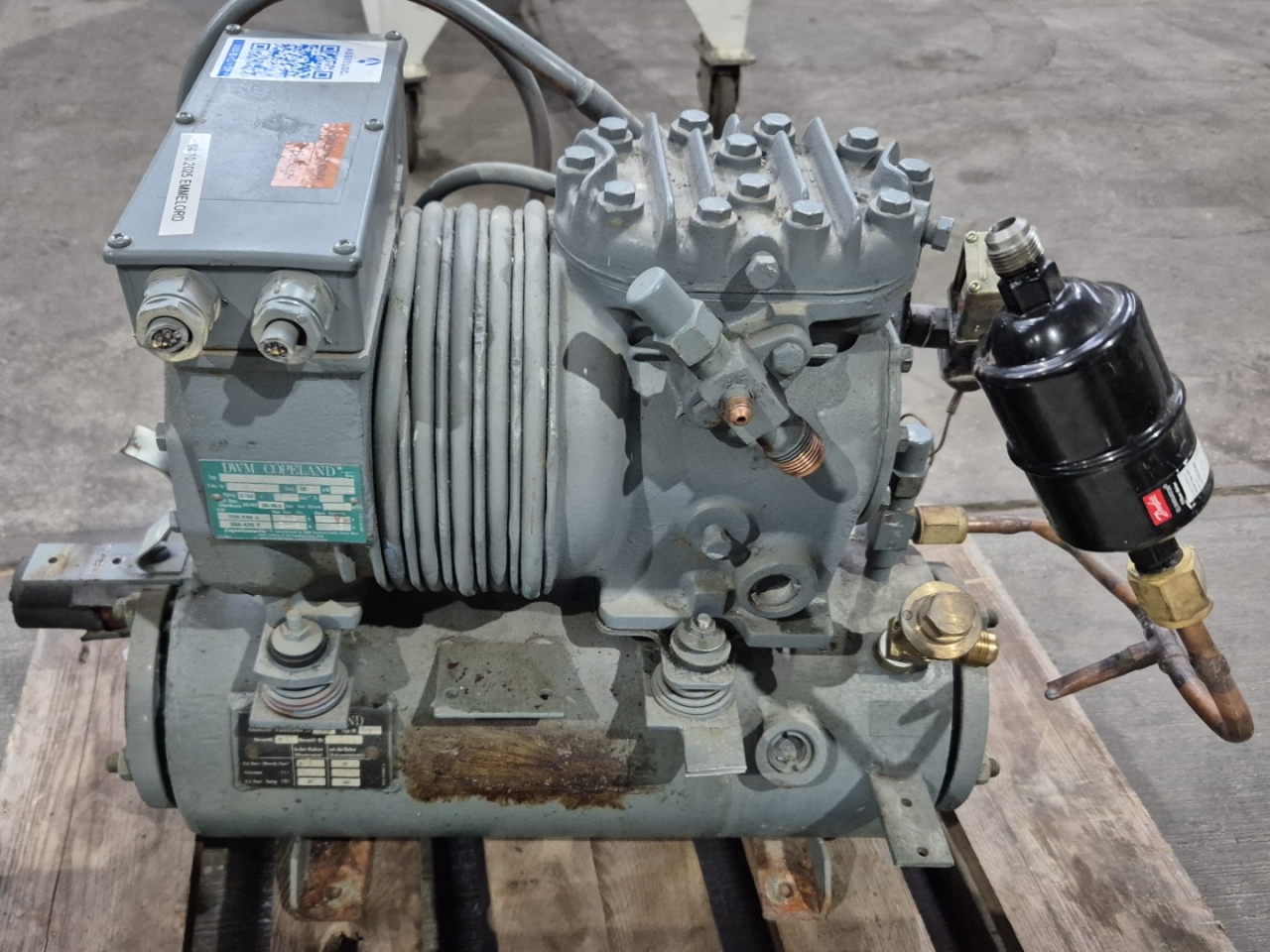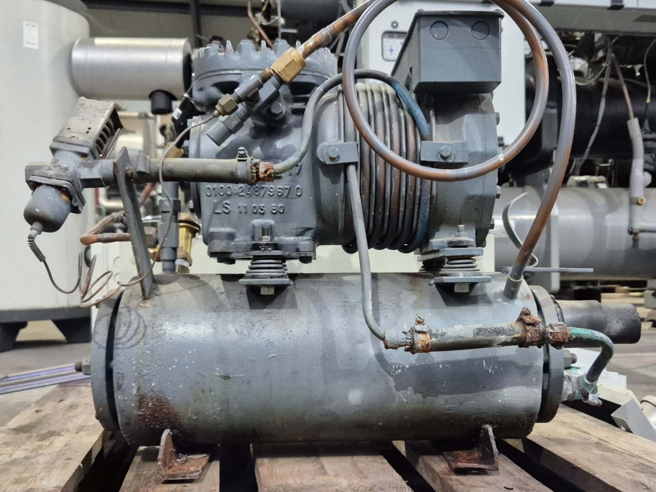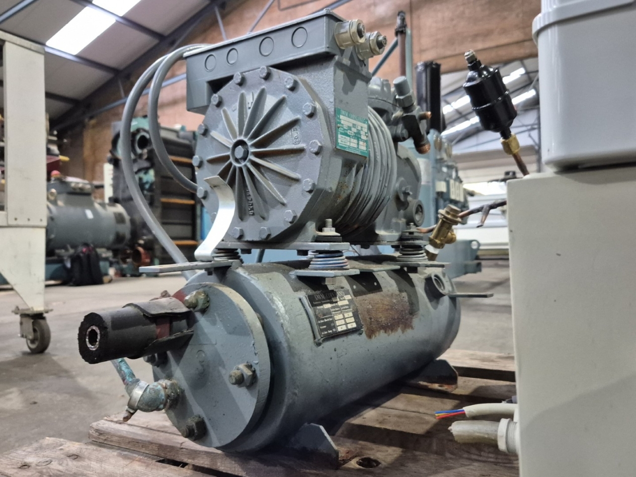 Gebrauchte wassergekühlte Verflüssigungsanlage von DWM / Copeland mit Freon-Betrieb. Komplett mit halbhermetischem Kolbenkompressor DWM DKSJB-100/EWL/000, Rohrbündelkondensator DWM WR2-KSJ-100H-LX/EWL, Flüssigkeitsleitungsfiltertrockner, Druck- und Sicherheitsschaltern/-messgeräten sowie einem Schaltschrank. Der Kompressor hat eine Förderleistung von 6,33 m³/h.