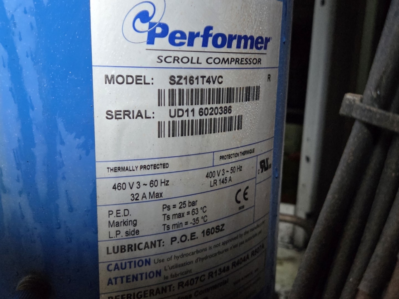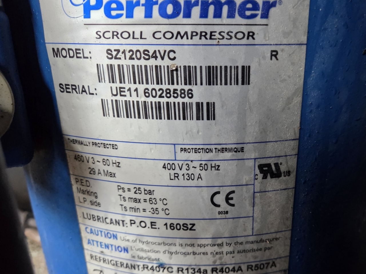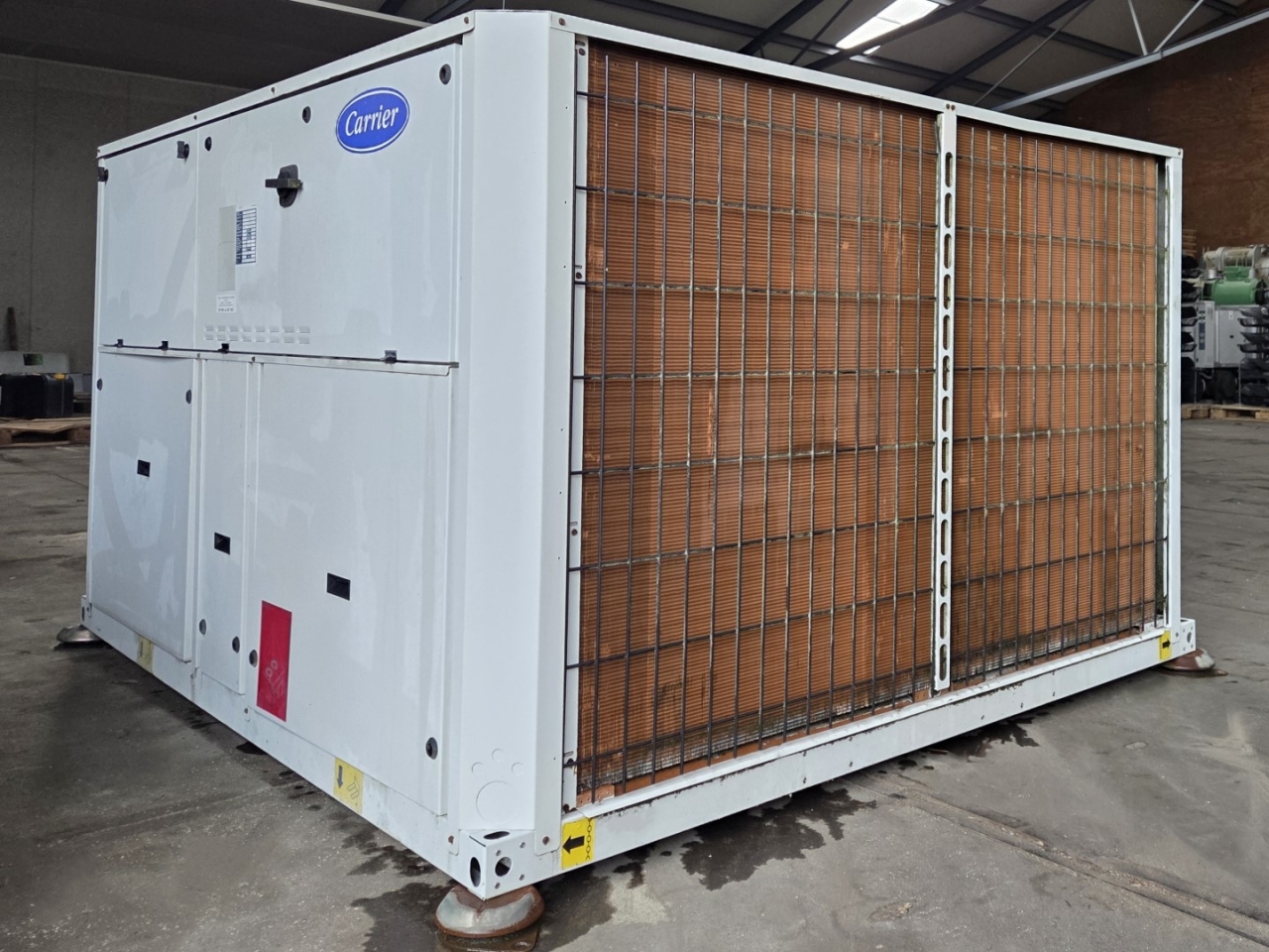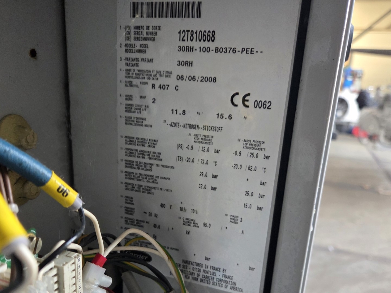 Gebrauchte Carrier 30 RH 100 Wärmepumpe mit Freon R407C. Komplett mit je einem Performer SZ120S4VC, SZ161T4VC und SZ185W4PC Scrollverdichter, Kondensator mit zwei Lüftern (50 Hz, 700/350/550 U/min, 0,82/0,1/0,4 kW), gelötetem Alfa Laval AC-130-102DQ Wärmetauscher, zwei Mecasem S.A. 30RH 501 022 E Flüssigkeitsbehältern, Salmson SHC12-136/1.1 Wasserpumpe mit Elektromotor, Ausdehnungsgefäß und Schaltschrank mit Carrier Pro-Dialog Plus Steuerung.
