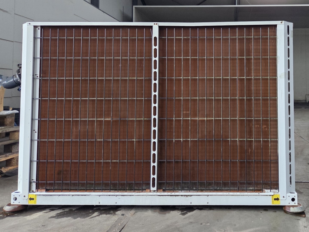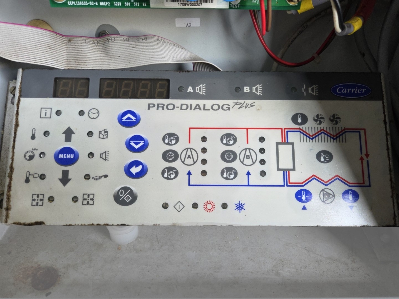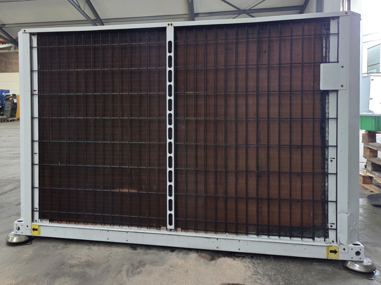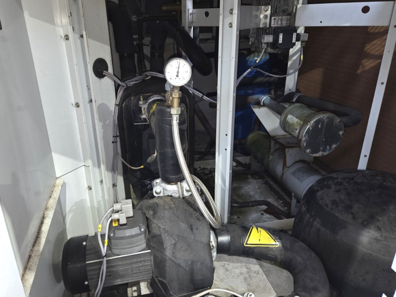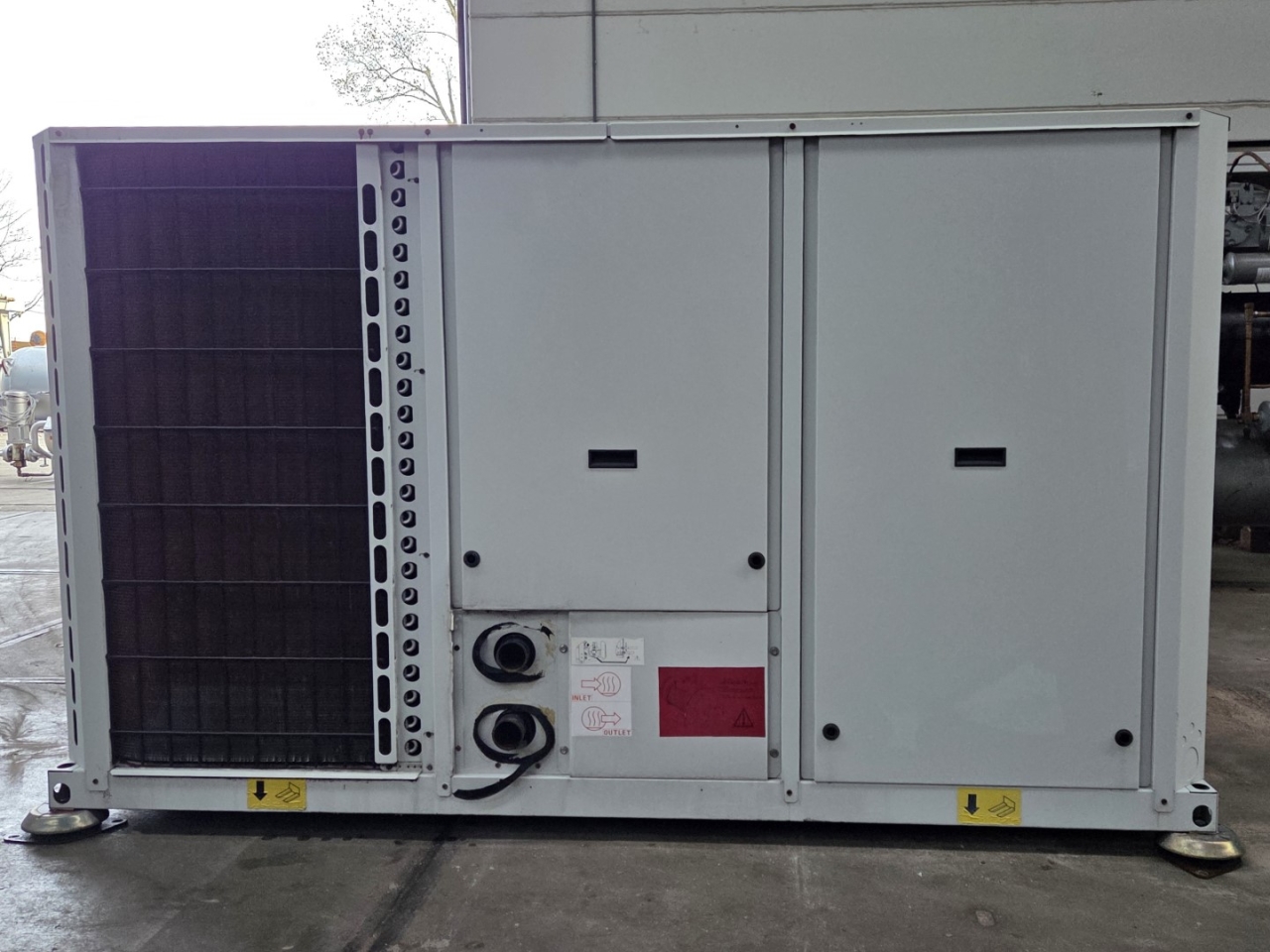 Gebrauchte Carrier 30 RH 100 Wärmepumpe mit Freon R407C. Komplett mit je einem Performer SZ120S4VC, SZ161T4VC und SZ185W4PC Scrollverdichter, Kondensator mit zwei Lüftern (50 Hz, 700/350/550 U/min, 0,82/0,1/0,4 kW), gelötetem Alfa Laval AC-130-102DQ Wärmetauscher, zwei Mecasem S.A. 30RH 501 022 E Flüssigkeitsbehältern, Salmson SHC12-136/1.1 Wasserpumpe mit Elektromotor, Ausdehnungsgefäß und Schaltschrank mit Carrier Pro-Dialog Plus Steuerung.