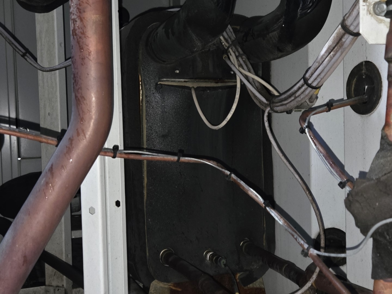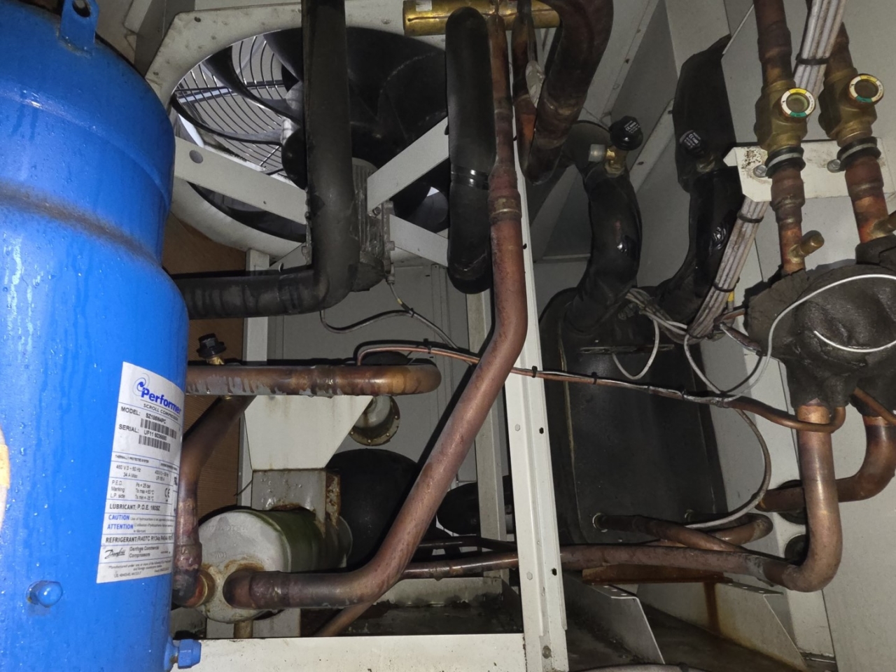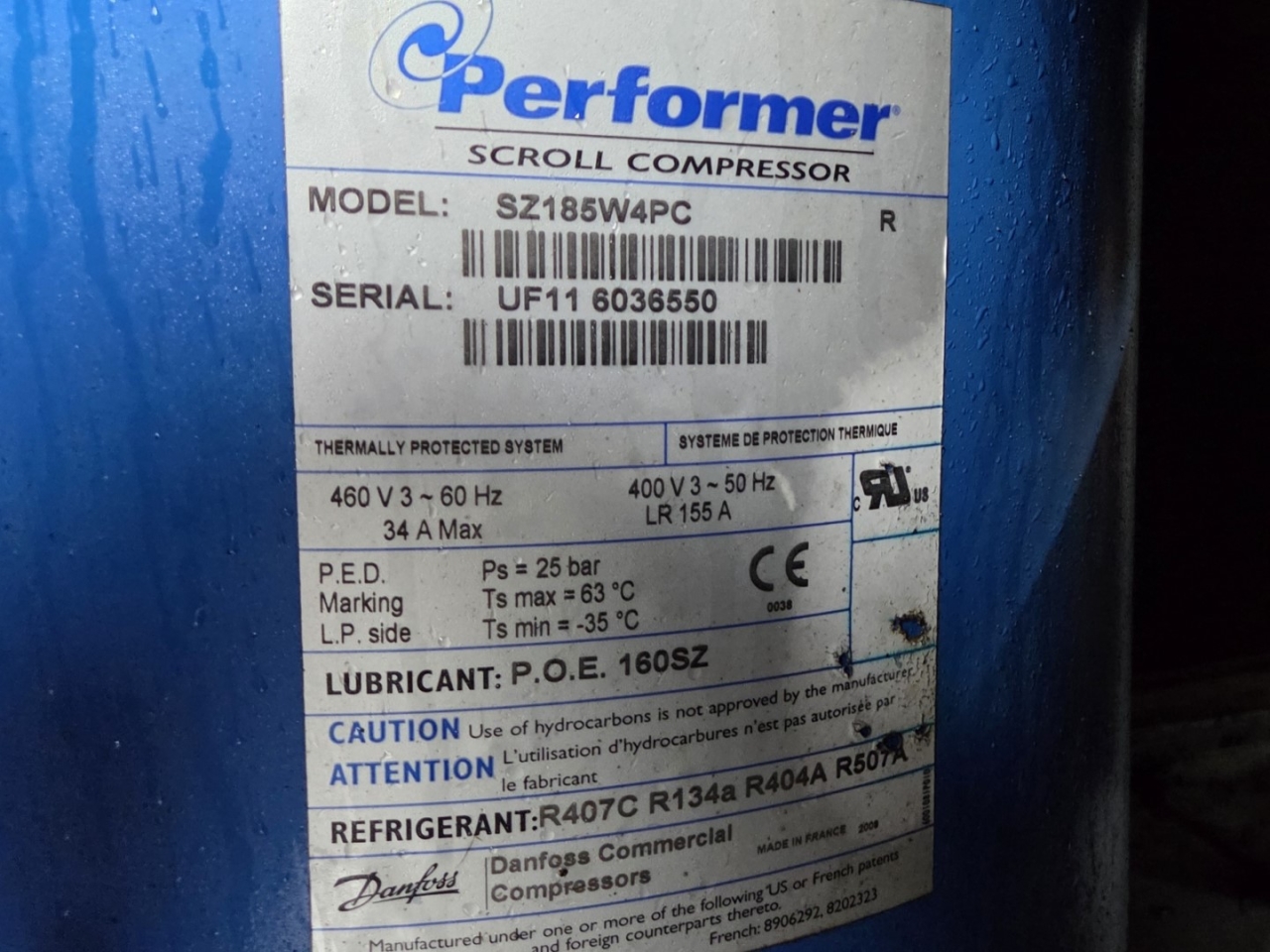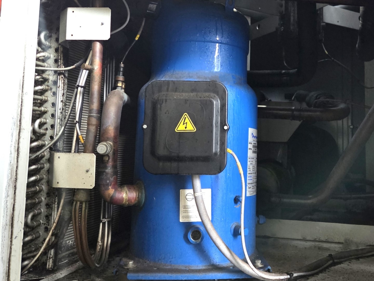 Gebrauchte Carrier 30 RH 100 Wärmepumpe mit Freon R407C. Komplett mit je einem Performer SZ120S4VC, SZ161T4VC und SZ185W4PC Scrollverdichter, Kondensator mit zwei Lüftern (50 Hz, 700/350/550 U/min, 0,82/0,1/0,4 kW), gelötetem Alfa Laval AC-130-102DQ Wärmetauscher, zwei Mecasem S.A. 30RH 501 022 E Flüssigkeitsbehältern, Salmson SHC12-136/1.1 Wasserpumpe mit Elektromotor, Ausdehnungsgefäß und Schaltschrank mit Carrier Pro-Dialog Plus Steuerung.