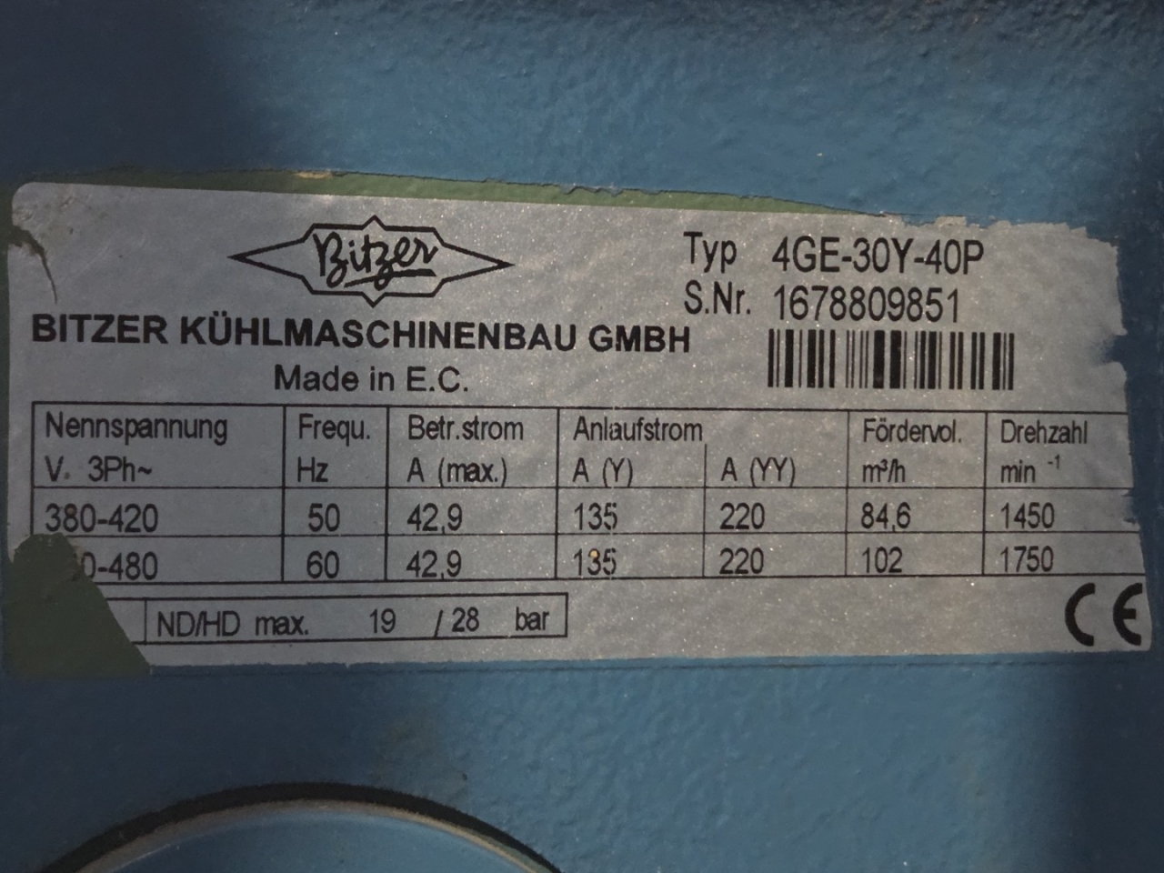 Gebrauchter halbhermetischer Bitzer 4GE-30Y-40P Kolbenkompressor mit Freon-Befüllung und Schauglas. Der Kompressor hat eine Fördermenge von 84,6 m³/h bei 50 Hz und 102 m³/h bei 60 Hz.