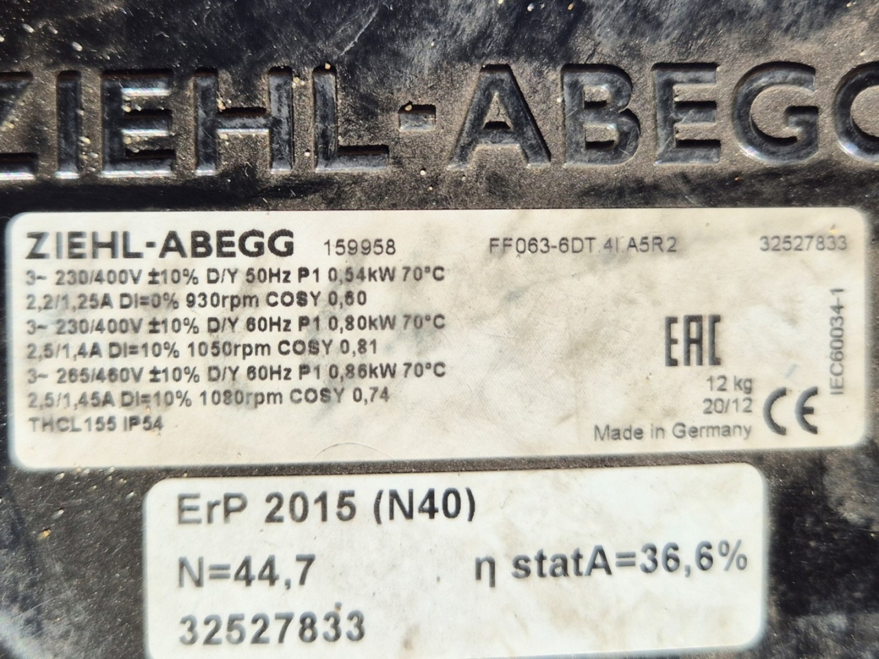Neuer Ziehl-Abegg FF063-6DT.4I.A5R2 Lüfter mit folgenden Spezifikationen: 50 Hz - 0,54 kW - 930 U/min & 60 Hz - 0,80 kW - 1050 U/min - Durchmesser 630 mm.