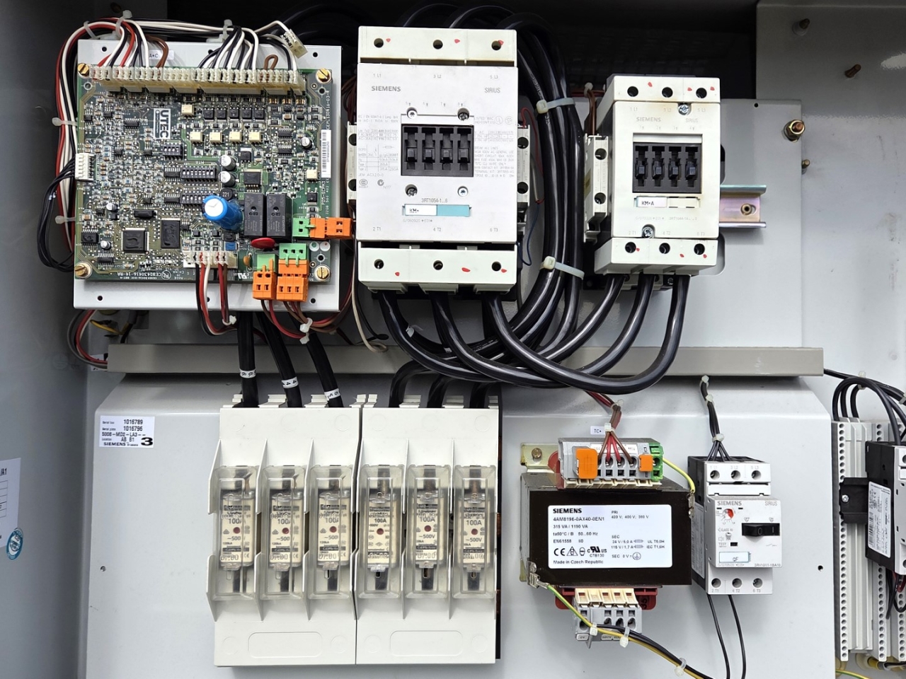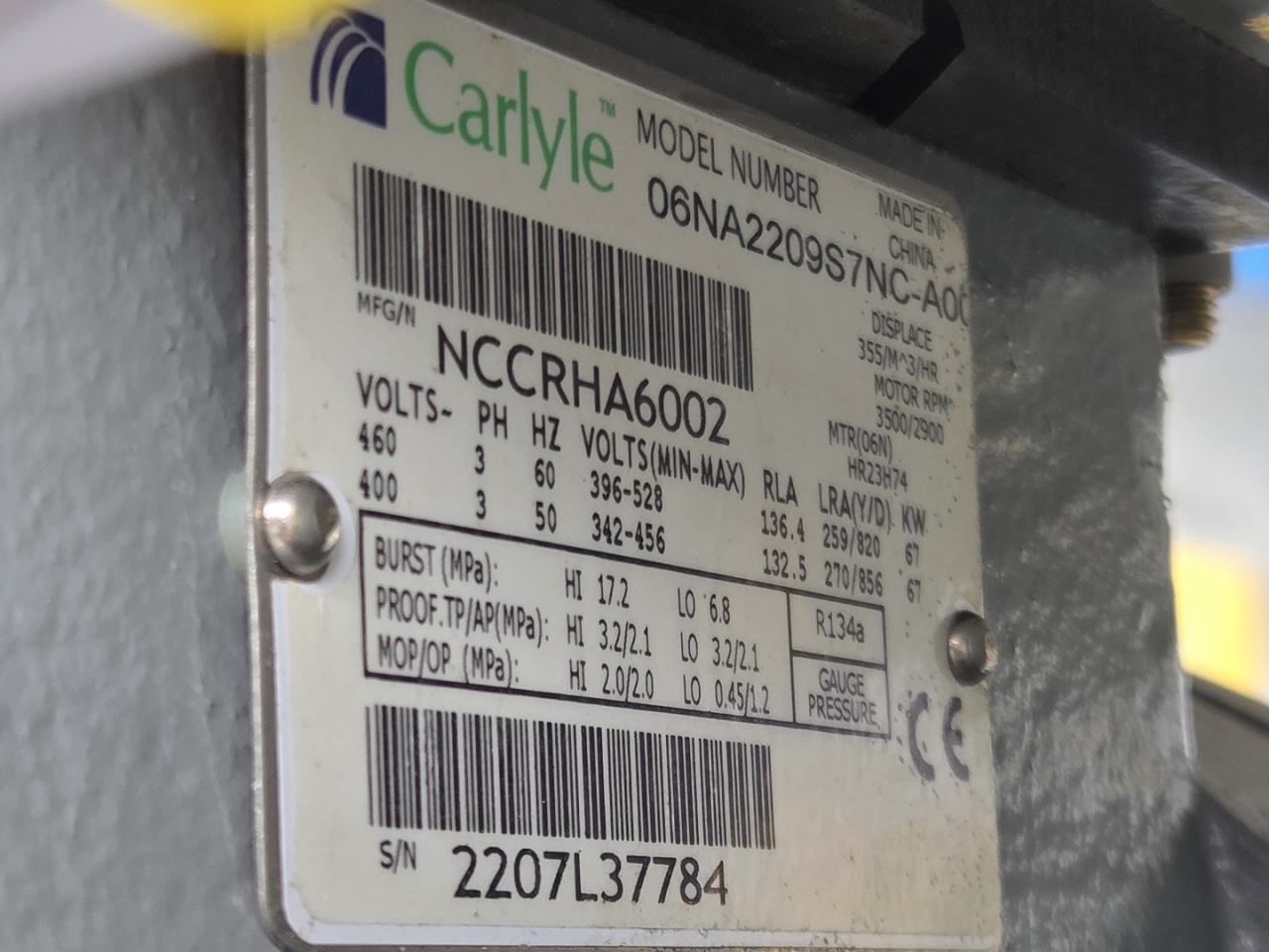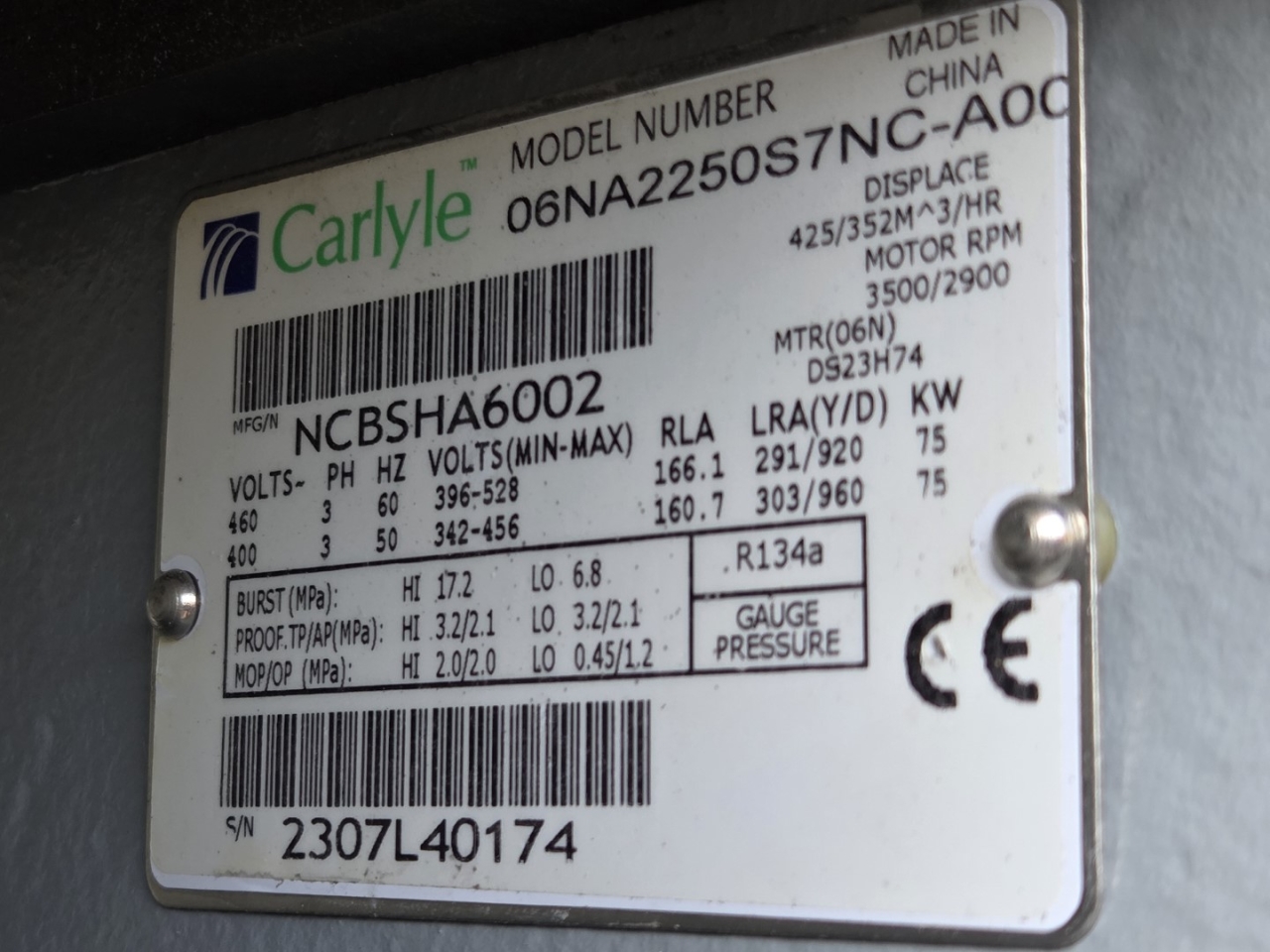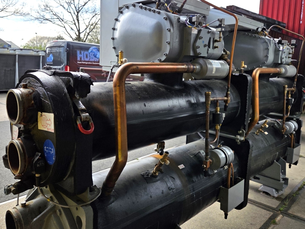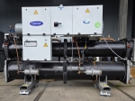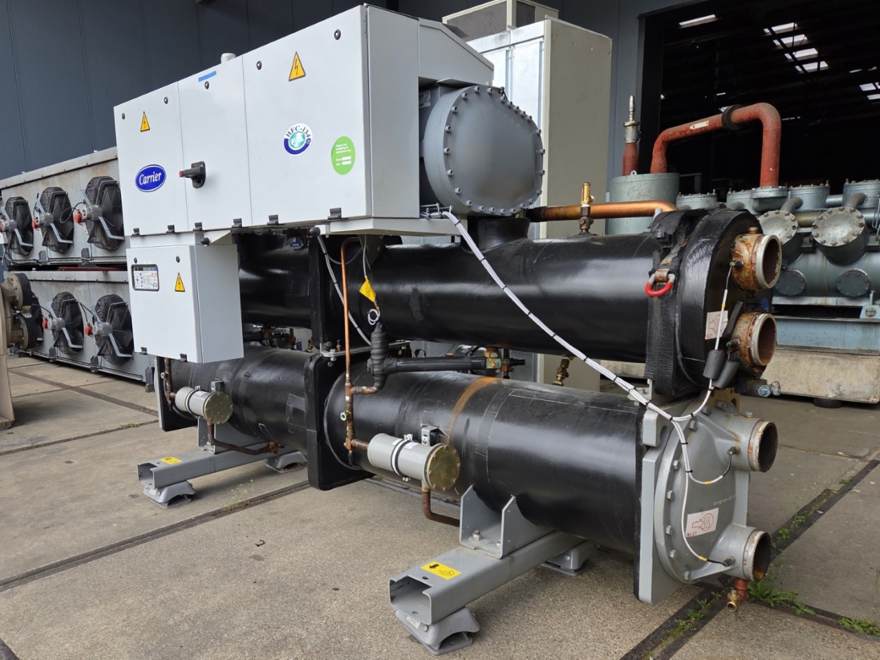 Gebrauchte wassergekühlte Kältemaschine Carrier 30HXC130-A0348-PEE mit Kältemittel R134a. Komplett mit je einem Schraubenkompressor Carlyle 06NA2209S7NC-A00 und Carlyle 06NA2250S7NC-A00, Rohrbündelverdampfer/Wärmetauscher Carrier 10HX2093FA-206-PEE, Rohrbündelkondensator Carrier 09RX2100FA-206-PEE, Flüssigkeitsleitungsfiltertrocknern und Schaltschrank mit Carrier Pro-Dialog Plus.