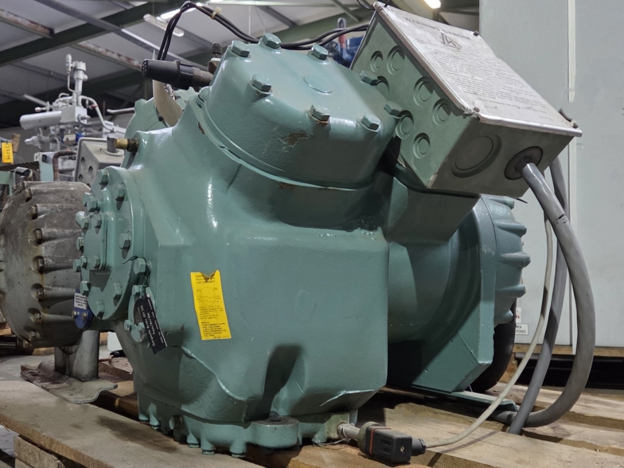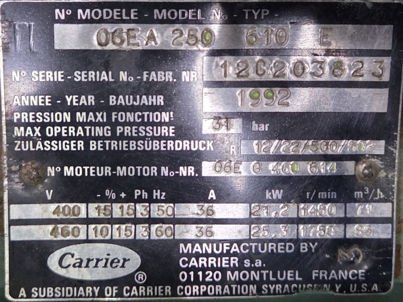 Used Carlyle/Carrier 06EA 250 610 E semi-hermetic compressor on Freon. Complete with a sight glass and liquid line filter drier. The compressor has a displacement of 21,2 m³/h at 50 Hz & 25,3 m³/h at 60 Hz.