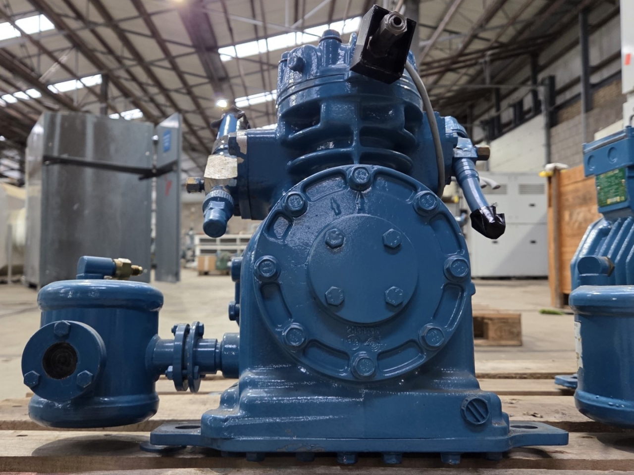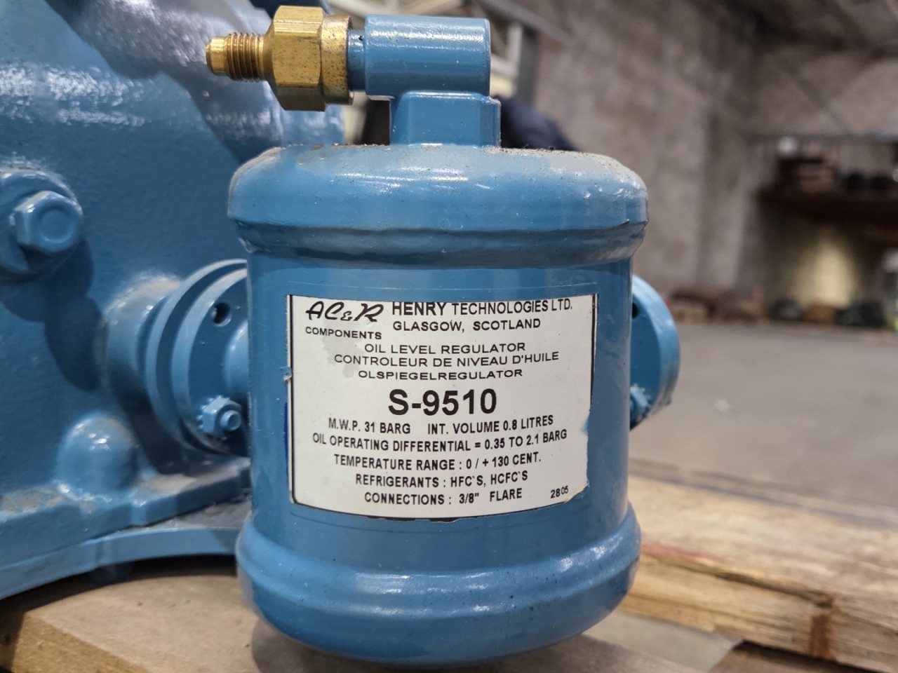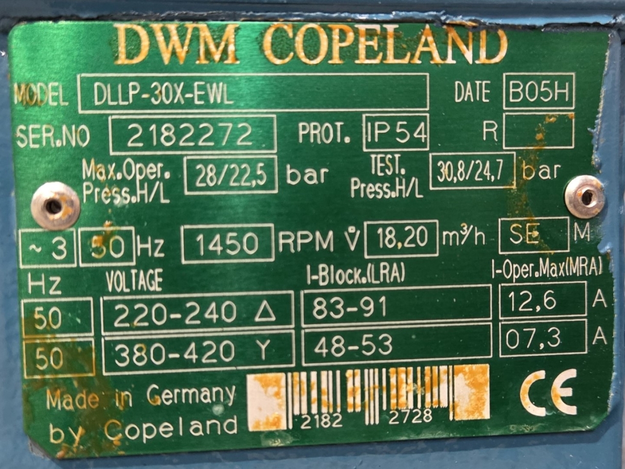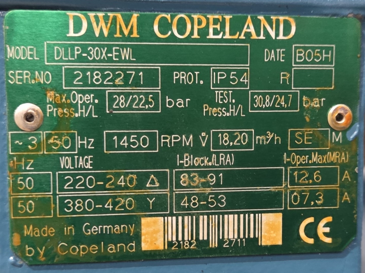 Used DWM/Copeland DLLP-30X-EWL semi-hermetic piston compressor on Freon. Complete with a Henry Technologies S-9510 oil level system AC&R a sight glass. The compressor has a displacement of 18,2 m³/h at 1450 RPM.