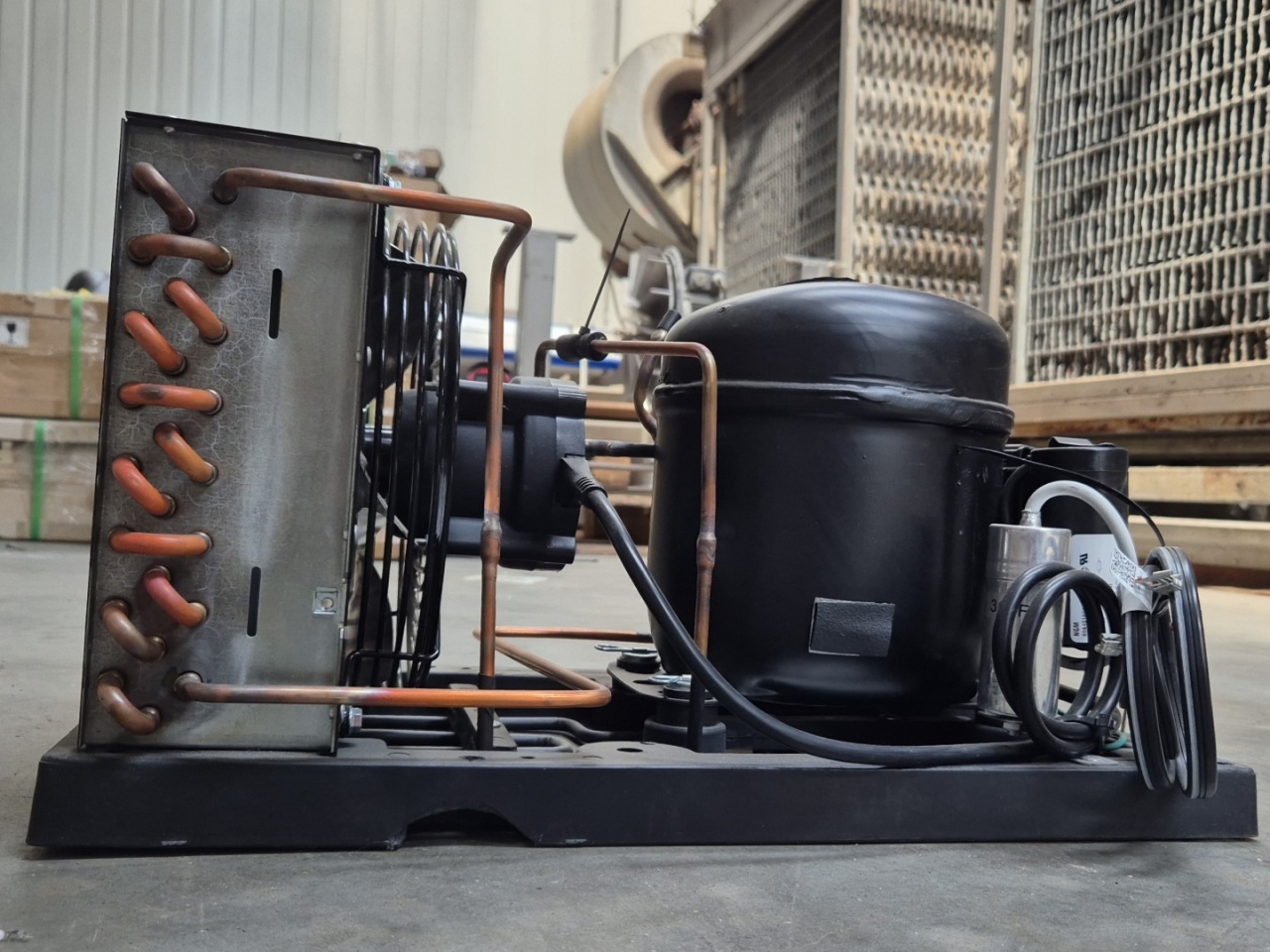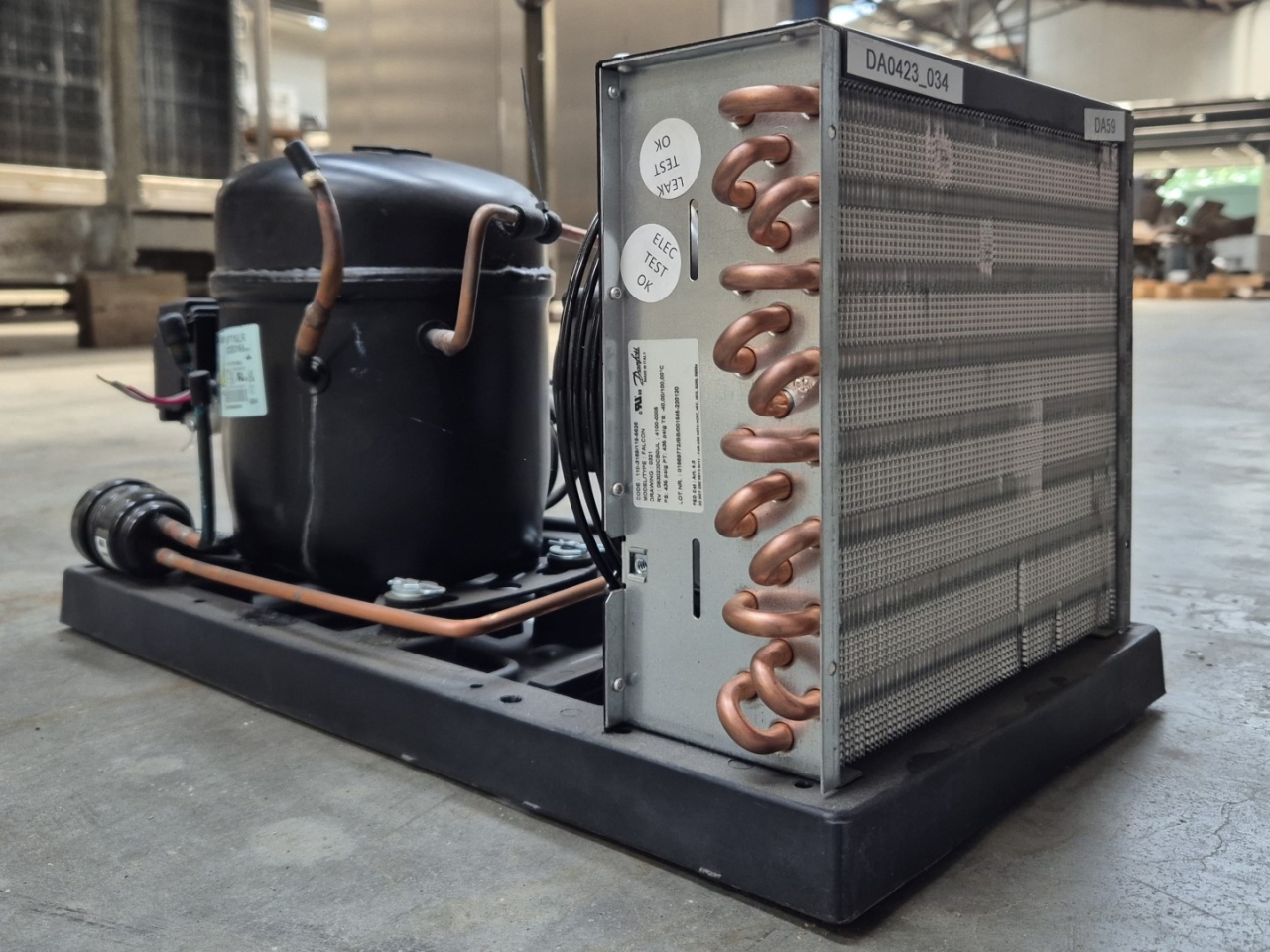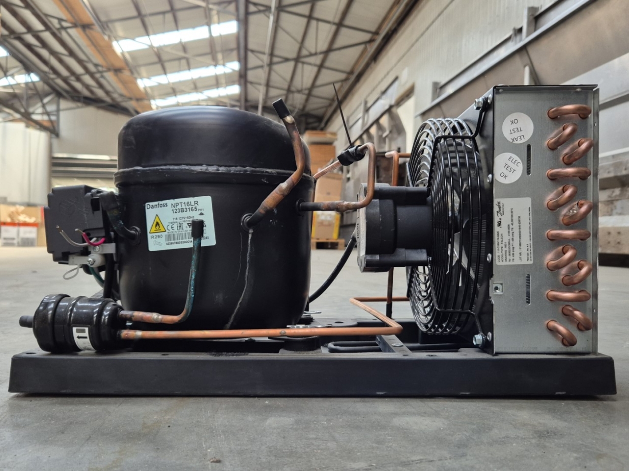 Good as new Danfoss NPT16LR condensing unit on R290 (Propane). Complete with a Danfoss NPT16LR reciprocating compressor, and a condenser with 1 Hilo ECM FBS 25-25 4S fan.