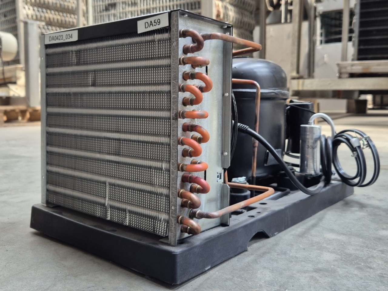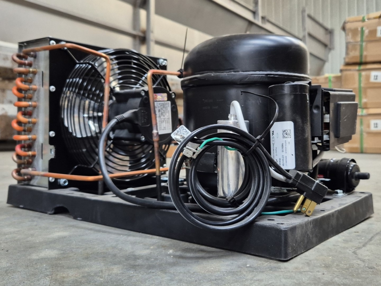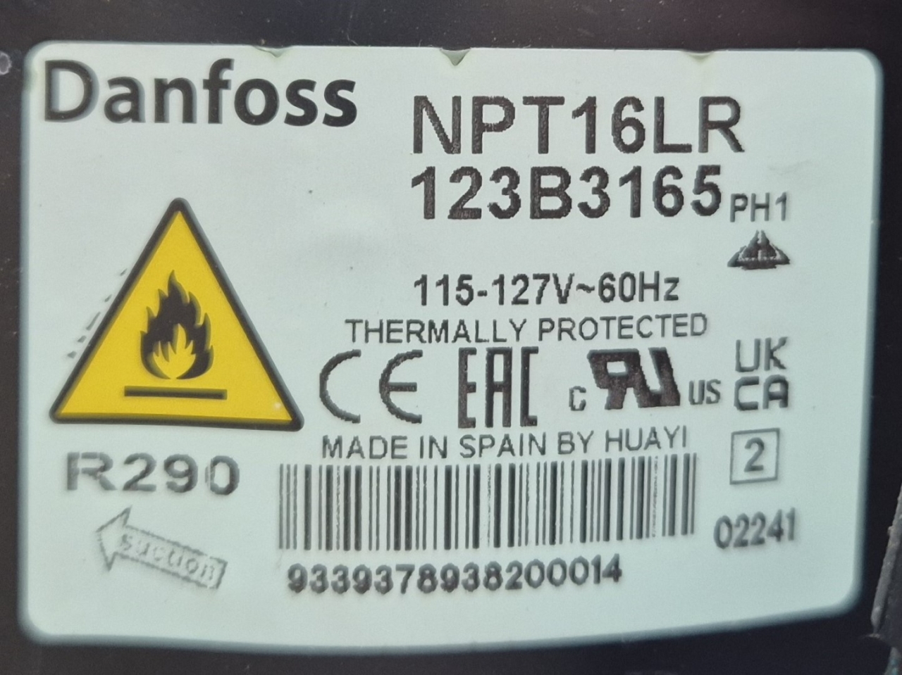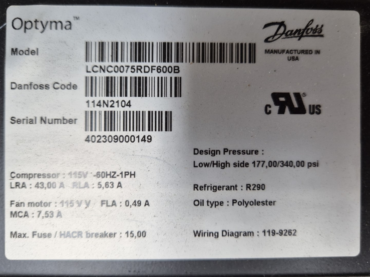 Good as new Danfoss NPT16LR condensing unit on R290 (Propane). Complete with a Danfoss NPT16LR reciprocating compressor, and a condenser with 1 Hilo ECM FBS 25-25 4S fan.