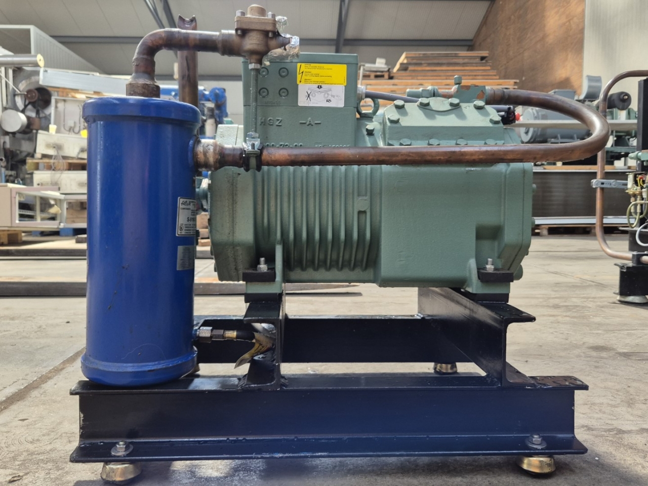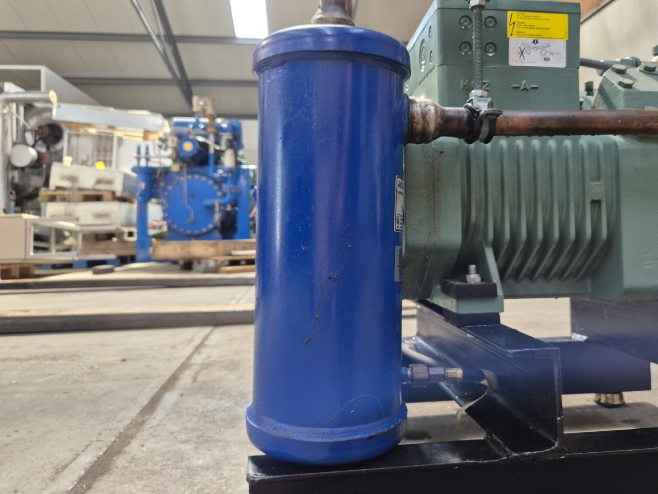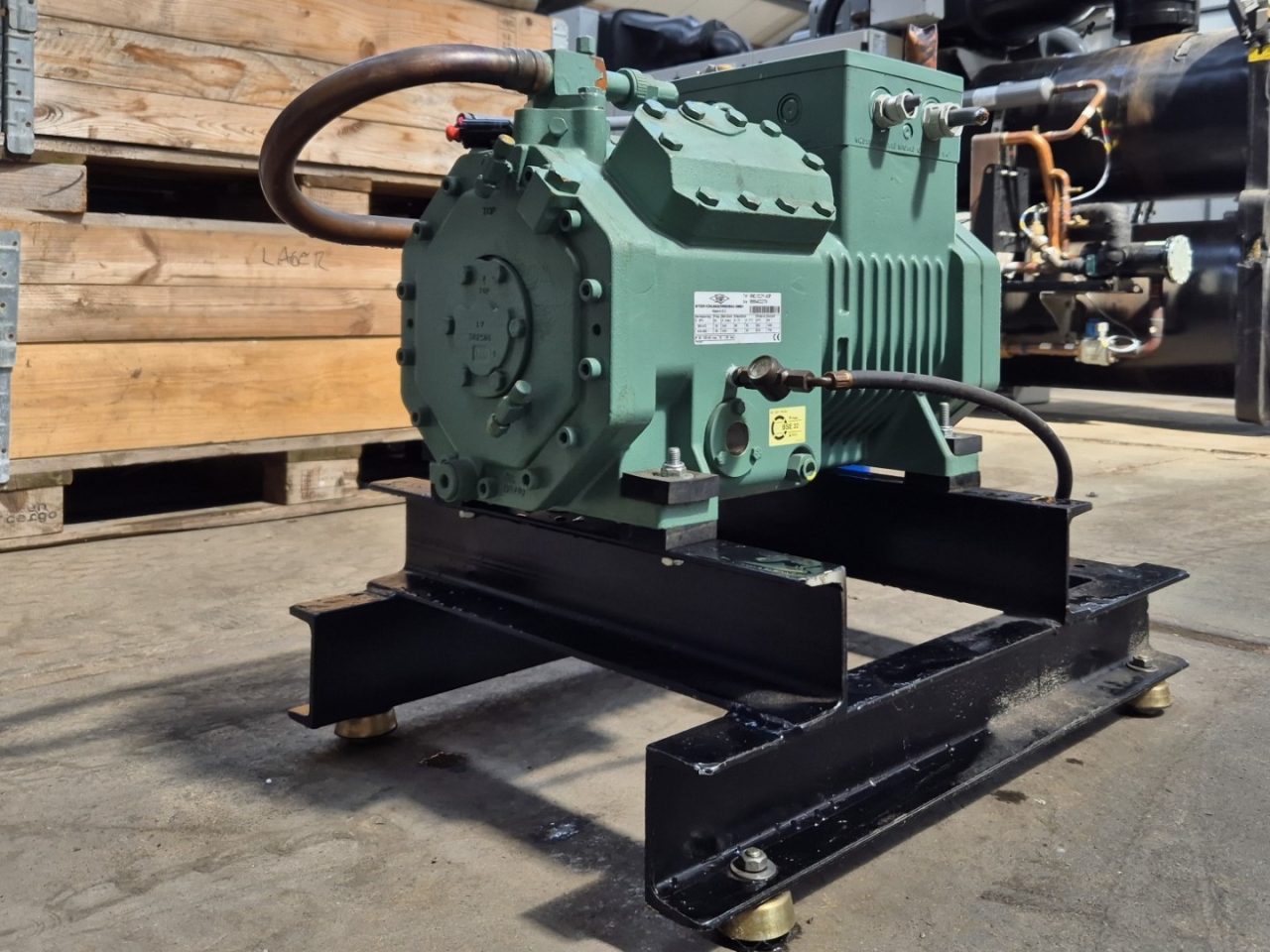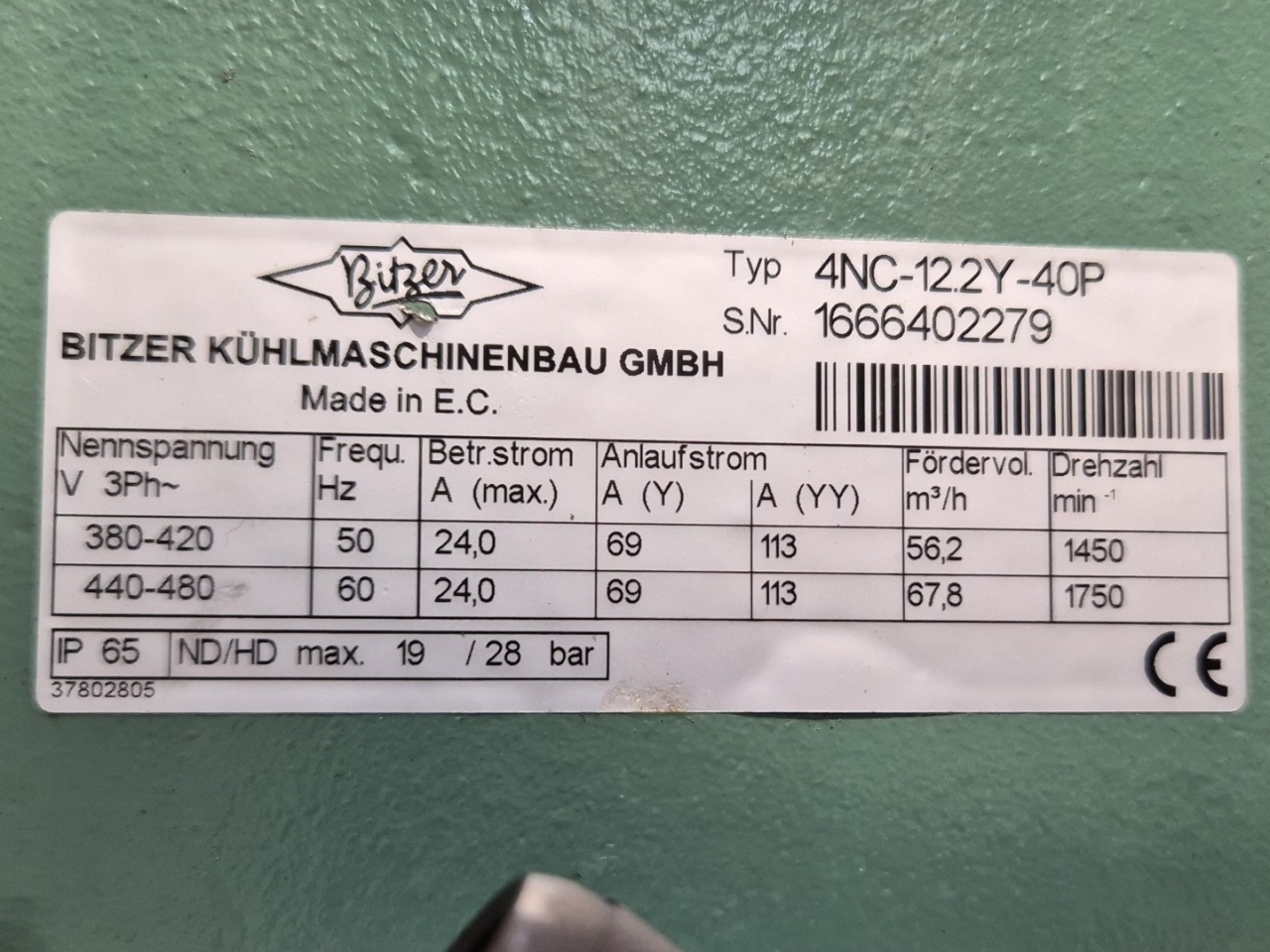 Used Bitzer 4NC-12.2Y-40P semi-hermetic reciprocating compressor on Freon with an oil separator. The compressor has a displacement of 56,2 m³/h at 50 Hz & 67,8 m³/h at 60 Hz.