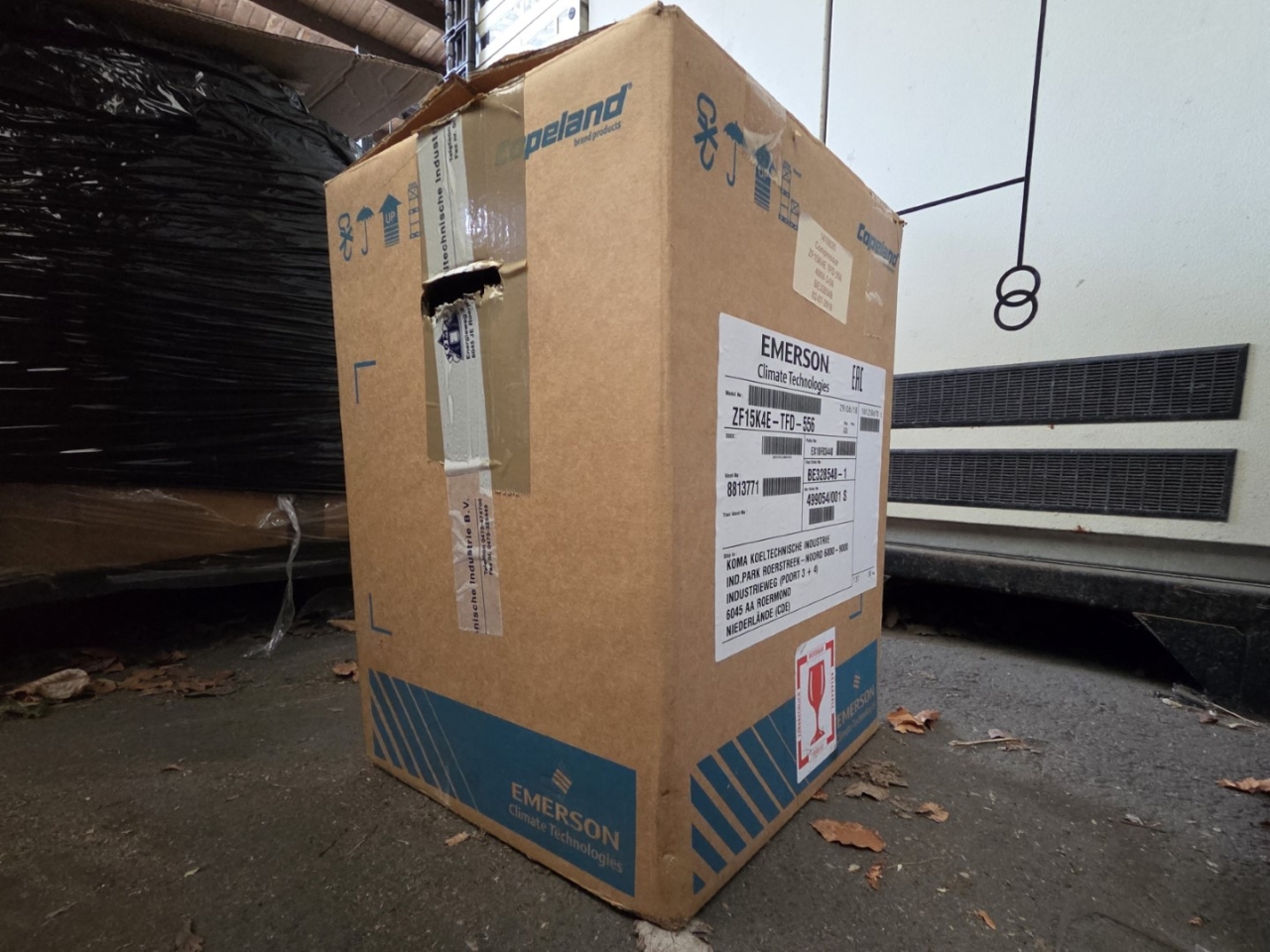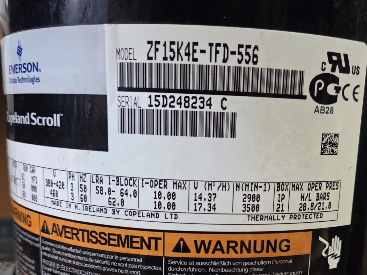 New in box Copeland ZF15K4E-TWD-556 scroll compressor on Freon with a displacement of 14,4 m³/h at 50 Hz & 17,3 m³/h at 60 Hz.