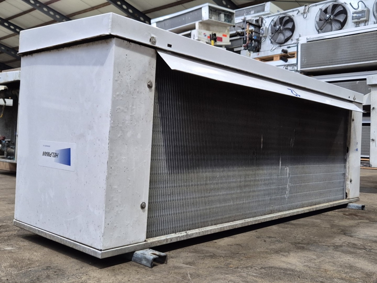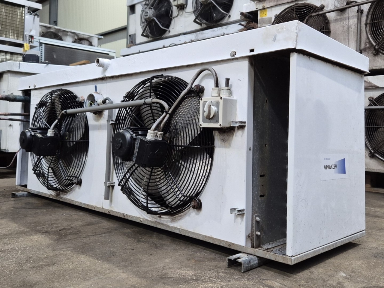 Used Helpman LEX 20-7-HG Freon evaporator with hot gas defrost. Complete with 2 ATB RFT0,09/4-71 fans - 50/60 Hz - 0,09 kW - 1350/1610 RPM - diameter 406 mm and a total airflow of 7.080 m³/h.