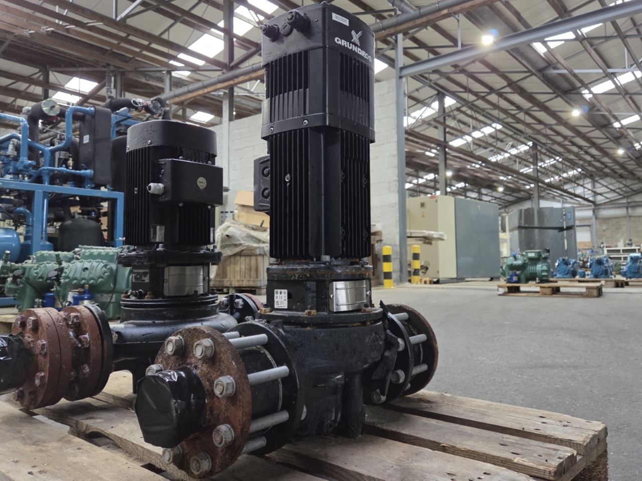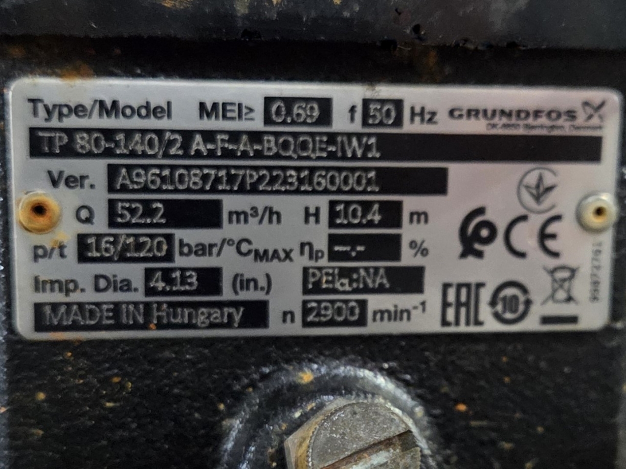 Used Grundfos TP 80-140/2 A-F-A-BQQE-IW1 water pump with a Grundfos MG90LE2-24FF165-H3 electromotor 50/60 Hz - 2,2 kW - 2890/2910 - 3480/3530 RPM. The pump has with the following specifications: Qmax: 52,2 m³/h - Hmax: 10,4 m - Pmax: 2,2 kW. Dimensions: 700x250x760 mm (LxWxH).