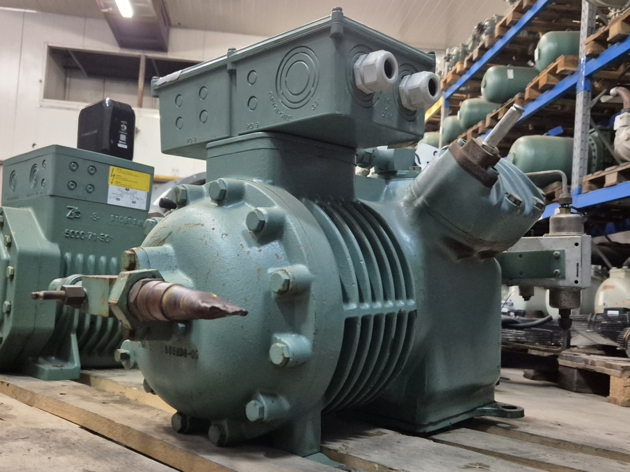 Used Bitzer 4P-10.2 semi-hermetic reciprocating compressor on Freon with a sight glass. The compressor has a displacement of 47,1 m³/h at 50 Hz.