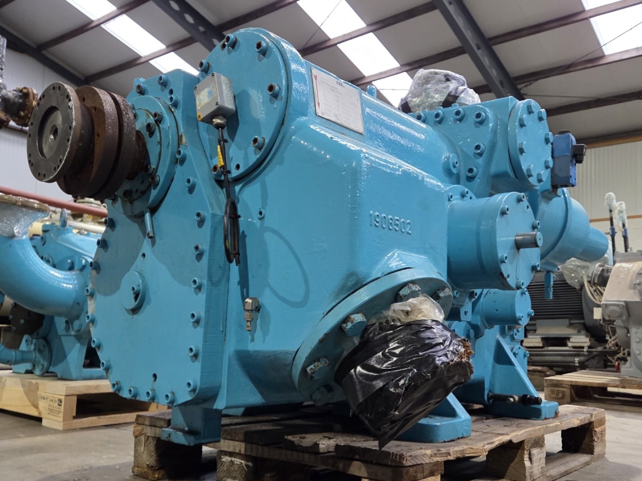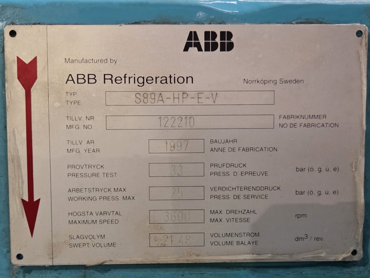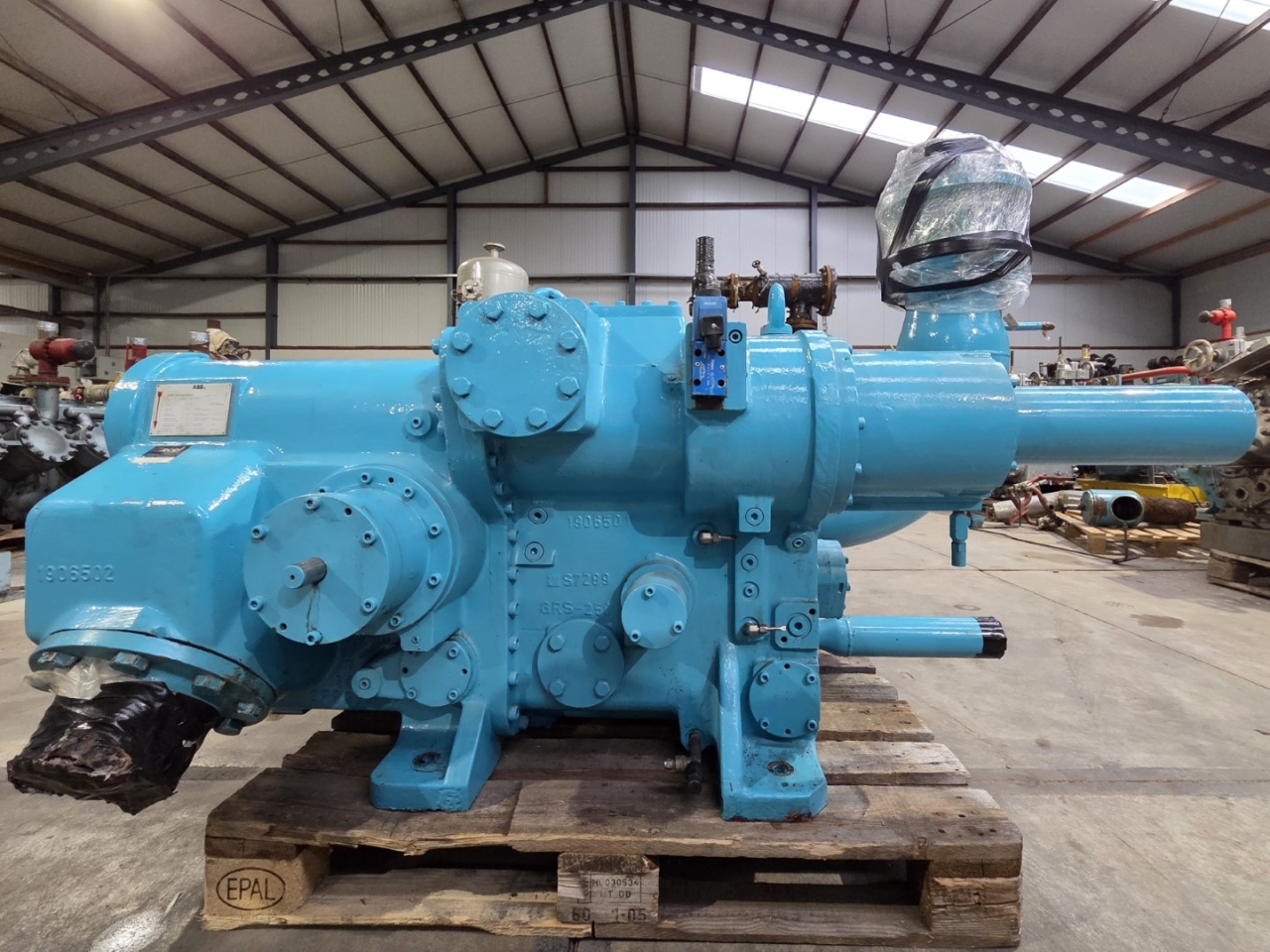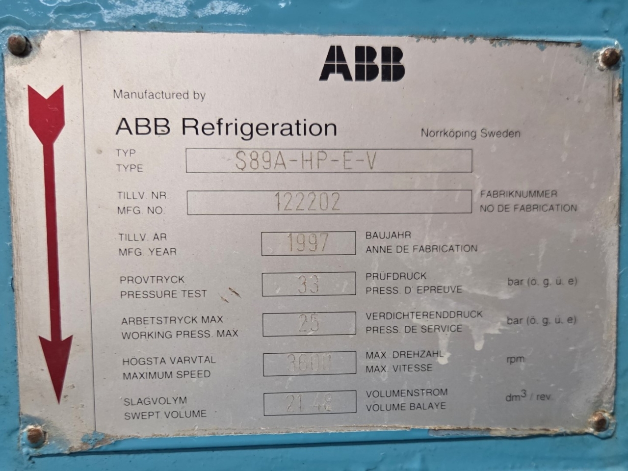 Used ABB Stal S89A-HP-E-V compressor skid on NH3 (Ammonia). The compressor has a displacement of 4639,7 m³/h. This compressor worked originally with the following electric motor from the brand Weg: 201076