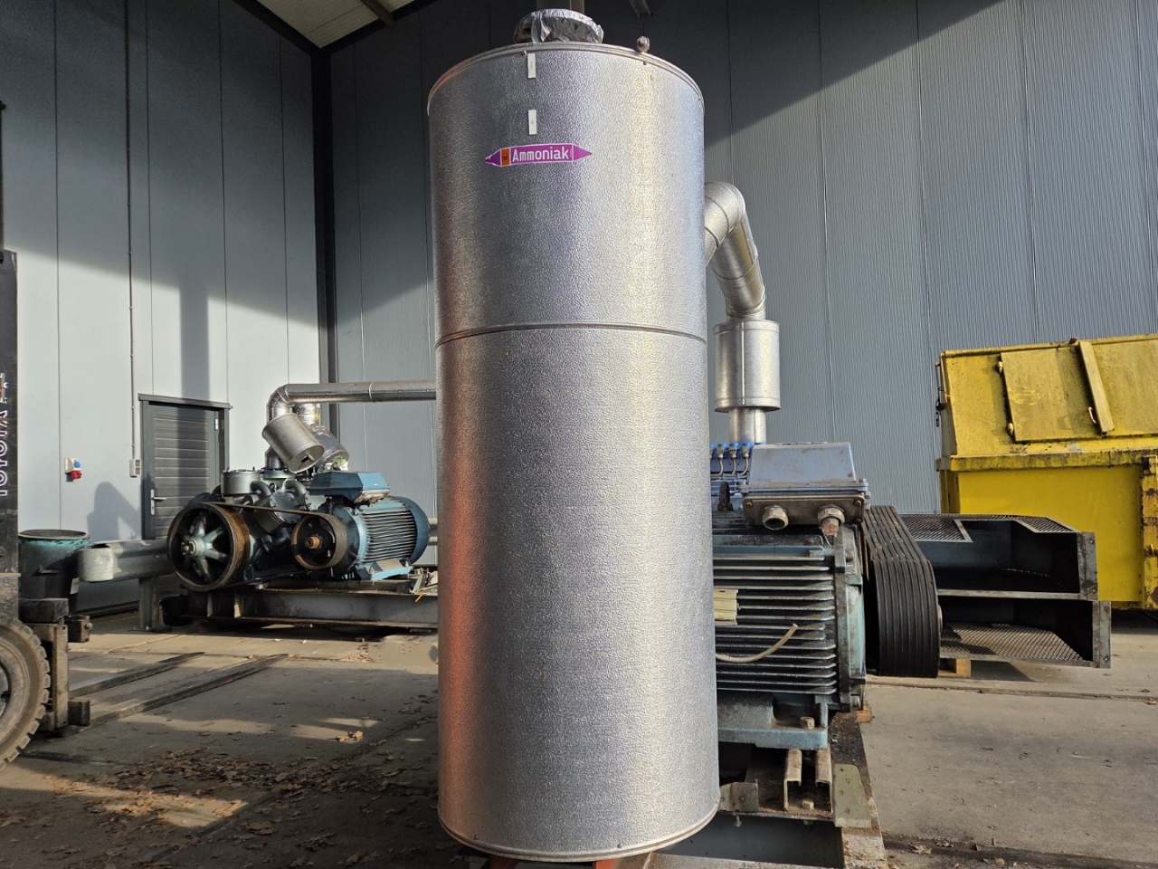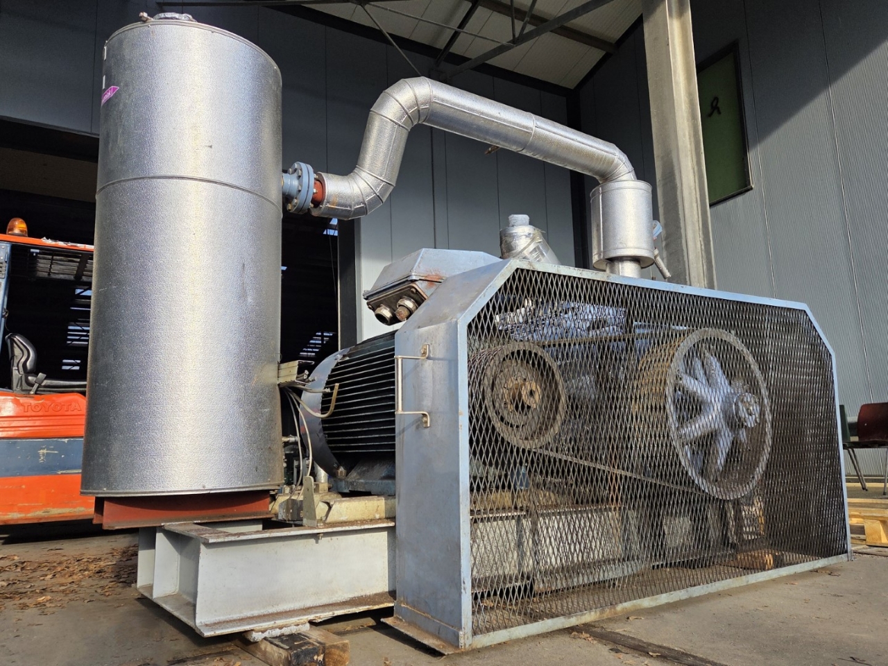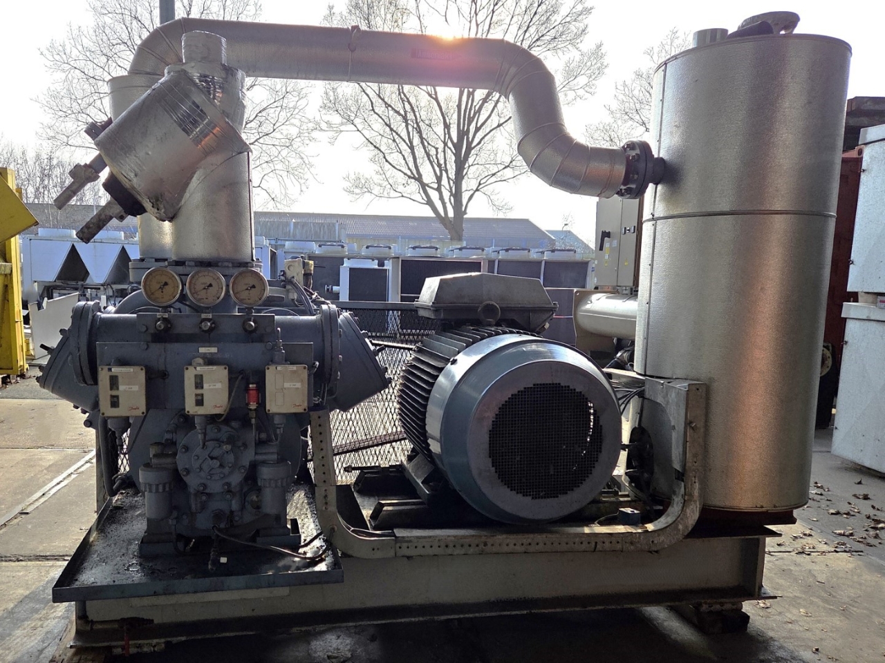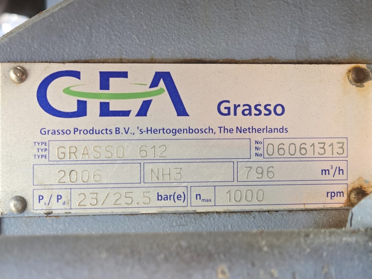 Used Grasso 612 single stage reciprocating compressor on NH3 (Ammonia). Complete with a ABB M3BAT 315 SMB 4 B3 electromotor: 50/60 Hz - 132/152 kW - 1485/1782 RPM, oil separator with a volume of 360 liters, pressure and safety switches/gauges. The compressor has a displacement of 796,0 m³/h.