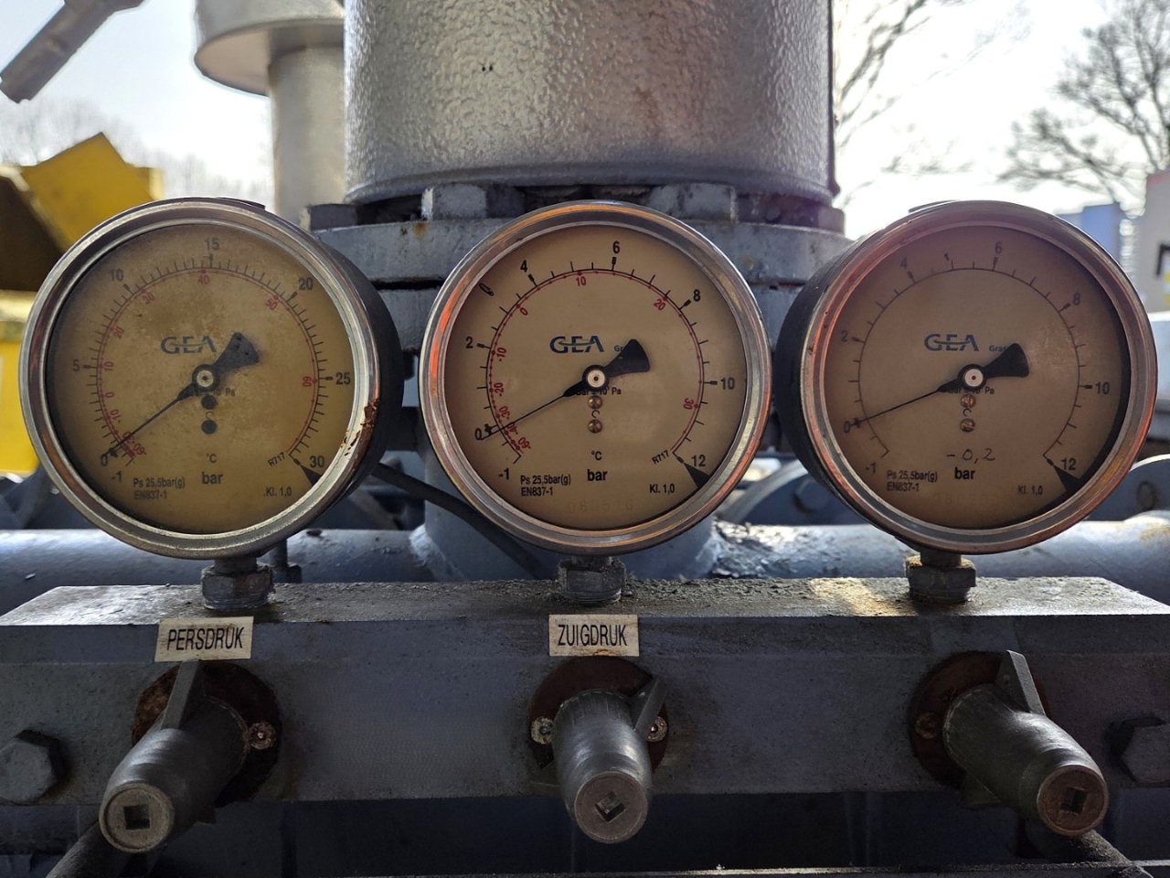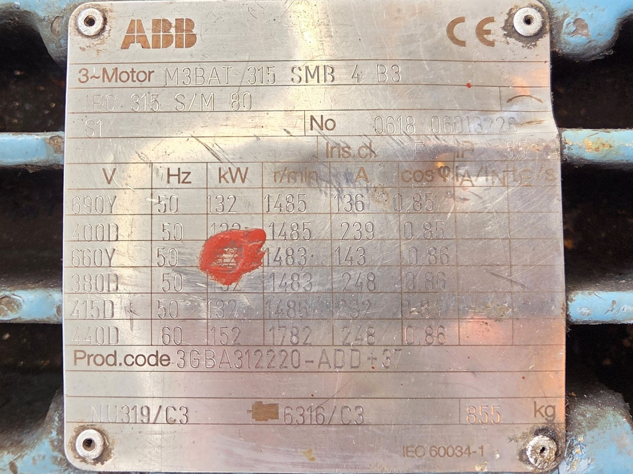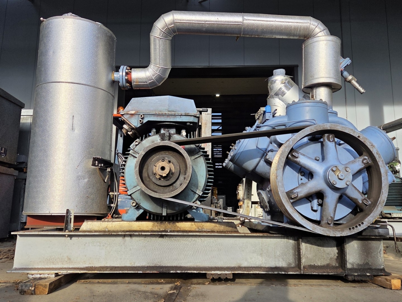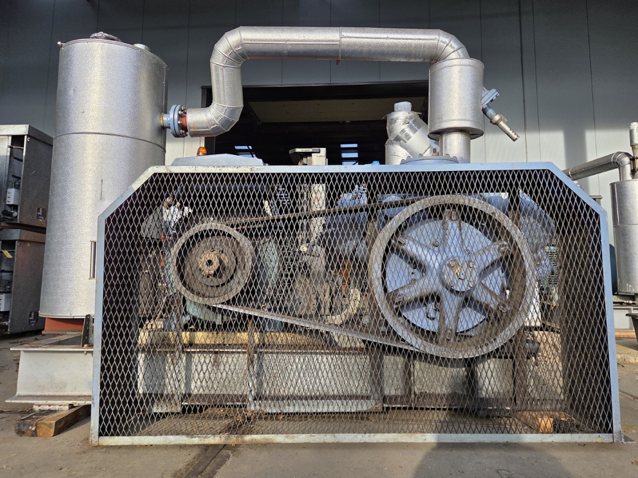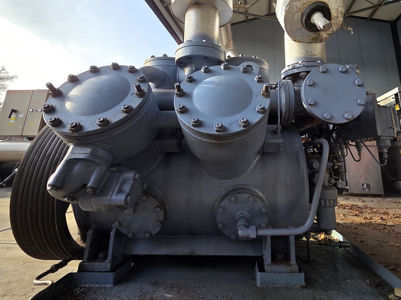 Used Grasso 612 single stage reciprocating compressor on NH3 (Ammonia). Complete with a ABB M3BAT 315 SMB 4 B3 electromotor: 50/60 Hz - 132/152 kW - 1485/1782 RPM, oil separator with a volume of 360 liters, pressure and safety switches/gauges. The compressor has a displacement of 796,0 m³/h.