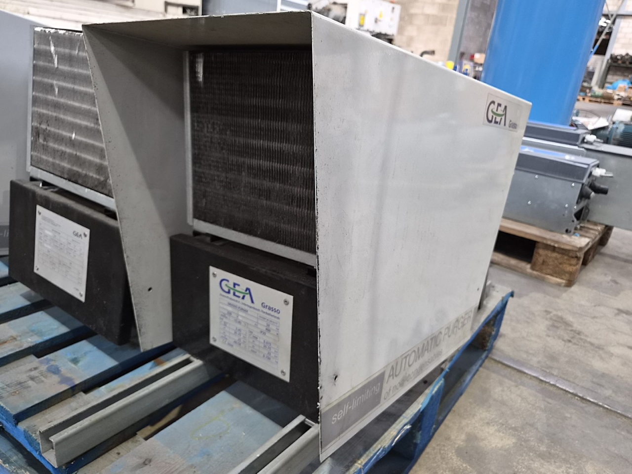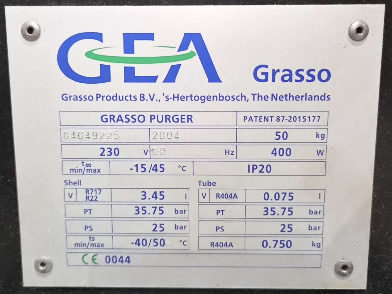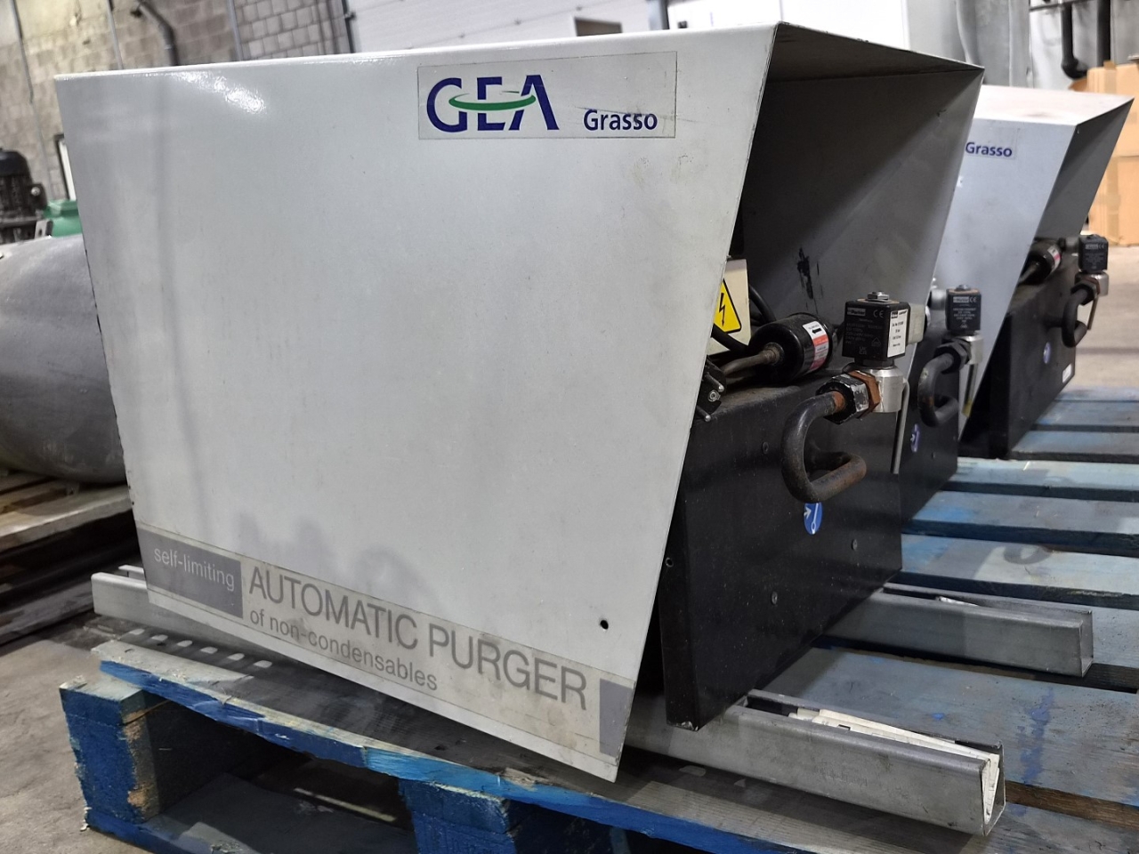 Used GEA Grasso Purger on R717/Freon with 400 W of power. Dimensions: 340x900x530 mm (LxWxH).