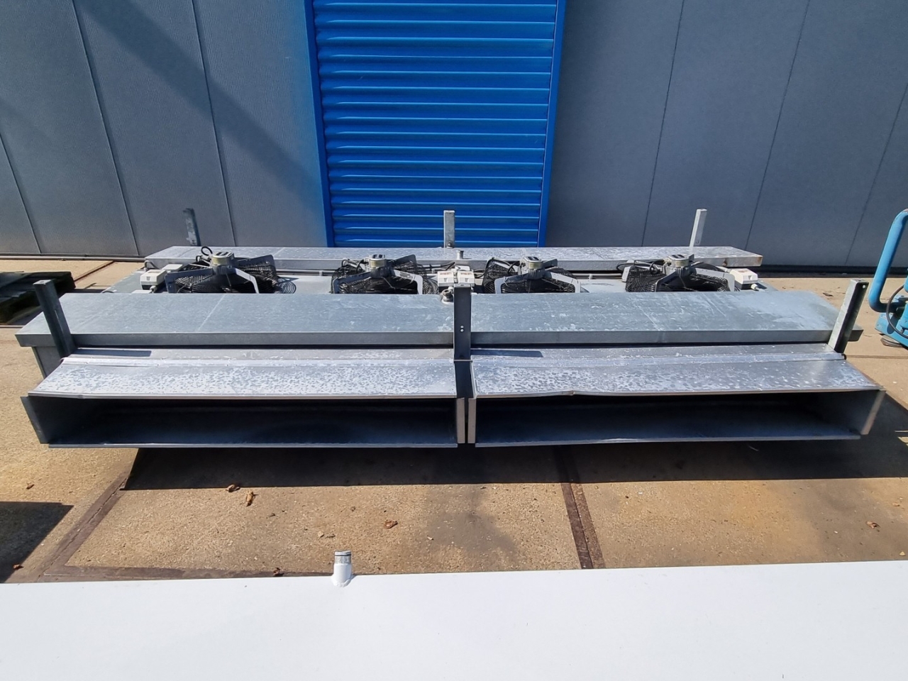 Used Goedhart DU.S 183 M2 double discharge evaporator on Freon with electric defrost. Complete with 4 Woods GE823413 500mm fans - 50 Hz - 0,45 kW - 1360 RPM - diameter 500 mm and a total airflow of 32.100 m³/h.