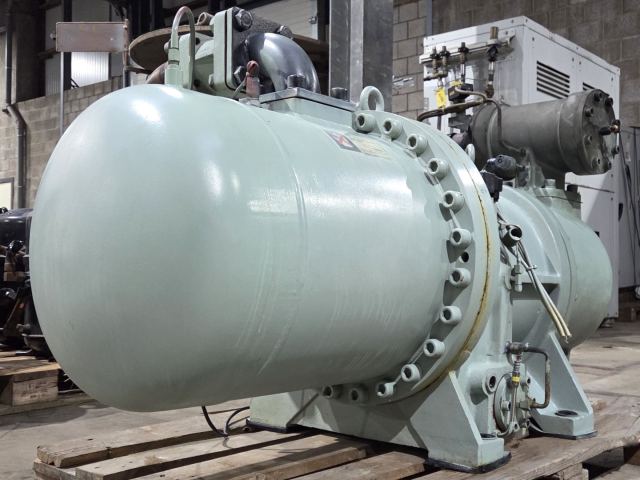Used Fu Sheng SR-5H screw compressor on Freon complete with a sight glass. The compressor has a displacement of 432,6 m³/h at 50 Hz & 519,1 m³/h at 60 Hz.