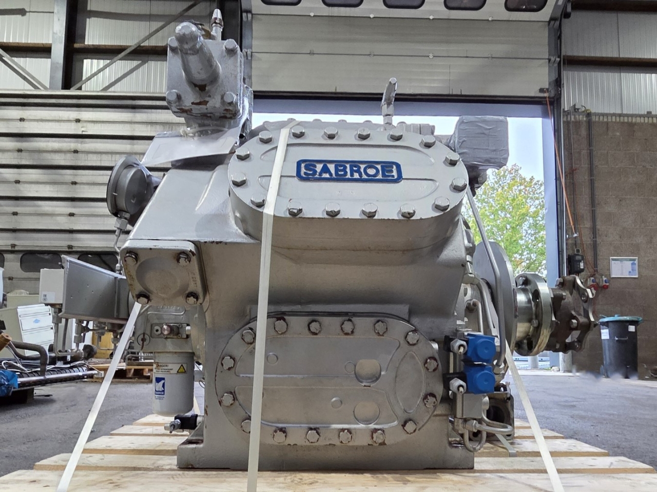 Used Sabroe SMC 106 S reciprocating compressor on Freon. Complete with a pressure safety switches/gauges and a sight glass. The compressor has a displacement of 339 m³/h. This compressor worked originally with the following electric motor from the brand Schorch: 201071