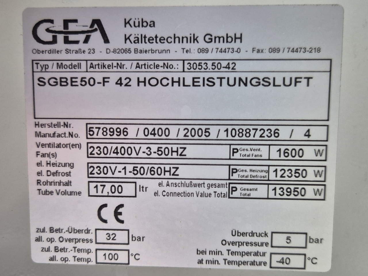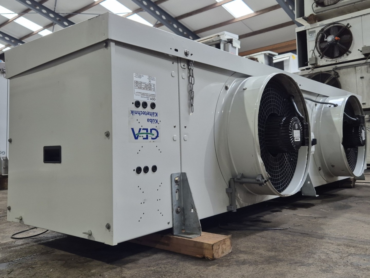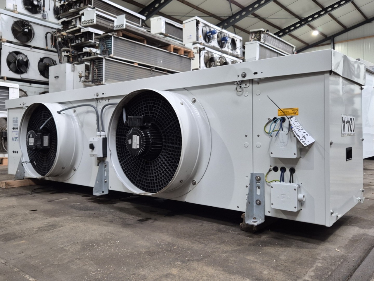 Used Kuba SGBE 50-F 42 Freon evaporator with electric defrost. Complete with 2 Süd-Electric MDA-H2045-N4N-M fans - 50/60 Hz - 0,80/0,90 kW - 1400/1680 RPM - diameter 500 mm.