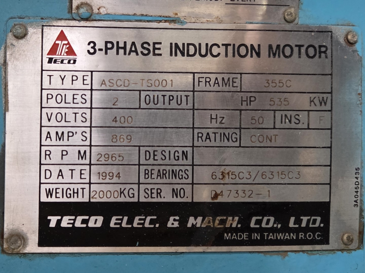 Used Teco ACSD-TS001 electric motor with the following specifications: 50 Hz - 535 kW - 2965 RPM.
