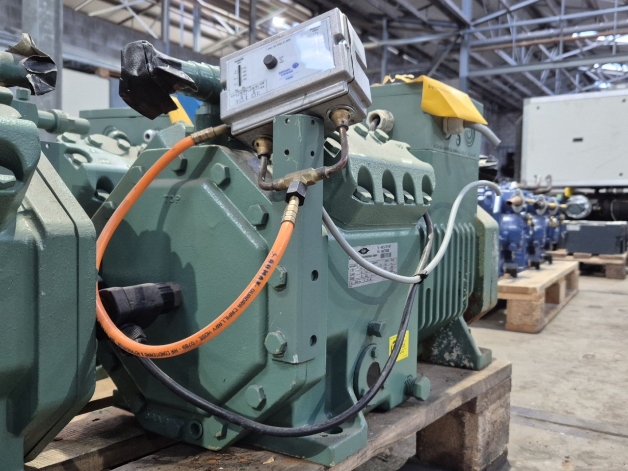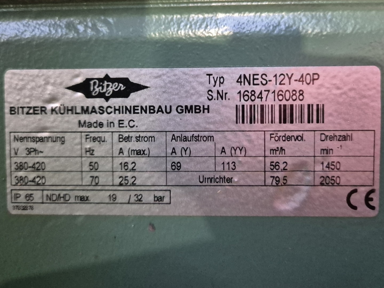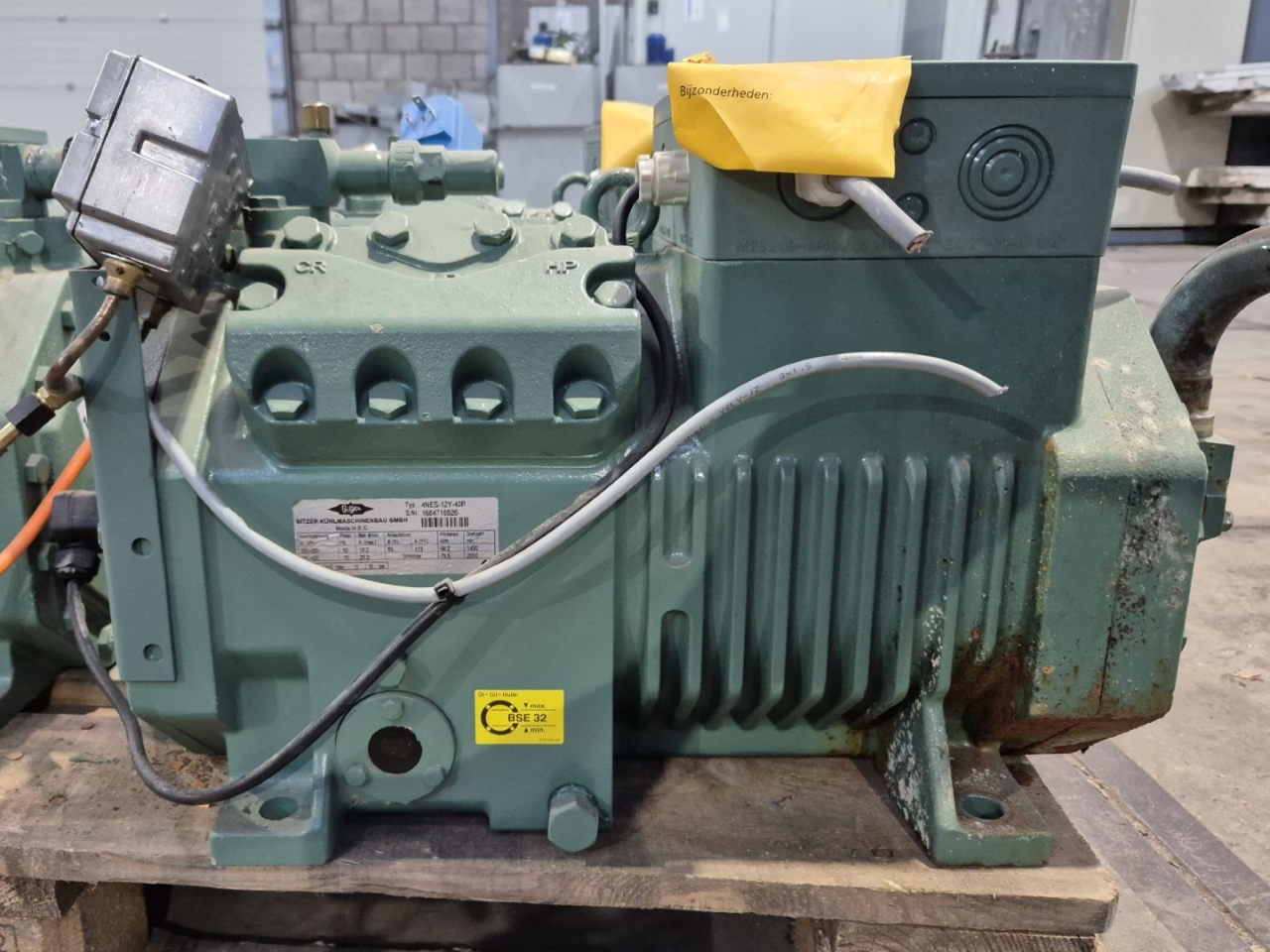 Used Bitzer 4NES-12Y-40P semi-hermetic reciprocating compressor on Freon with a sight glass and capacity control. The compressor has a displacement of 56,2 m³/h at 50 Hz & 79,5 m³/h at 70 Hz.