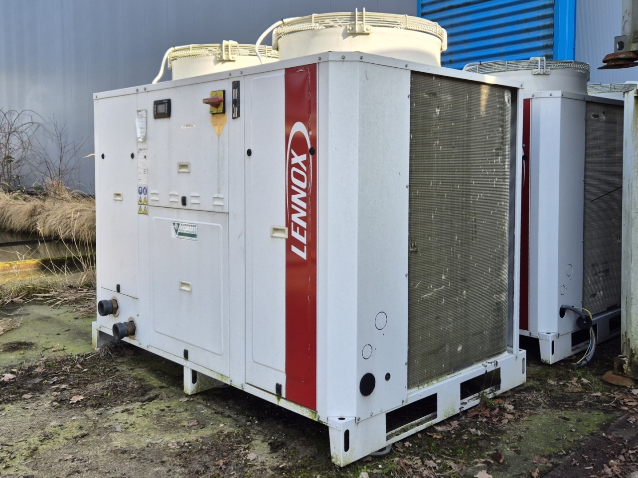 Used Lennox EAR0672SM4HY reversible air cooled chiller / heat pump on R410A. Complete with 2 Copeland ZP154KCE-TFD-455 scroll compressors, condenser with 2 Ziehl-Abegg FN071-SDQ.6F.V7P1 fans - 50 Hz - 0,94/0,62 kW - 900/690 RPM - diameter 710 mm, brazed heat exchanger as evaporator, Grundfos CM10-2- A-R-A-E-AQQE F-A-A-N water pump, Tecnac DVC-180-11 liquid receiver, liquid line filter drier and a control cabinet with a Lennox DC Advanced controller. The chillers have hardly been used.