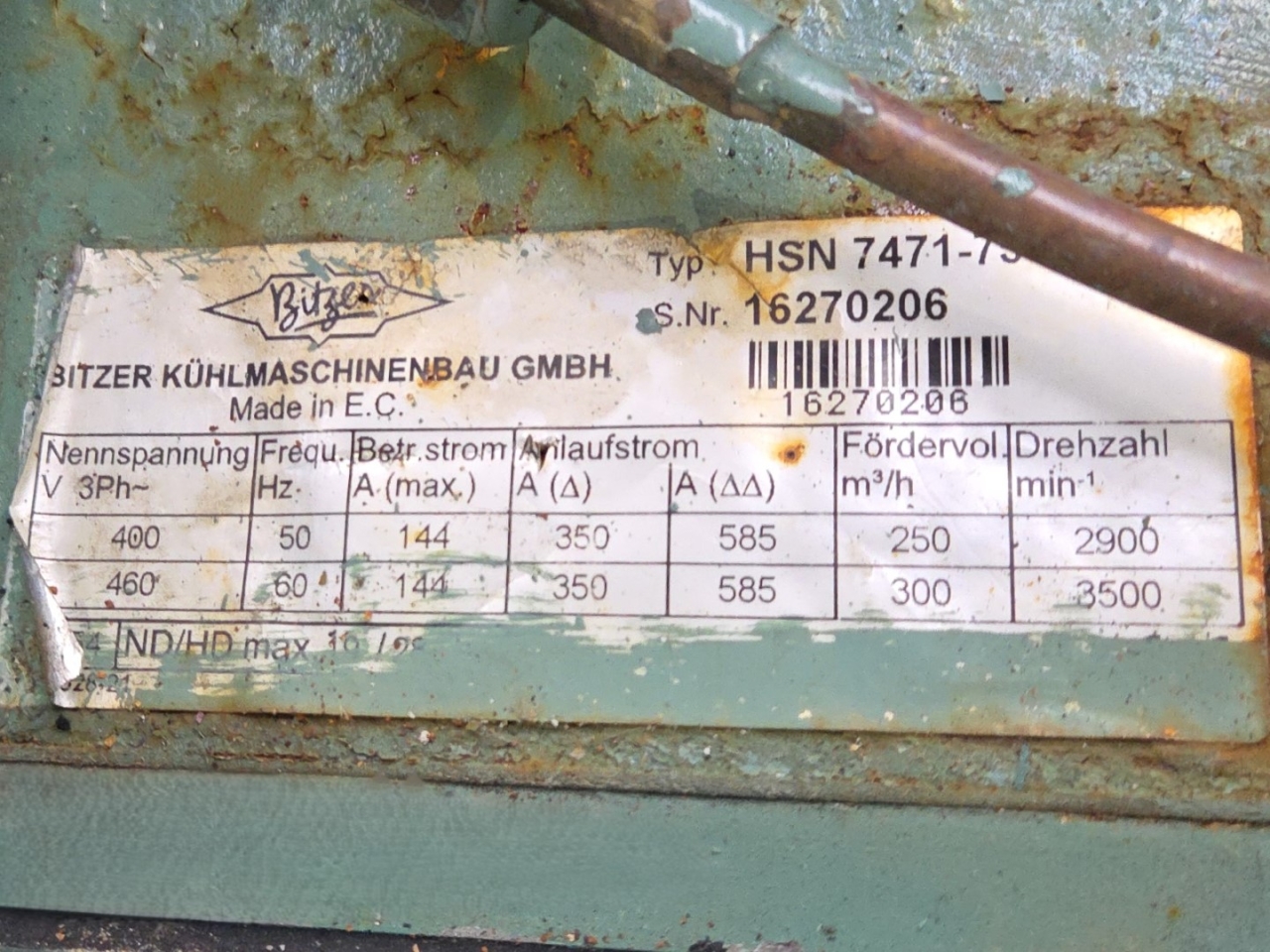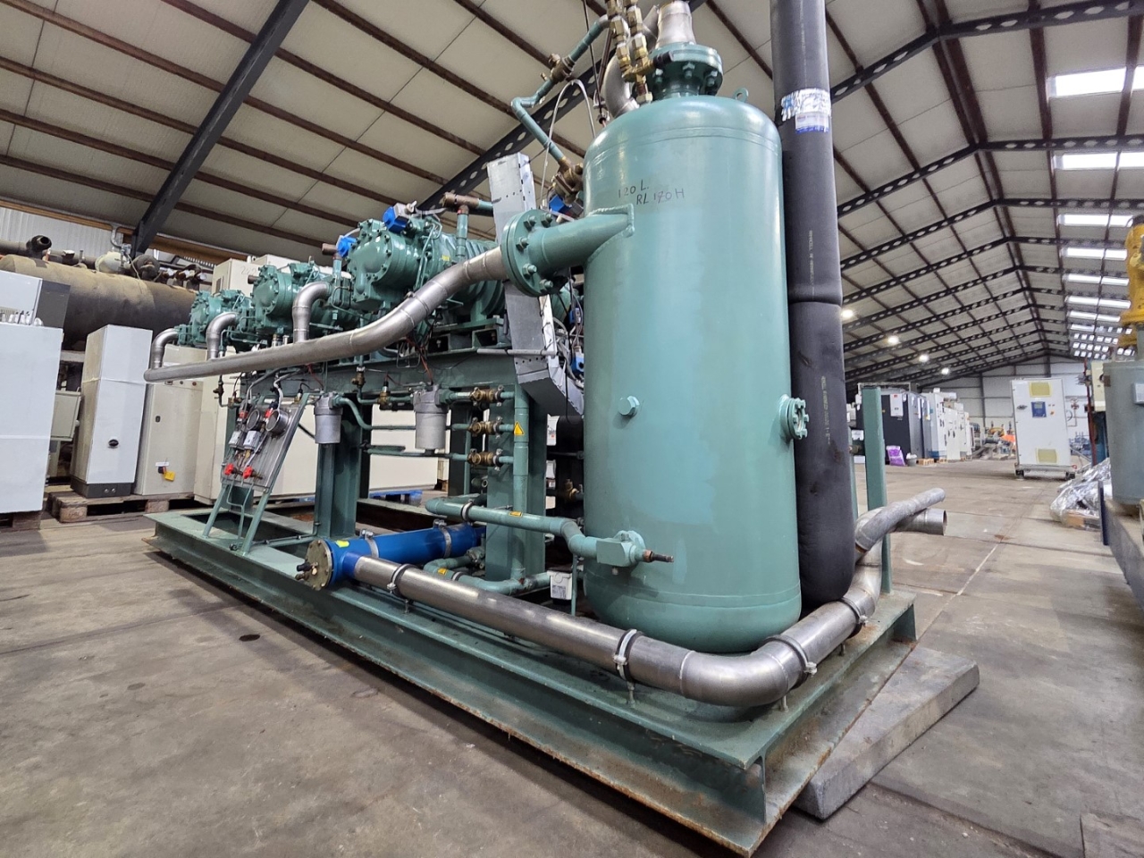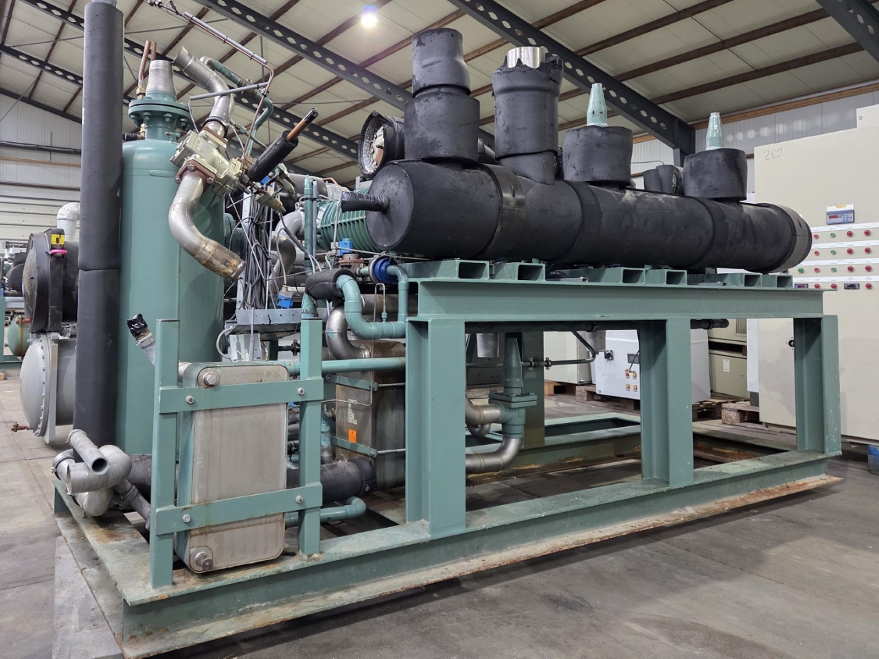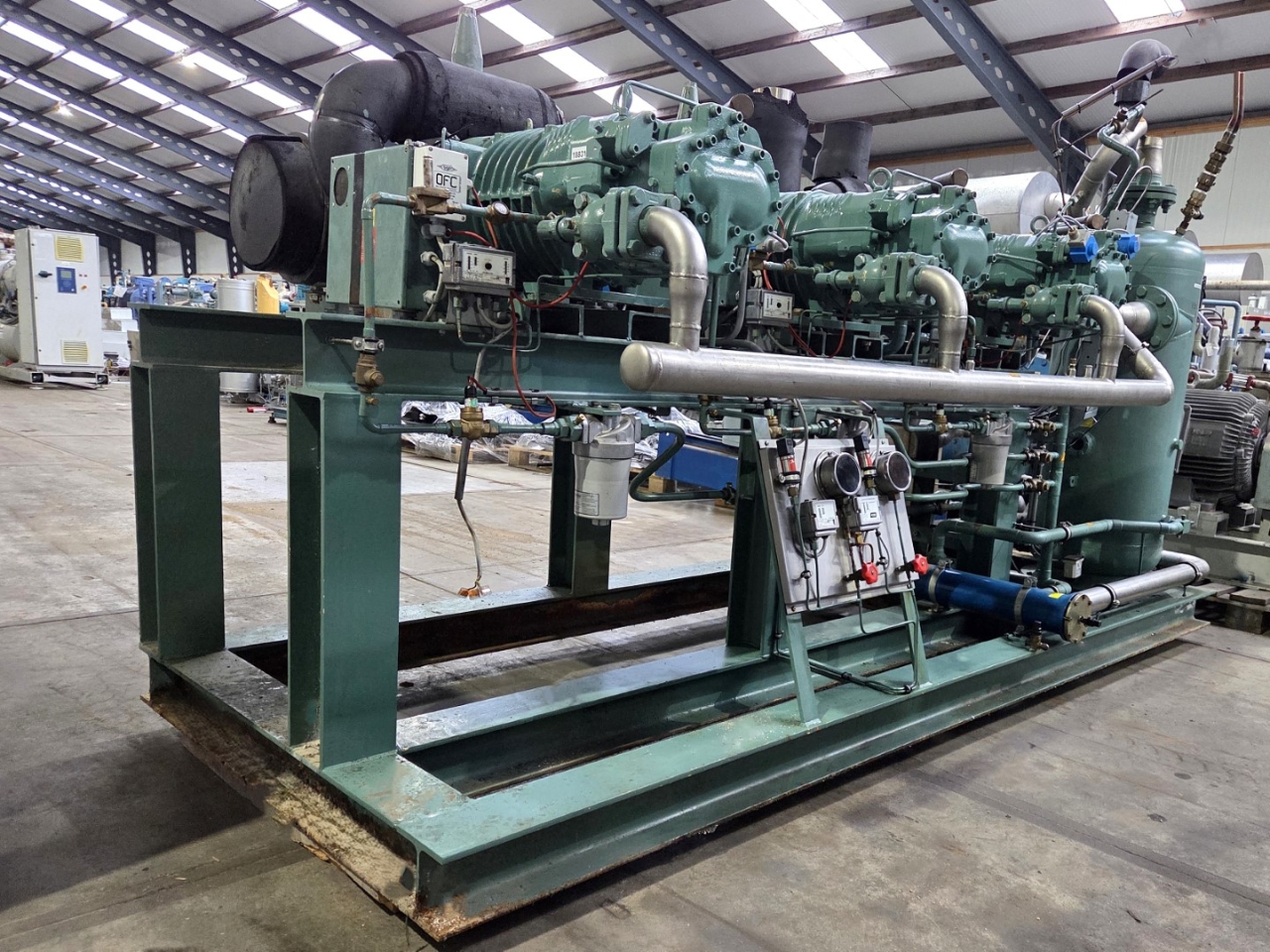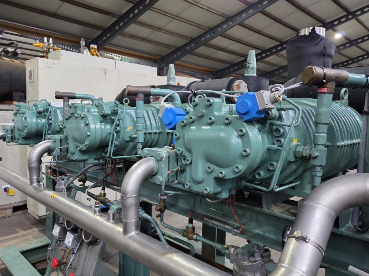 Used Bitzer HSN 7471-75 (x3) semi-hermetic screw compressors rack on Freon. Complete with Gea 2266950-V1 liquid receiver wiith a volume of 510 liters, Bitzer 0A 8011 oil separator with a volume of 228 liters, WTT GmbH WP-AE 8M-60 brazed heat exchanger as economizer, WTT GmbH WP 7L-50 brazed heat exchanger for heat recovery, pressure safety switches/gauges and control cabinet. The compressors have a displacement of 750 m³/h at 50 Hz & 900 m³/h at 60 Hz.