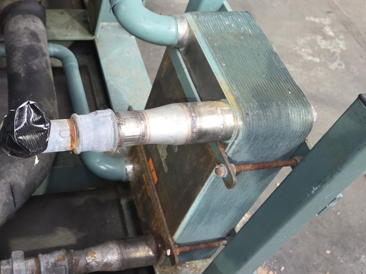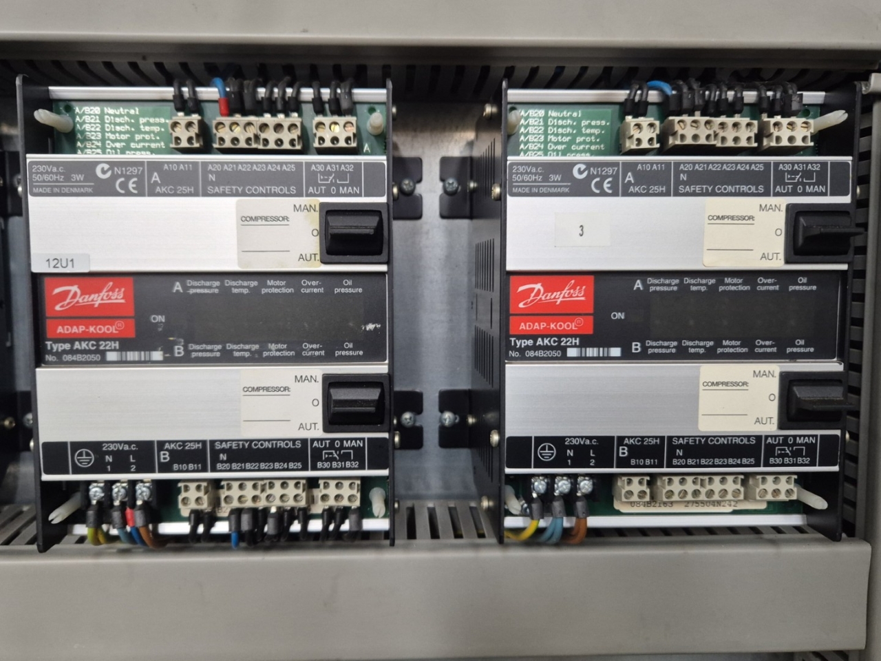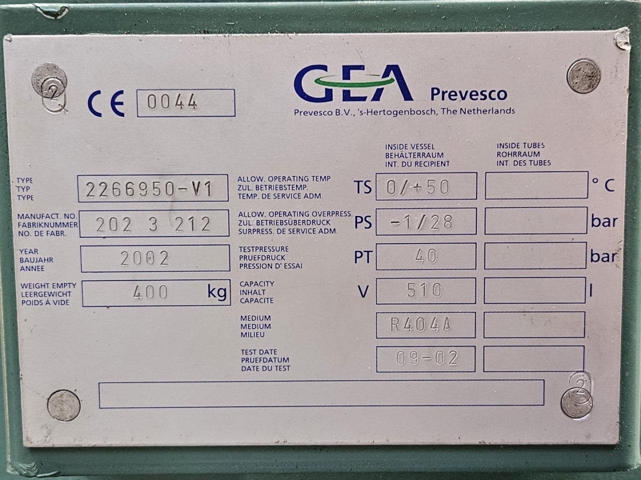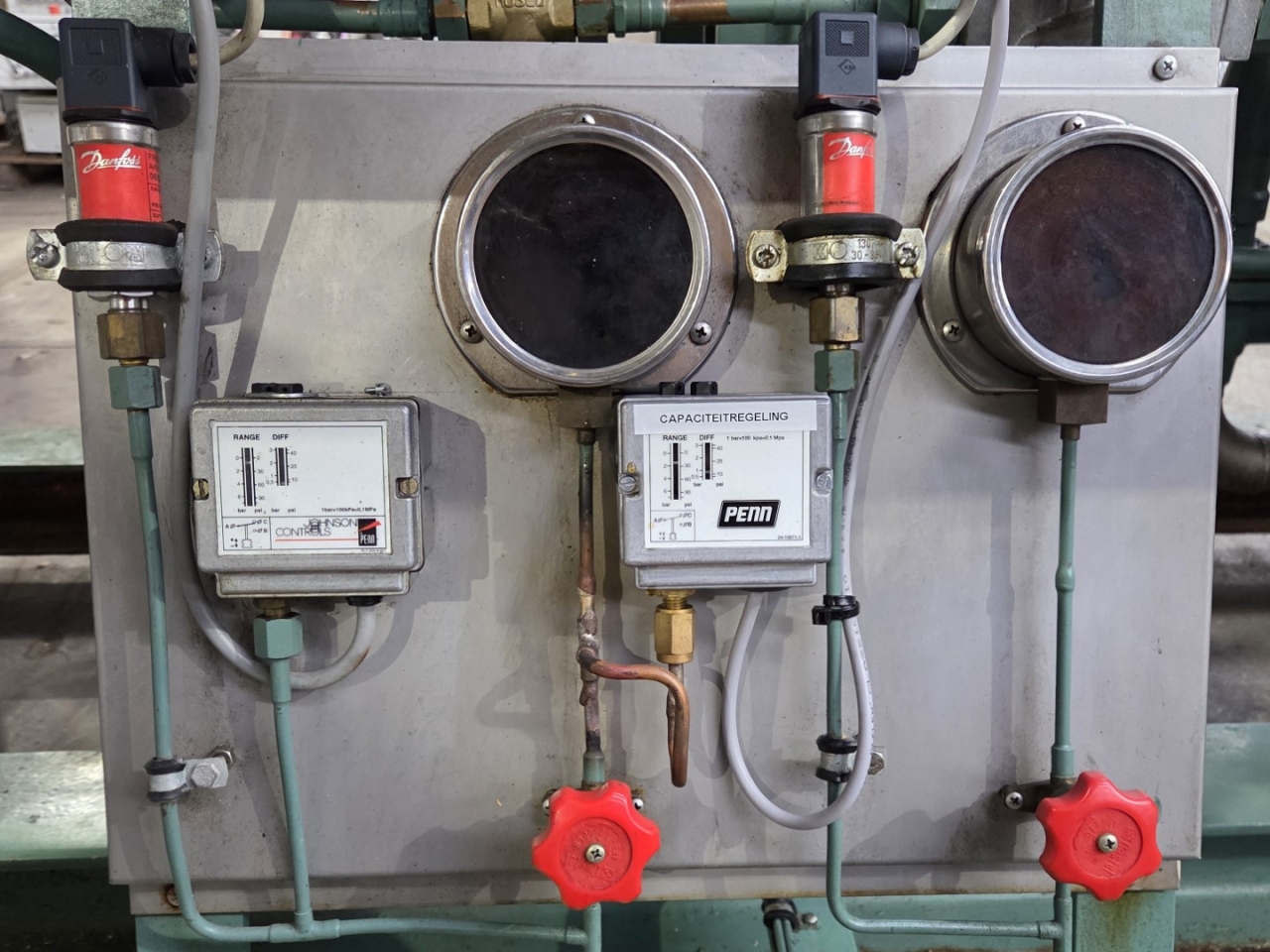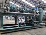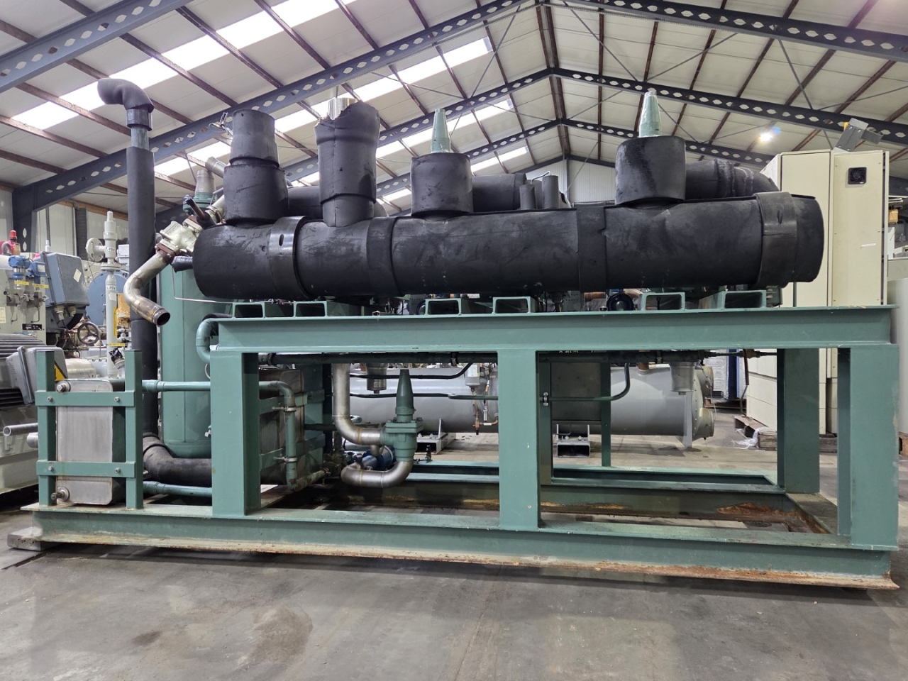 Used Bitzer HSN 7471-75 (x3) semi-hermetic screw compressors rack on Freon. Complete with Gea 2266950-V1 liquid receiver wiith a volume of 510 liters, Bitzer 0A 8011 oil separator with a volume of 228 liters, WTT GmbH WP-AE 8M-60 brazed heat exchanger as economizer, WTT GmbH WP 7L-50 brazed heat exchanger for heat recovery, pressure safety switches/gauges and control cabinet. The compressors have a displacement of 750 m³/h at 50 Hz & 900 m³/h at 60 Hz.