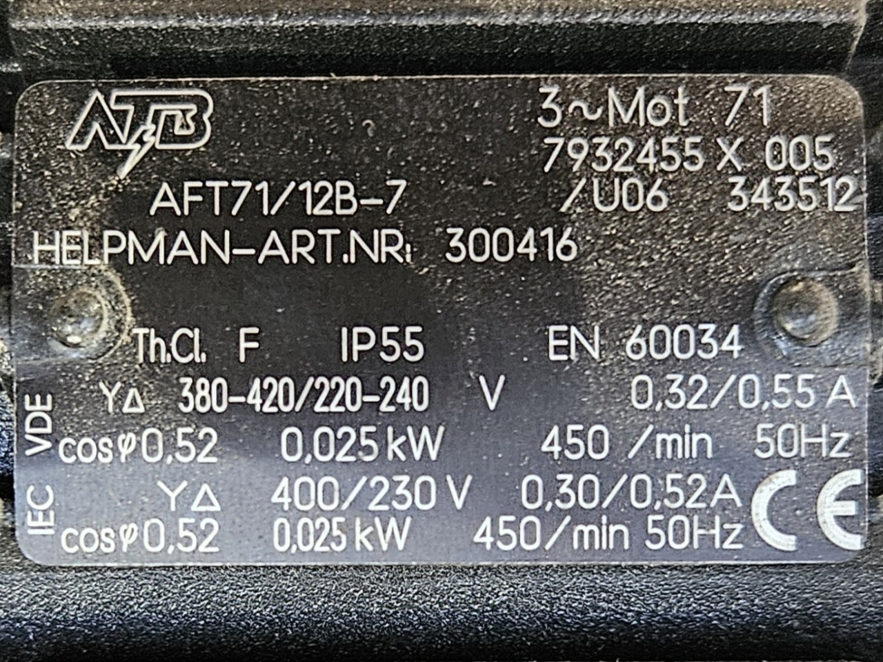 Used ATB AFT 71/12B-7 fan motor with the following specifications: 50 Hz - 0,035 kW - 450 RPM.