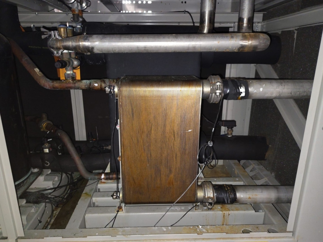 Used Daikin EWWQ380L-SS023 water cooled chiller on R410A built in 2021. Complete with 4 Copeland ZP385KCE-TWD-522 scroll compressors, 2 brazed heat exchangers as condenser, 1 brazed heat exchanger as evaporator and a control cabinet with a Siemens controller.
