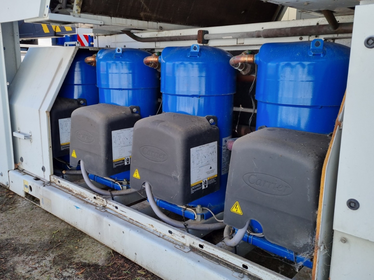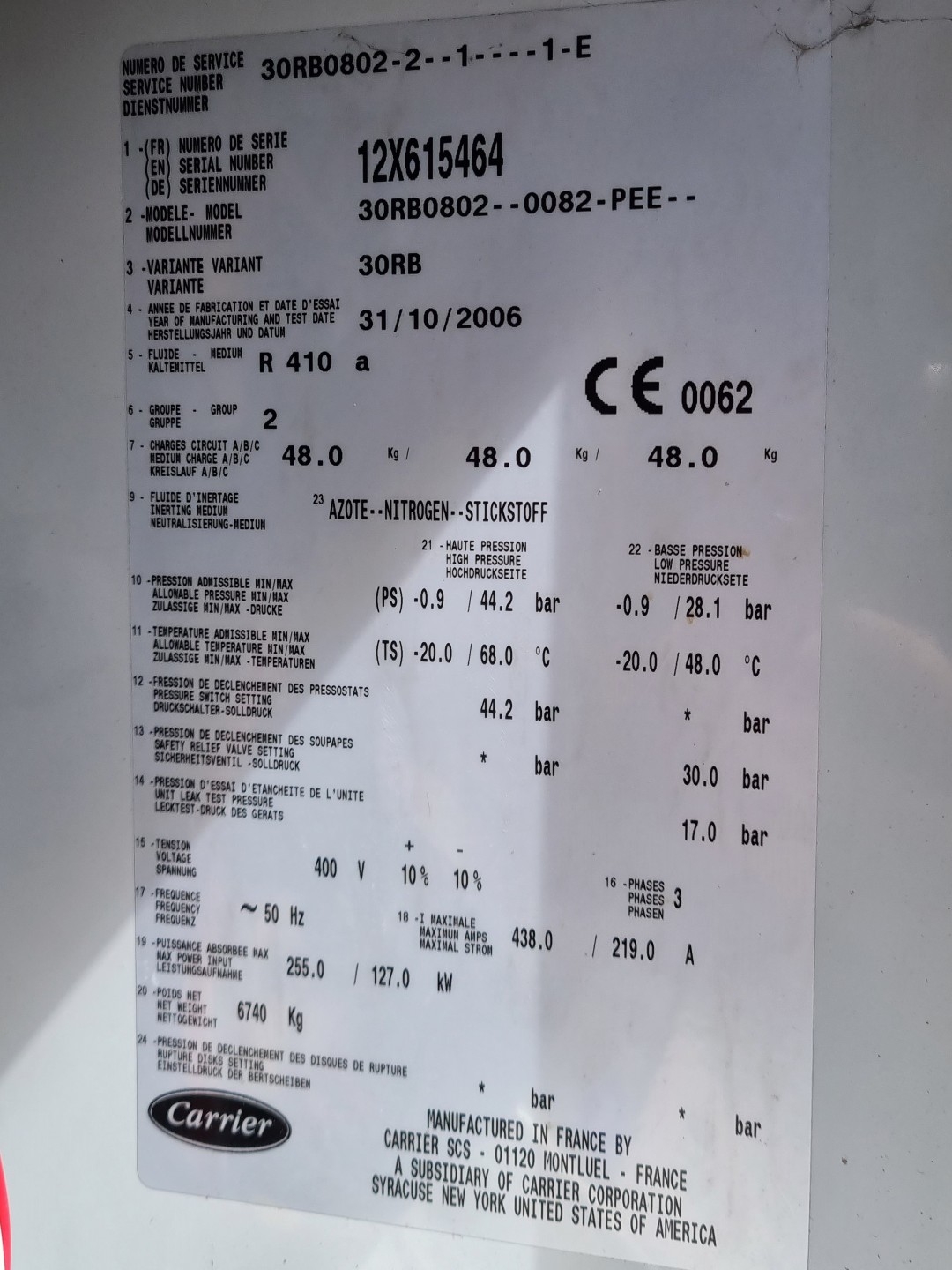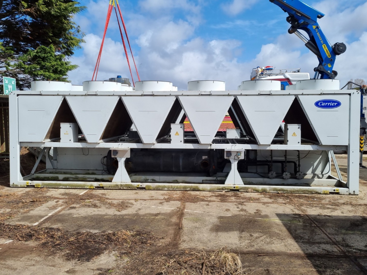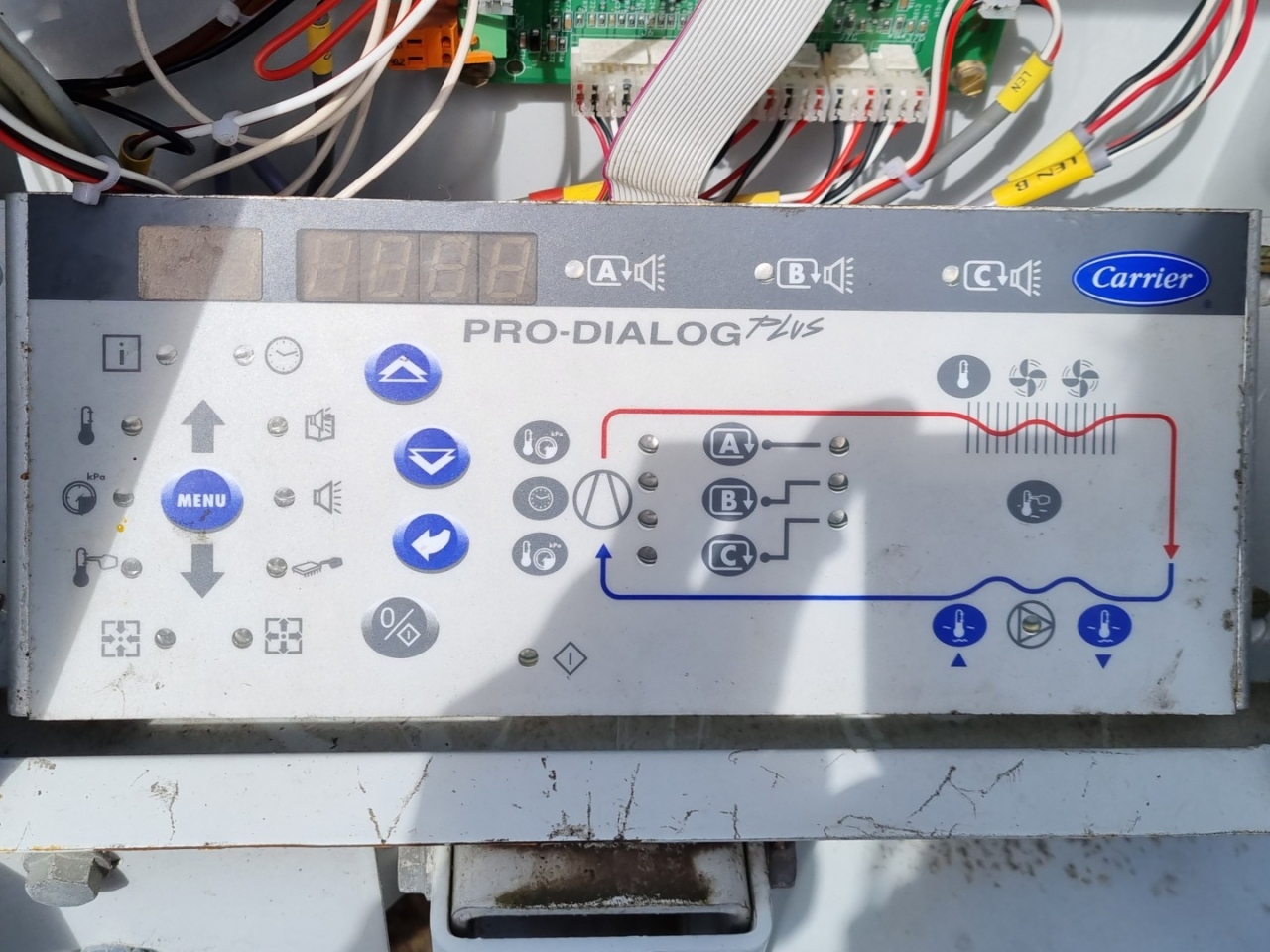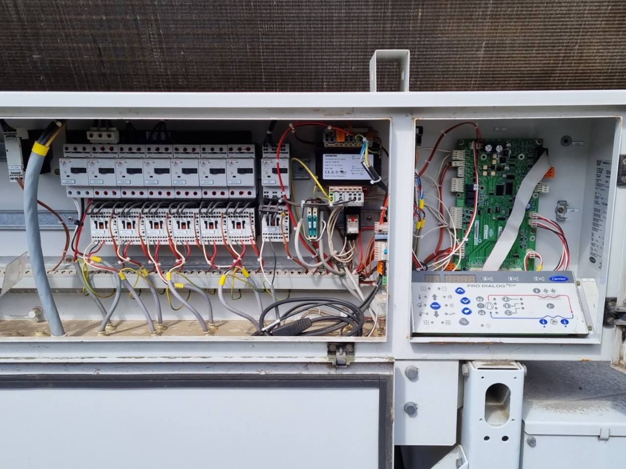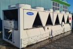 Gebruikte Carrier 30 RB 0802 luchtgekoelde chiller. Compleet met 12 Performer scroll-compressoren SH300A4ACA. Shell & tube verdamper/wisselaar 284 ltr. Koper/alu condensor met 12 axiale ventilatoren met een totale luchtstroom van 54.167 l/s en Pro-dialog plus regeling.