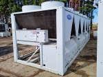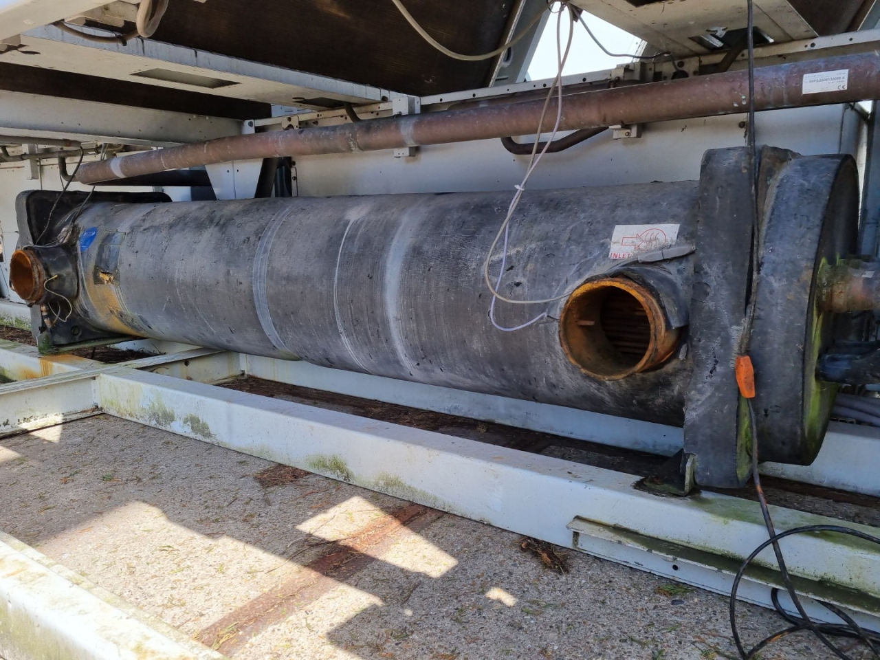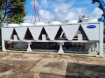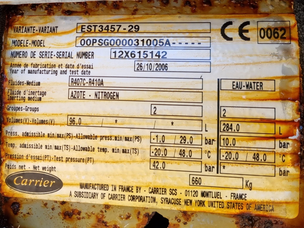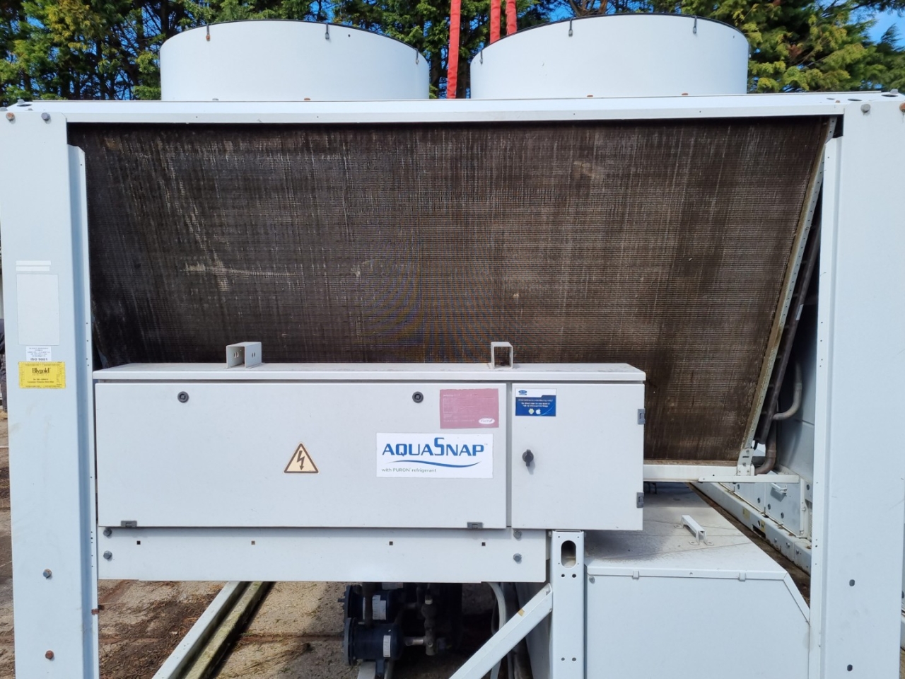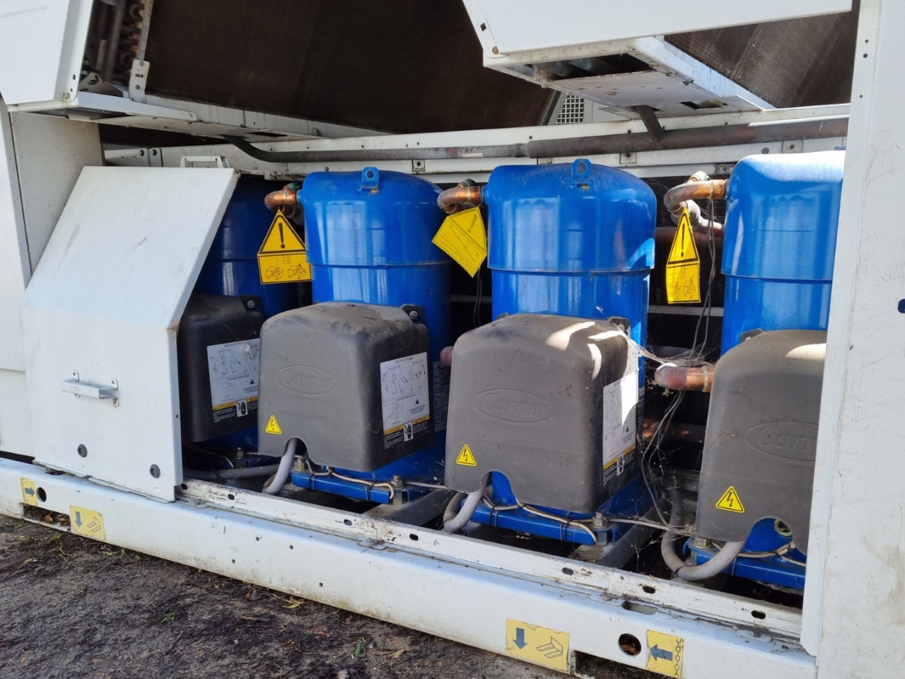 Gebruikte Carrier 30 RB 0802 luchtgekoelde chiller. Compleet met 12 Performer scroll-compressoren SH300A4ACA. Shell & tube verdamper/wisselaar 284 ltr. Koper/alu condensor met 12 axiale ventilatoren met een totale luchtstroom van 54.167 l/s en Pro-dialog plus regeling.