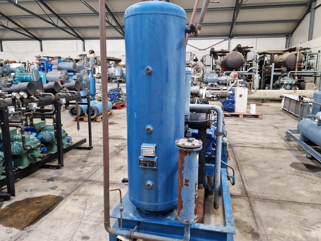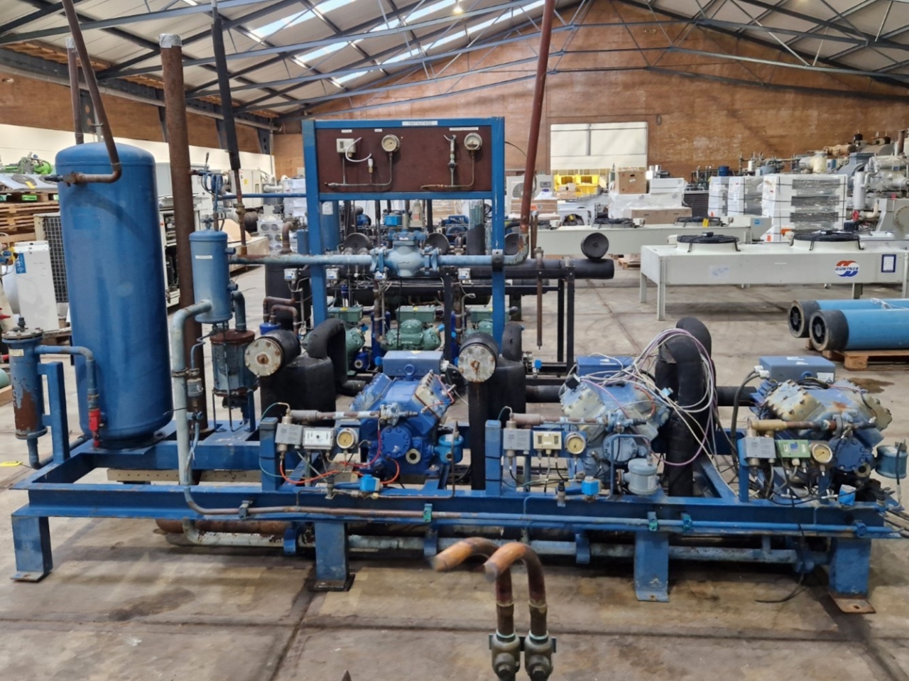 Gebruikt Bock HGX5/830-4 (x1) & HG5/830-4 S (x1) & HGX5/945-4 S (x1) compressorrek op Freon. Compleet met olieafscheider, olie-ontvanger, druk- en veiligheidsschakelaars/meters, oliepeilsysteem AC&R en kijkglazen. De compressoren hebben een totale cilinderinhoud van 226,6 m³/h bij 1450 tpm.