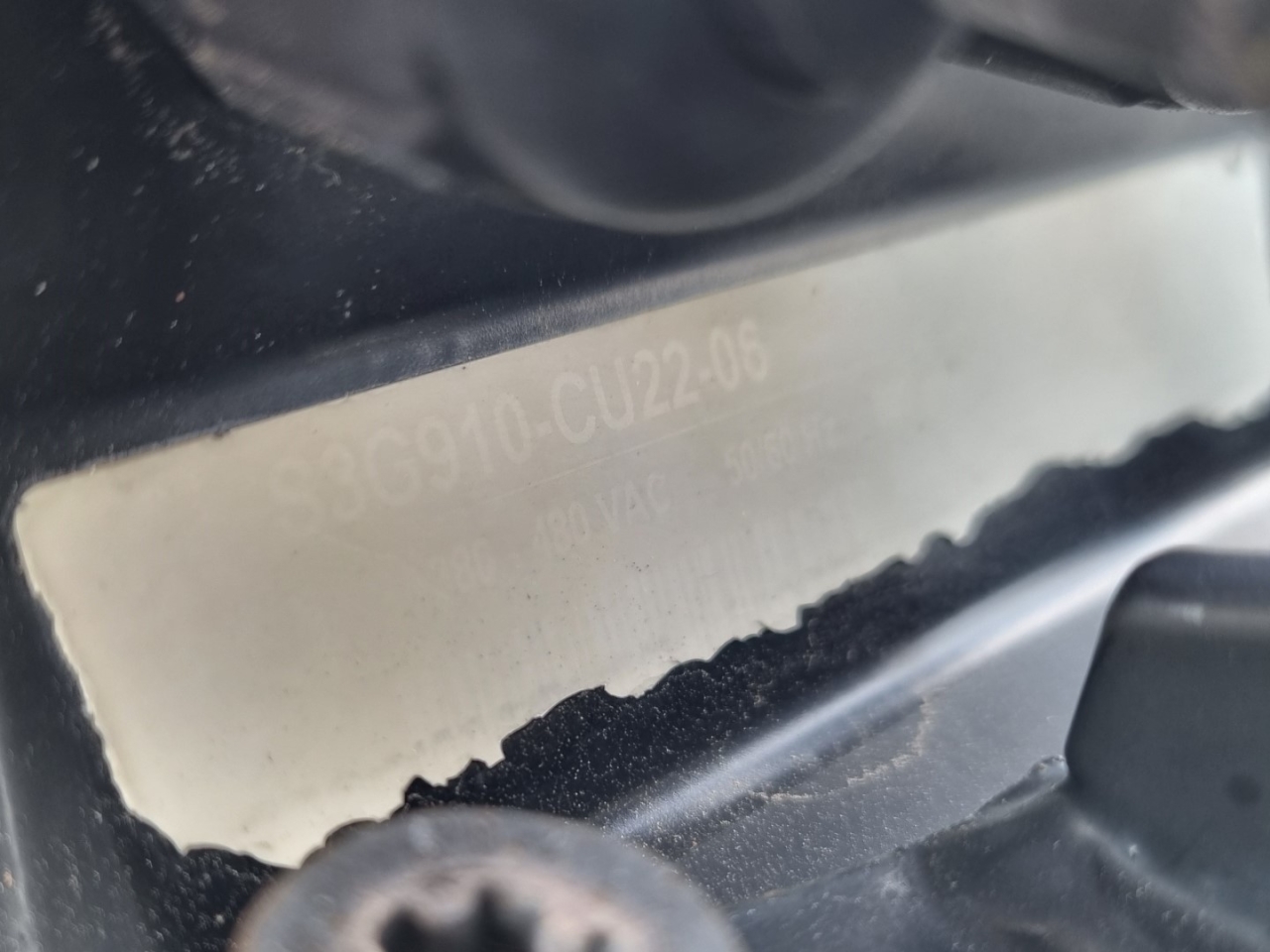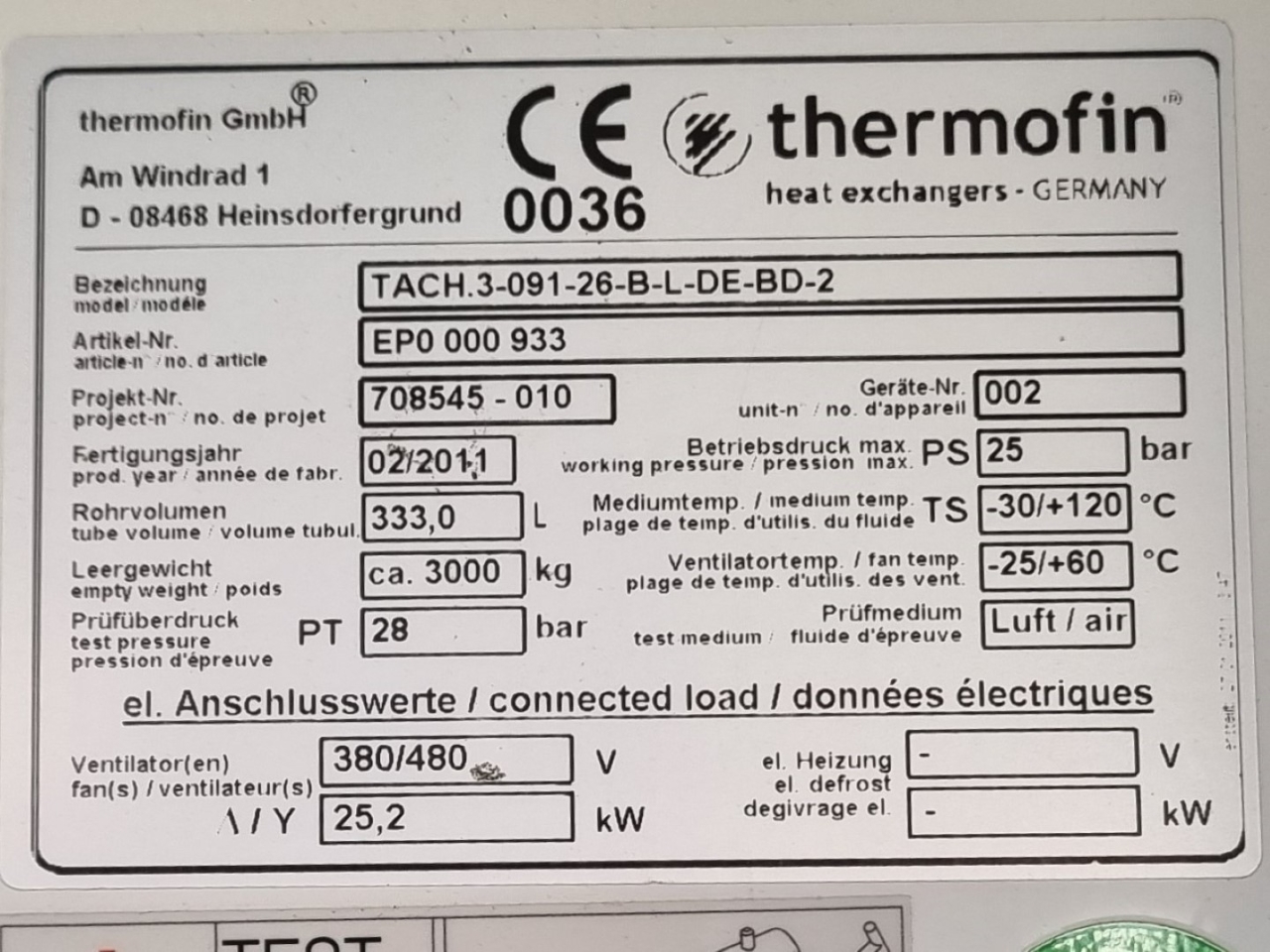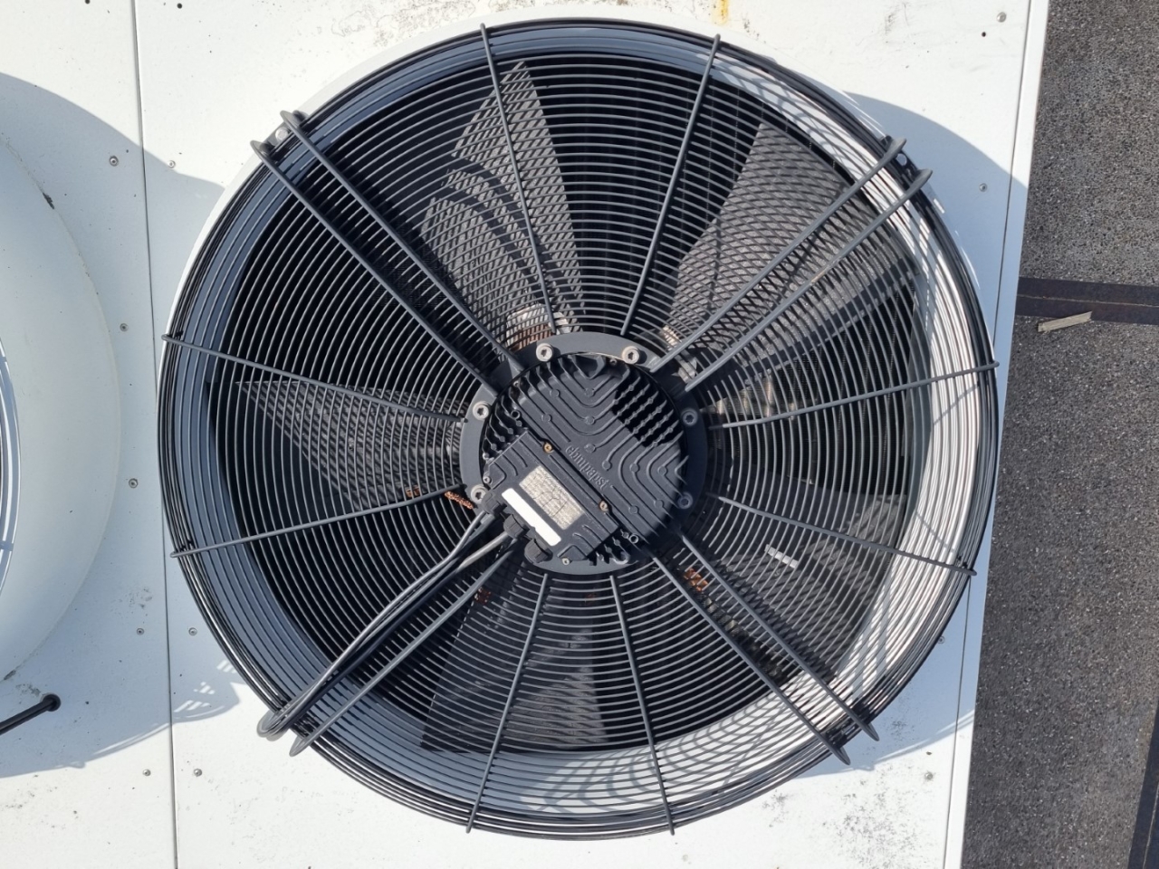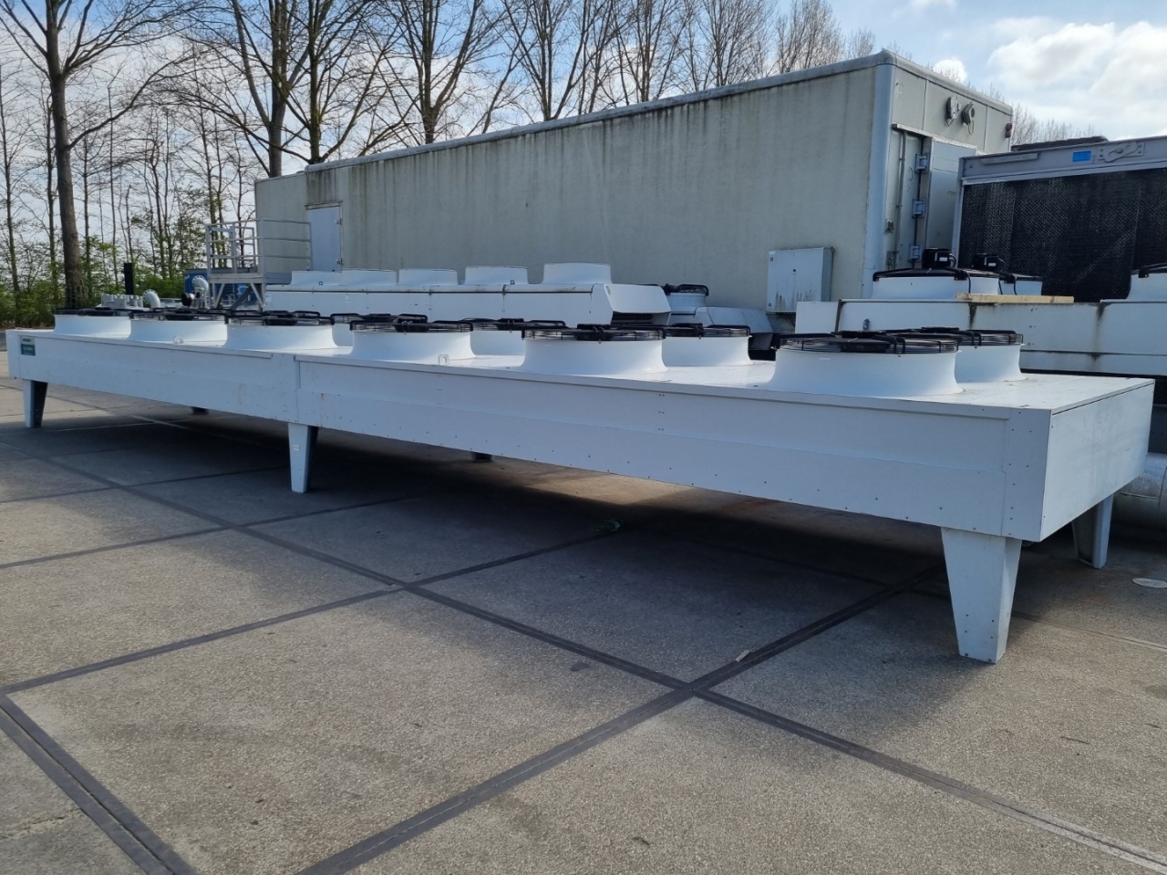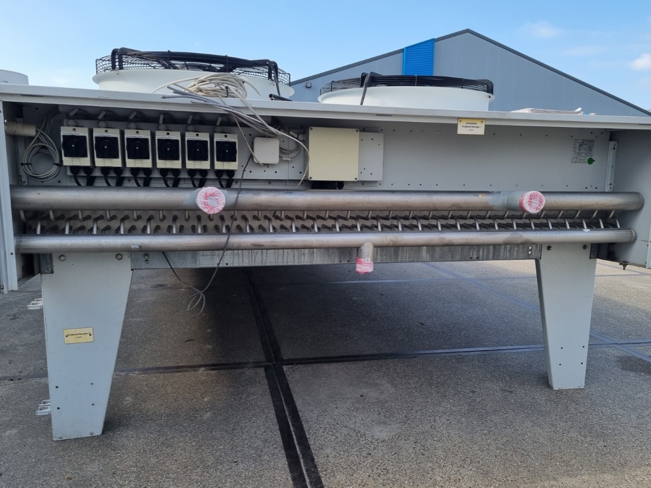 Gebruikte Thermofin TACH.3-091-26-B-L-DE-BD-2 luchtgekoelde condensor op NH3 (ammoniak). Complete EBM-Papst S3G910-CU22-06 - 50/60 Hz - 2,1 kW - 885 tpm - diameter 910 mm en een totale luchtstroom van 246.000 m³/u.