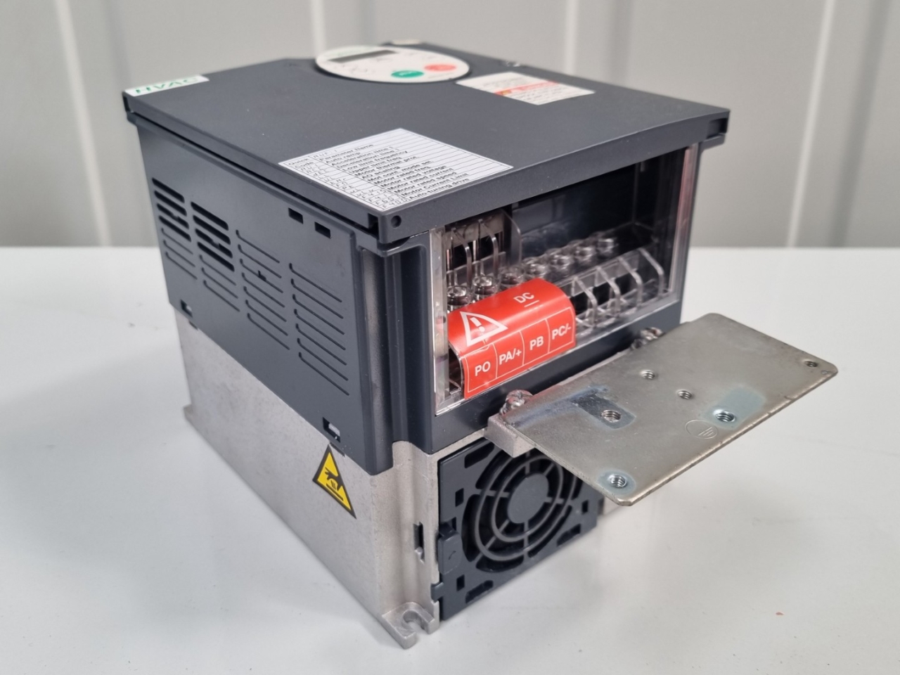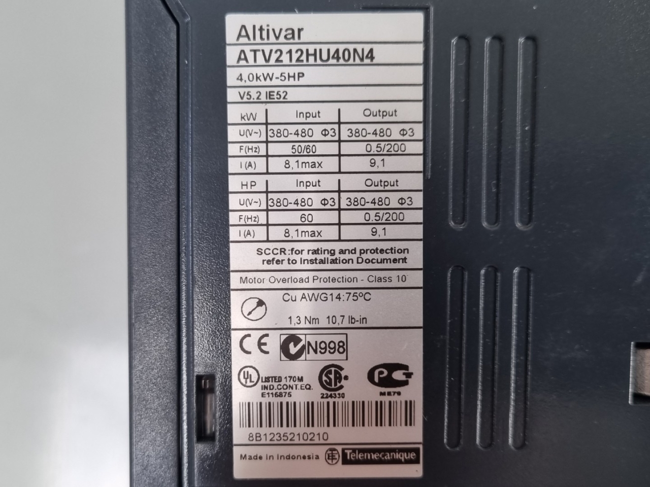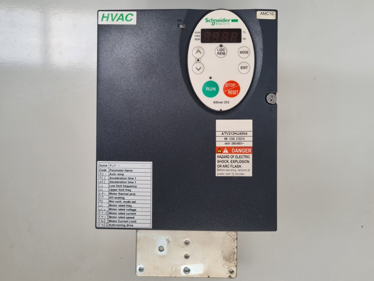 Gebruikte Schneider Electric/Telemecanique Altivar ATV212HU40N4 frequentieregelaar. Geschikt voor 4 kW/5 pk, 3-fase 380-480 V. Gedeïnstalleerd van een Lennox NAC 300D NM4M chiller.