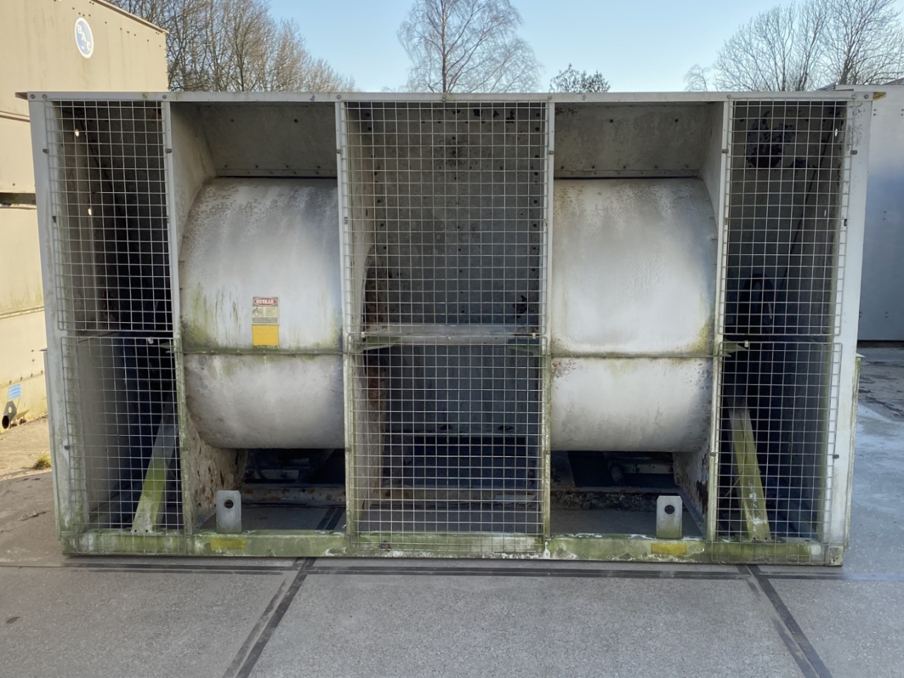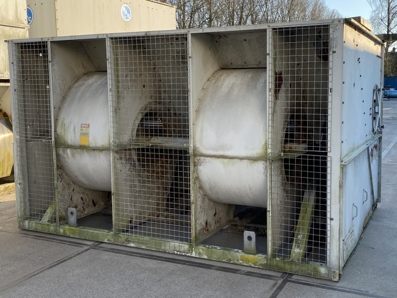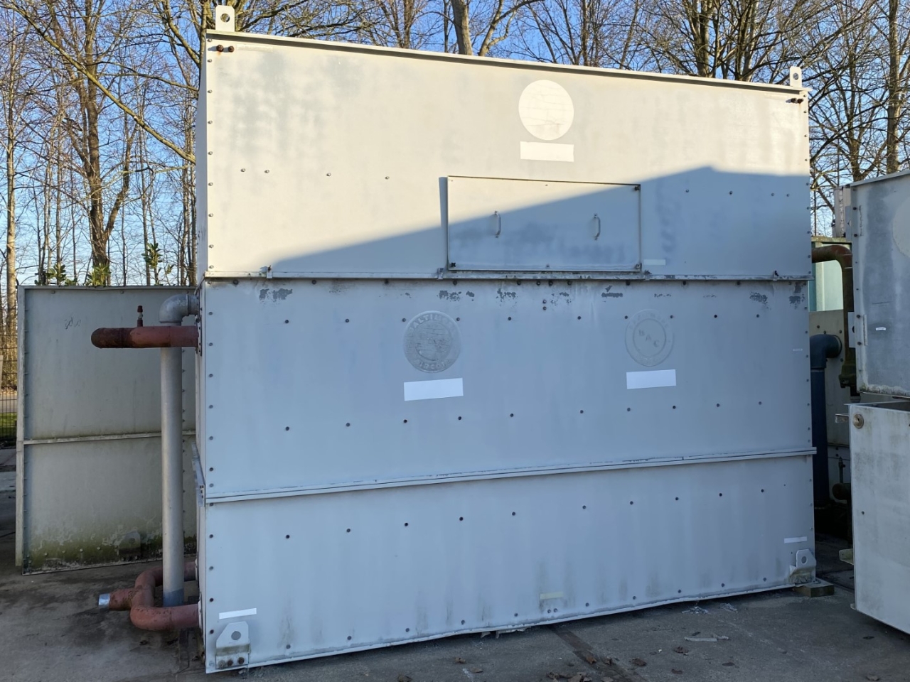 Gebruikte Baltimore VXC N275 verdampercondensor op Freon/NH3. Compleet met 2 centrifugaalventilatoren met een luchtstroom van 79.920 m³/u en een waterpomp.